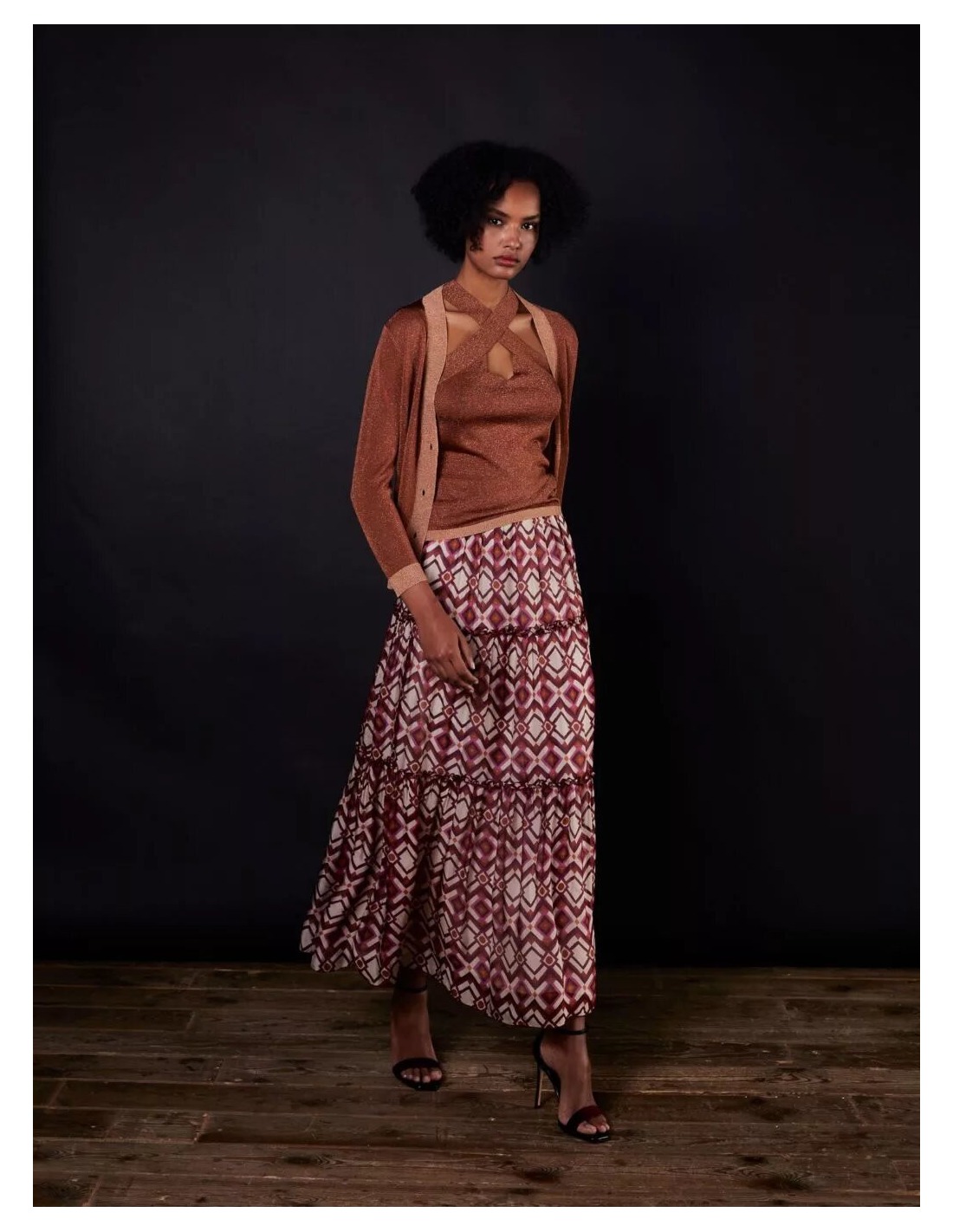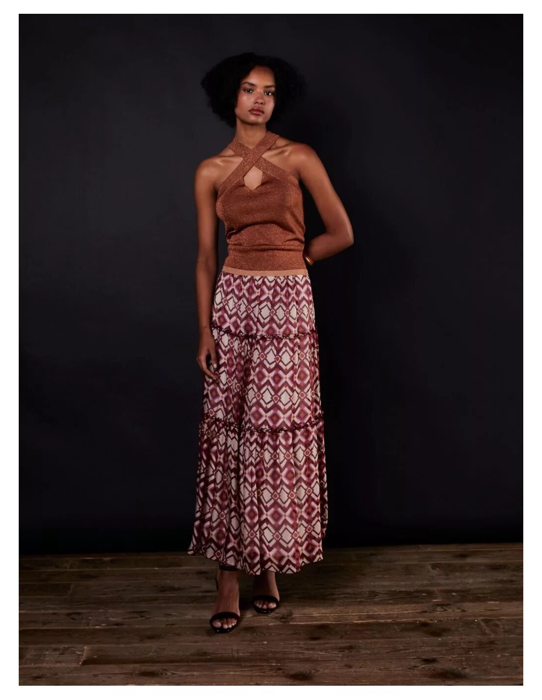 Top de lurex cobre con tirante cruzado al cuello.