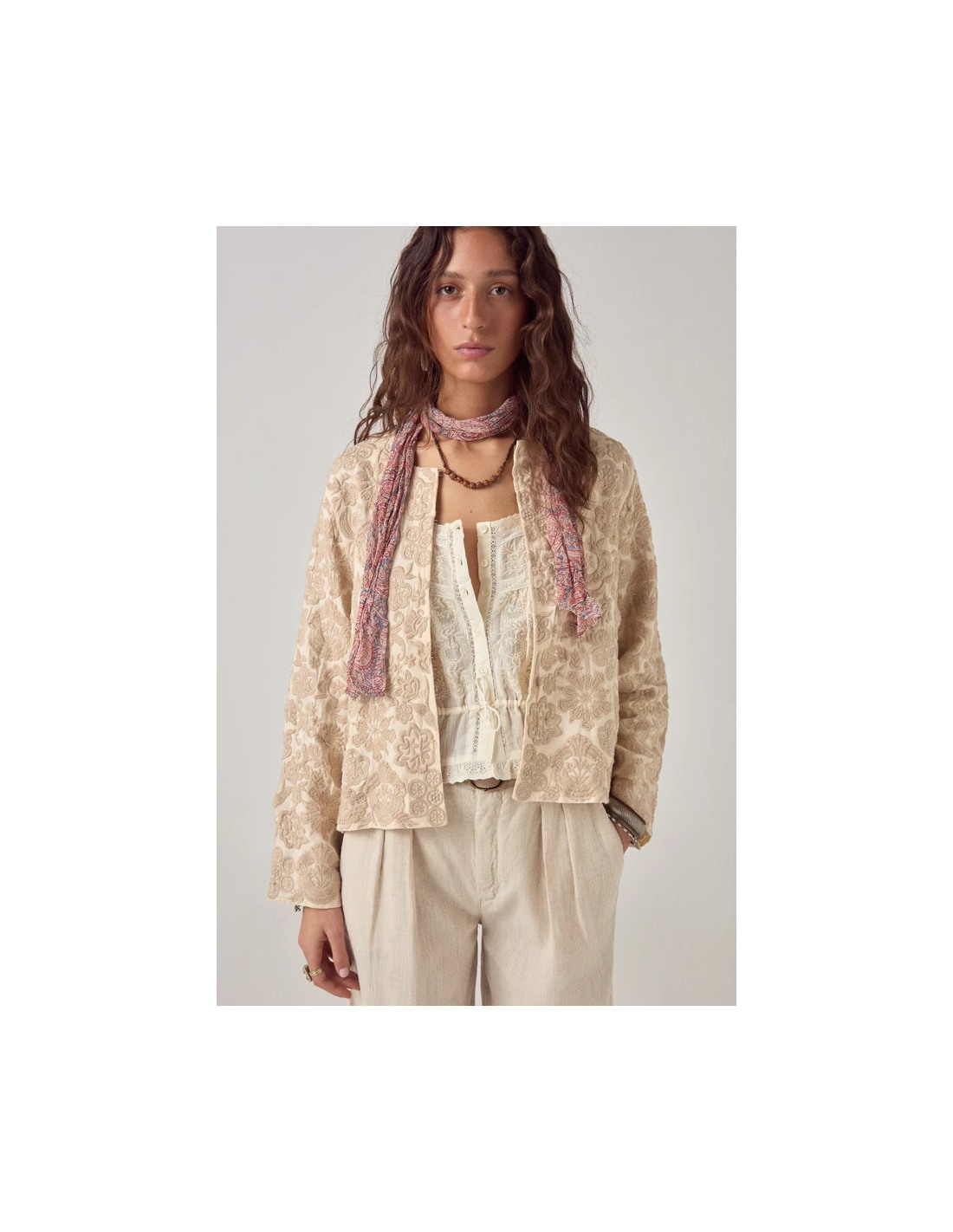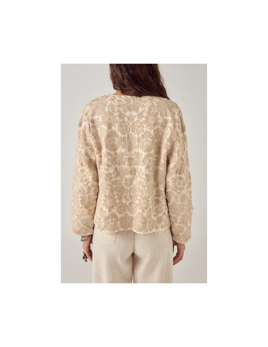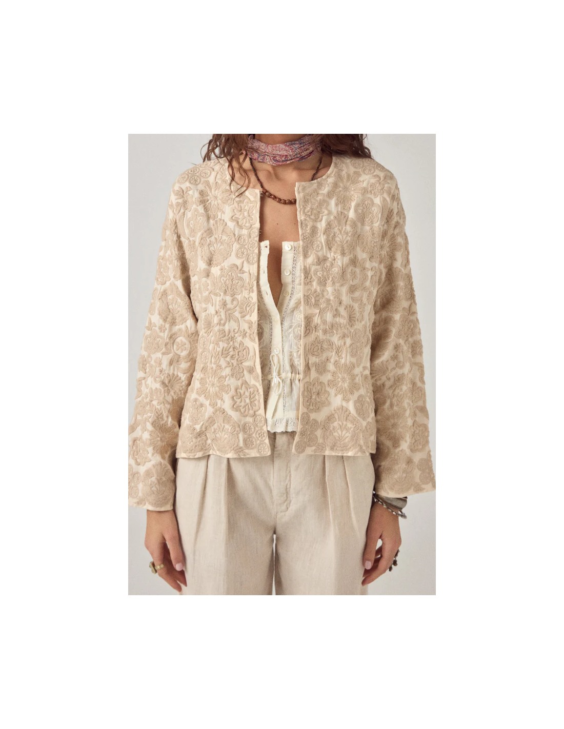 Chaqueta de frente abierto recortada en algodón marfil, totalmente bordada en hilos tonales: arena caliente, tiza, lino pálido. El bordado está elevado, casi en forma de relieve, cubriendo toda la superficie. La misma estructura que el trabajo que desaparece en sí mismo: ves la textura antes de ver el patrón.