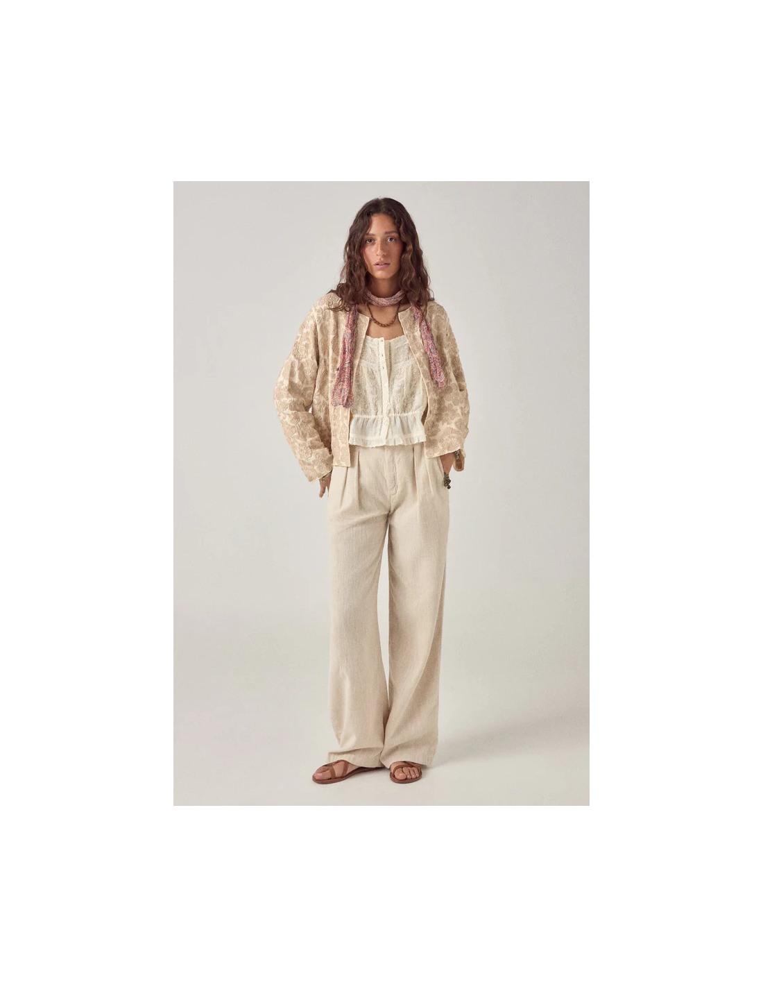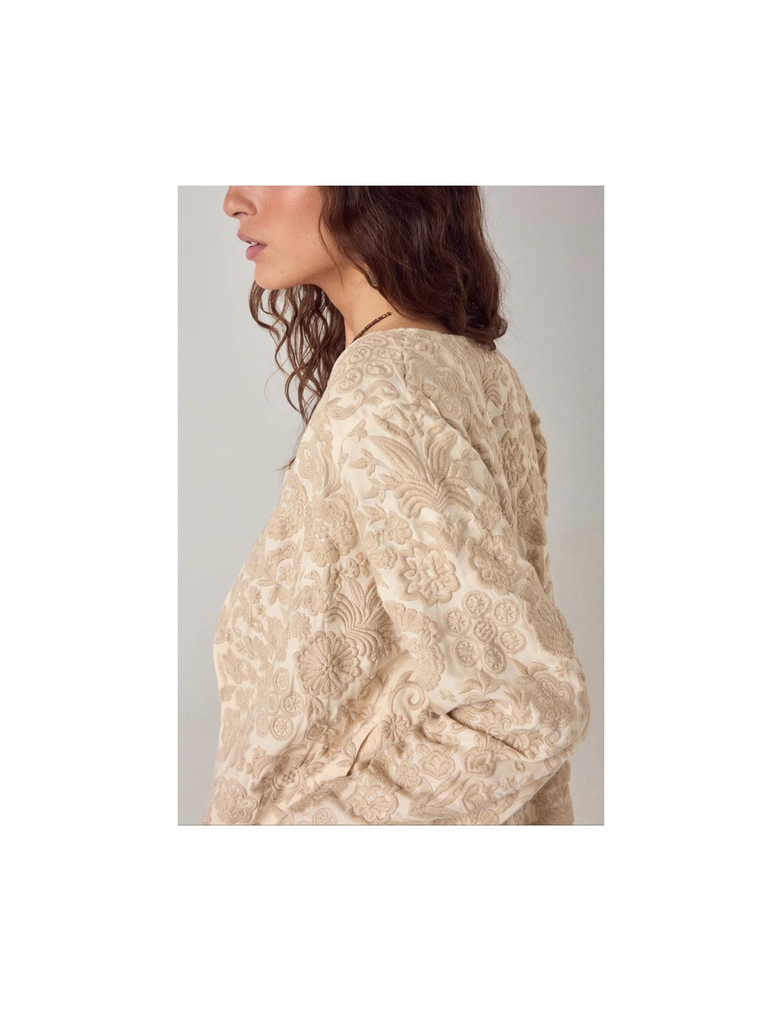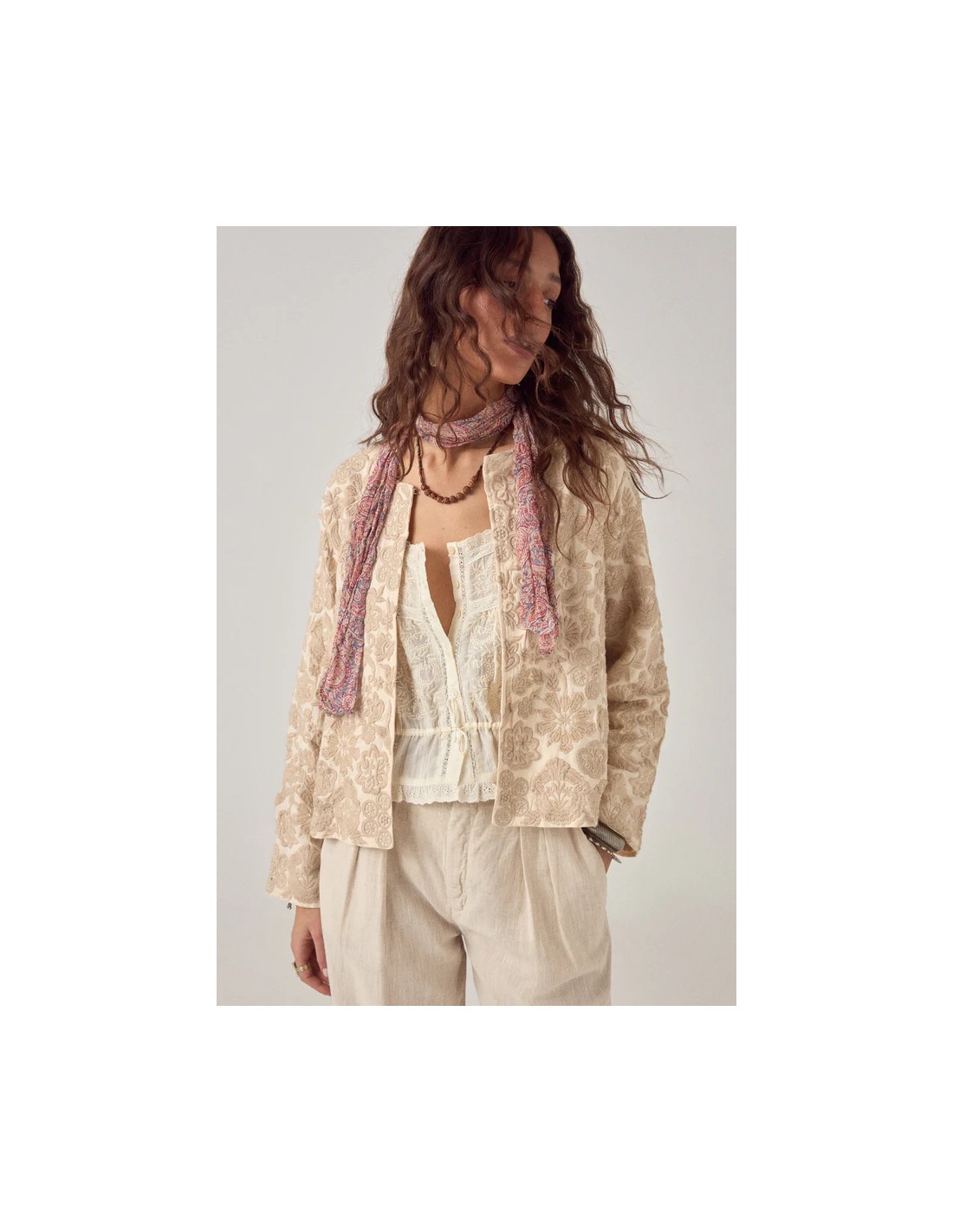 Chaqueta de frente abierto recortada en algodón marfil, totalmente bordada en hilos tonales: arena caliente, tiza, lino pálido. El bordado está elevado, casi en forma de relieve, cubriendo toda la superficie. La misma estructura que el trabajo que desaparece en sí mismo: ves la textura antes de ver el patrón.