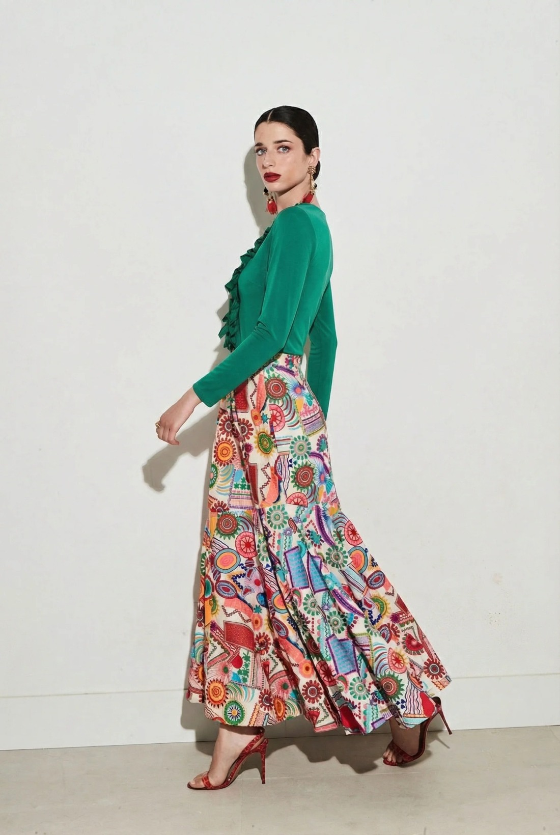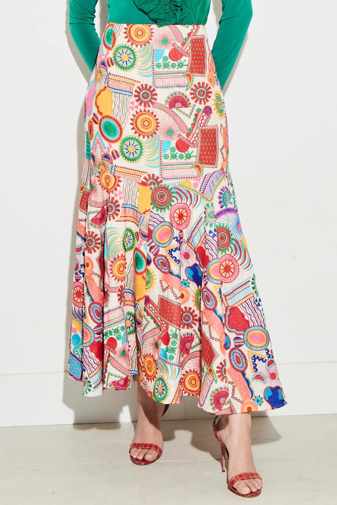 Falda bordada de silueta evasé con cintura alta y caída fluida. Estampado multicolor de inspiración artística sobre fondo claro. Cierre mediante cremallera invisible.