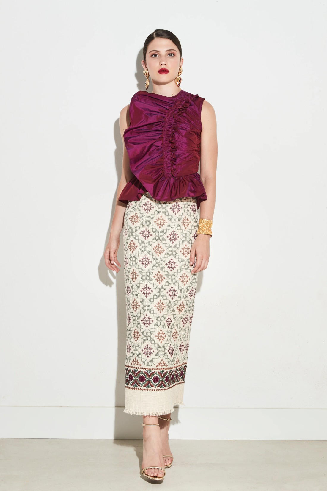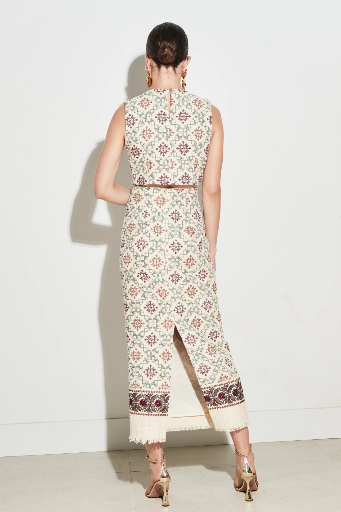 Falda en tejido rústico con bordado en punto de cruz. Tono crudo con estampado geométrico en tonos rosados y verdes. Cierre mediante cremallera invisible.
