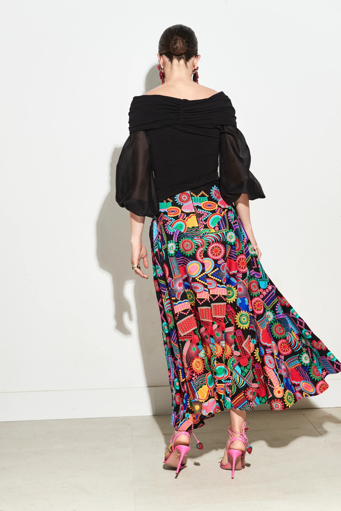 Falda bordada de silueta evasé con cintura alta y caída fluida. Estampado multicolor de inspiración artística sobre fondo negro. Cierre mediante cremallera invisible. Esta falda no cuenta con bolsillos.