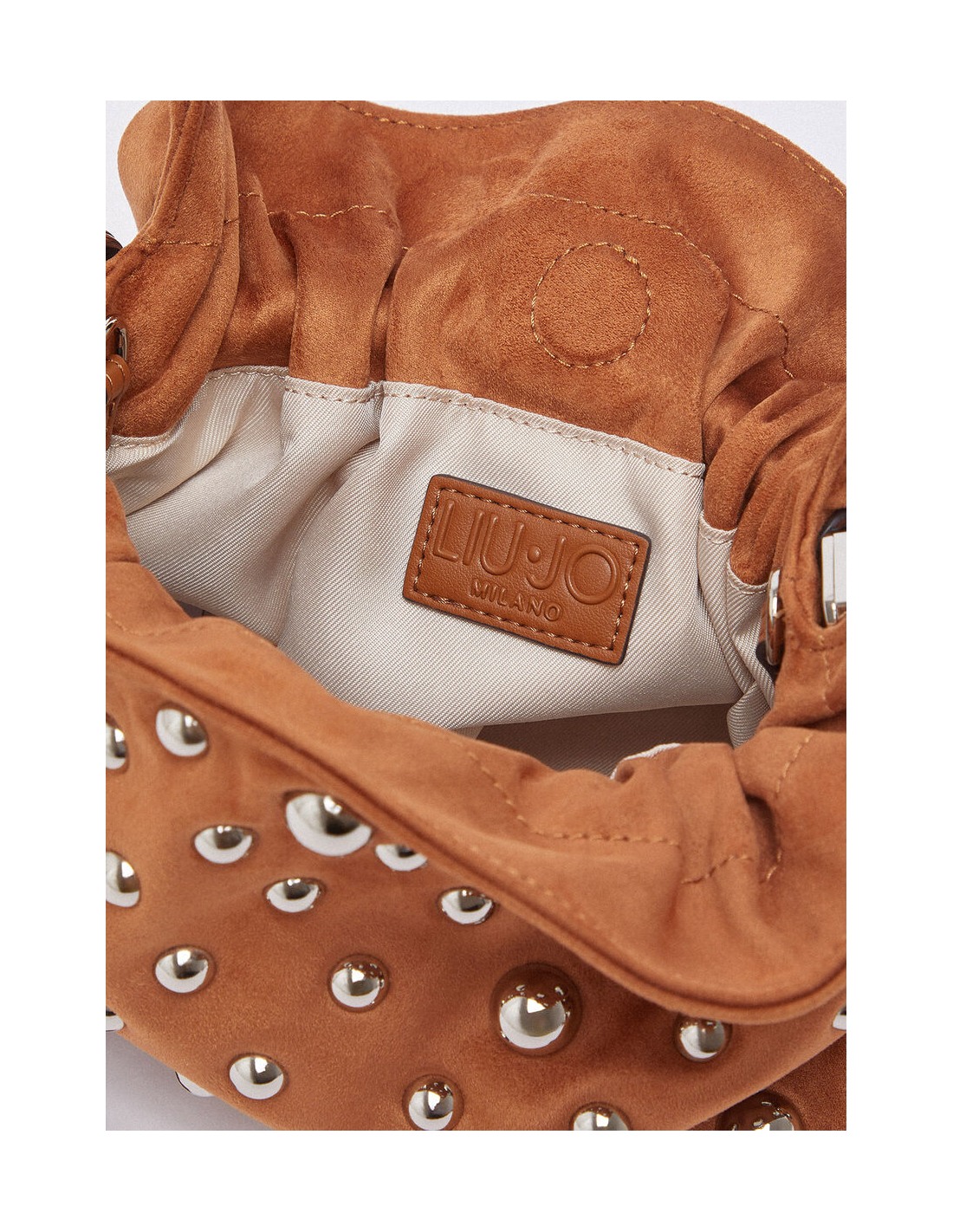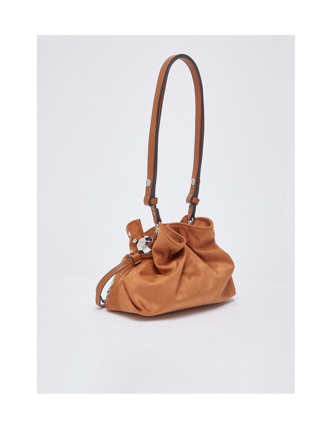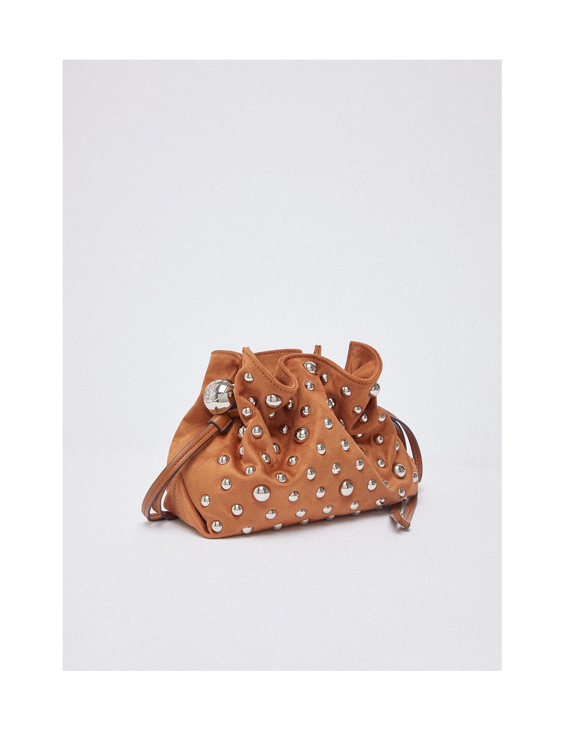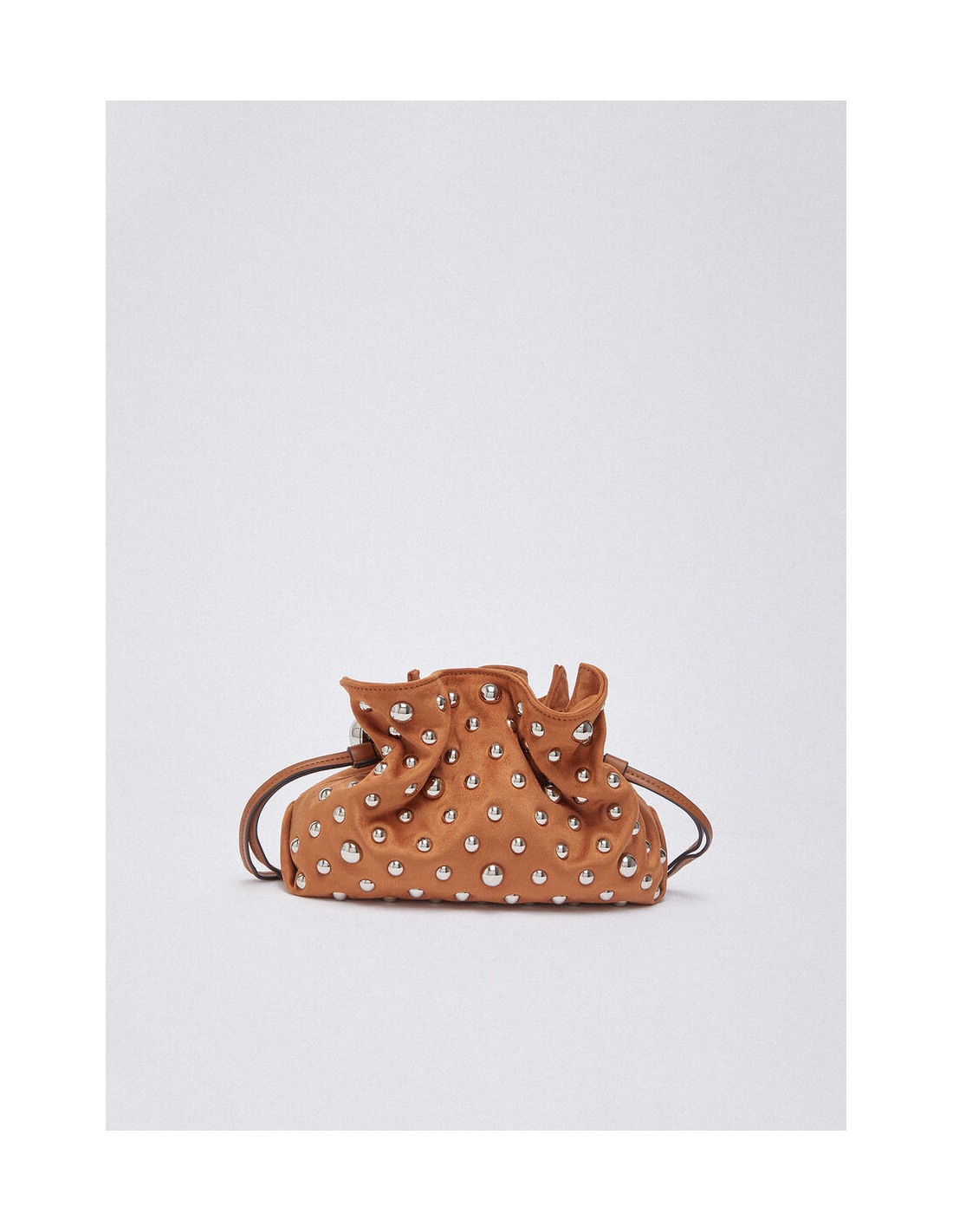 La Riccy Bag suma una nueva dimensión a su carácter gracias a una superficie suave, aterciopelada y muy táctil. Su volumen fluido se recoge con el cordón, mientras las tachuelas all-over crean un ritmo metálico que vibra sobre la textura mullida.