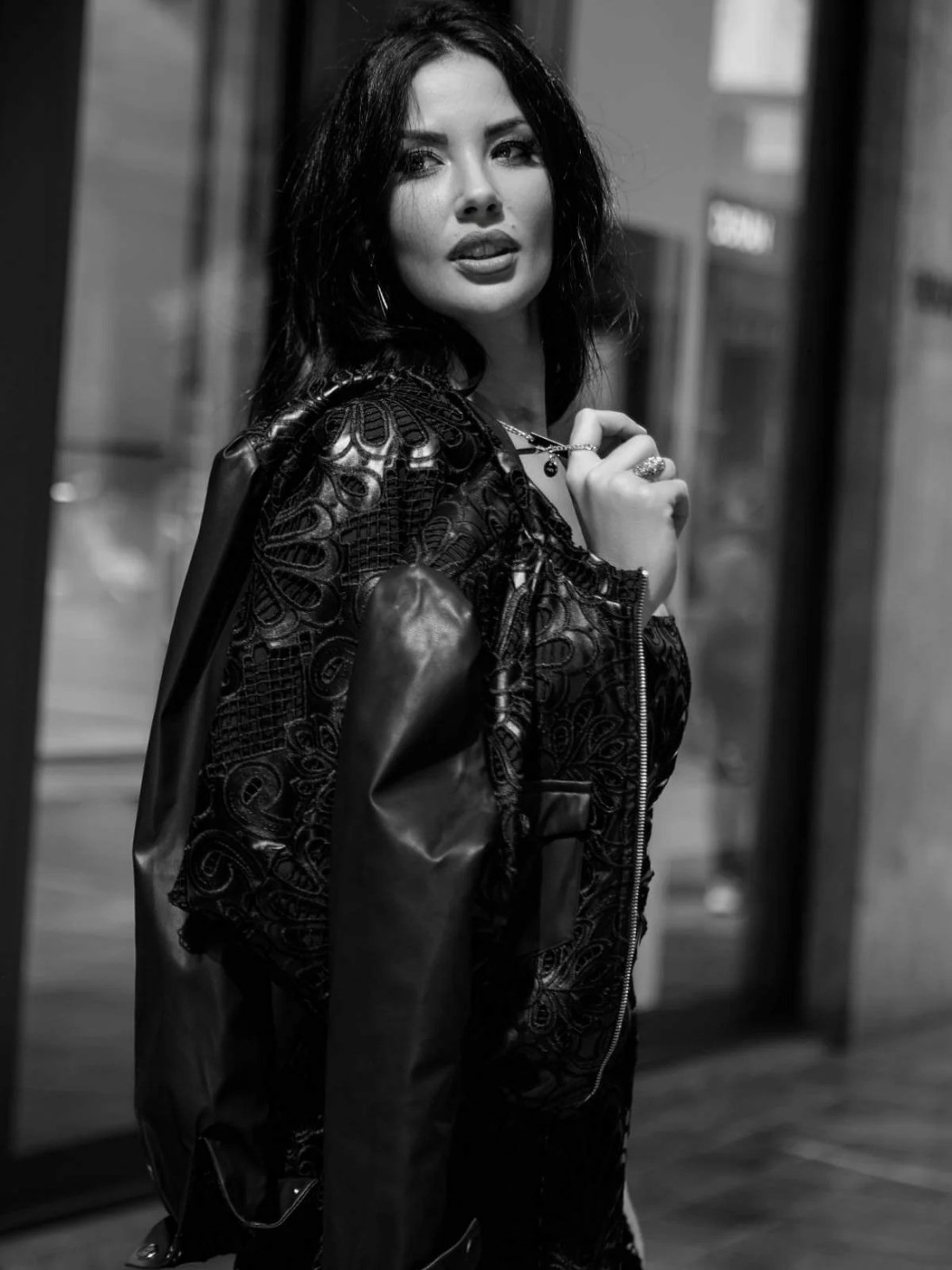 Cazadora de ecopiel negra corta, de manga larga con cuello mao. Detalle de encaje de guipur parte delantera y trasera. Dos bolsillos delanteros. Cierre central de cremallera en dorado.