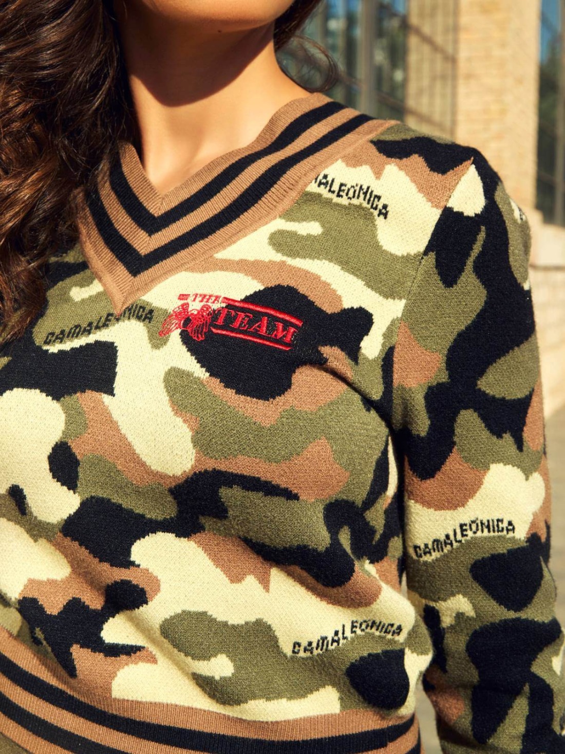 Jersey corto de punto estampado de camuflaje, manga larga y escote en pico. Bordado del logo en rojo de Camaleónica.