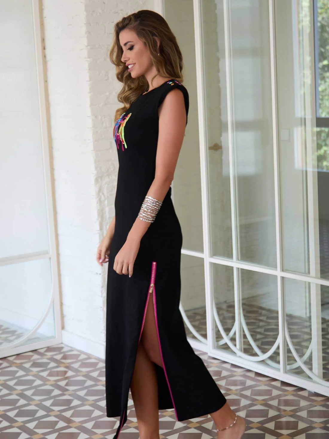 Vestido largo negro recto, desmangado con hombreras decoradas con tallas multicolores y escote redondo. En la parte central del pecho lleva bordado de la marca también multicolor y los laterales del vestido tienen cremalleras doradas en fondo rosa flúor para poder llevar el vestido más abierto o más cerrado del bajo.