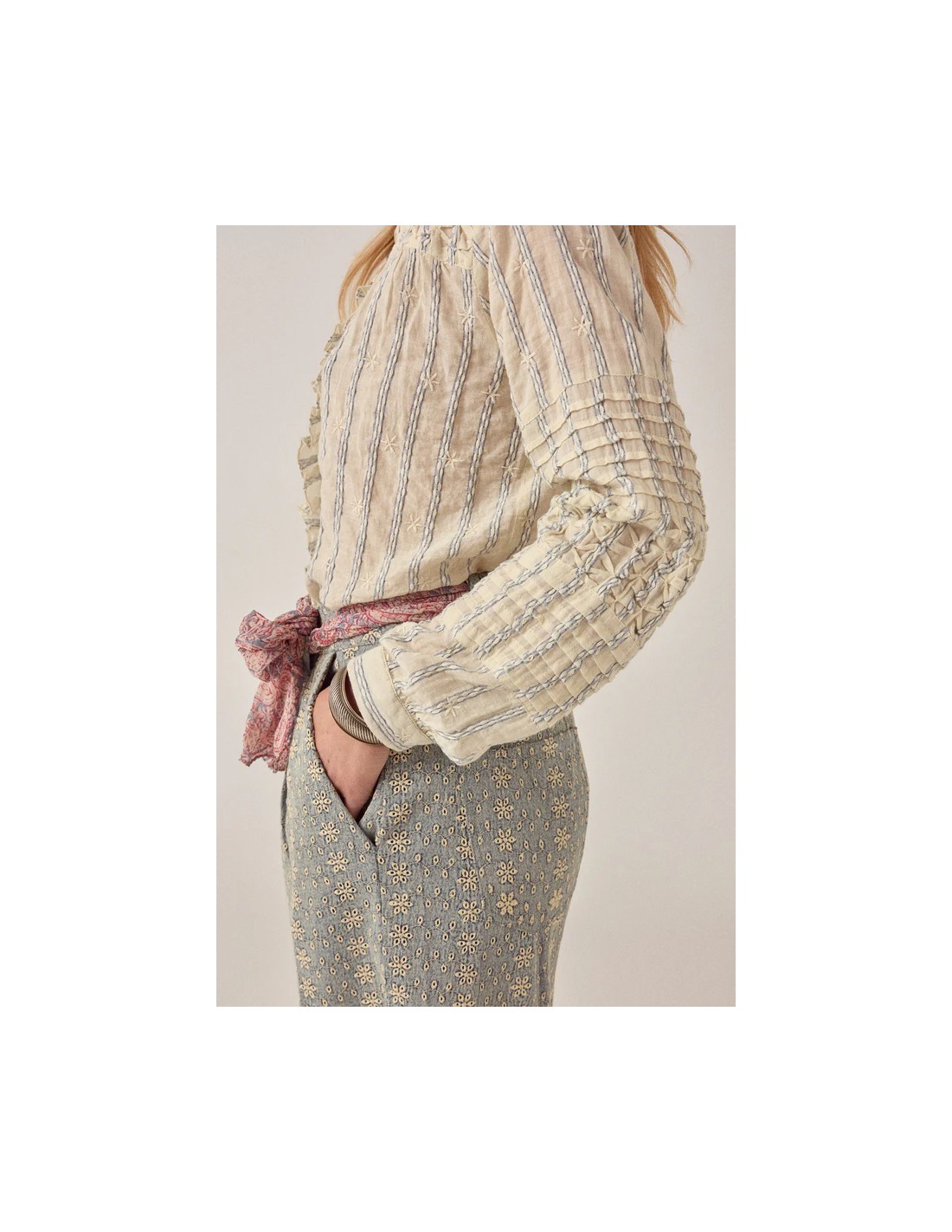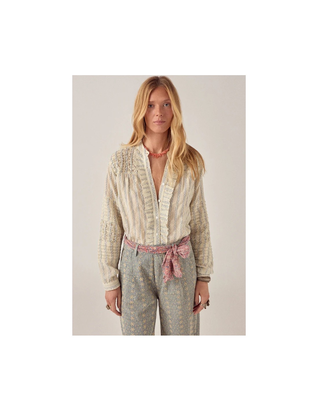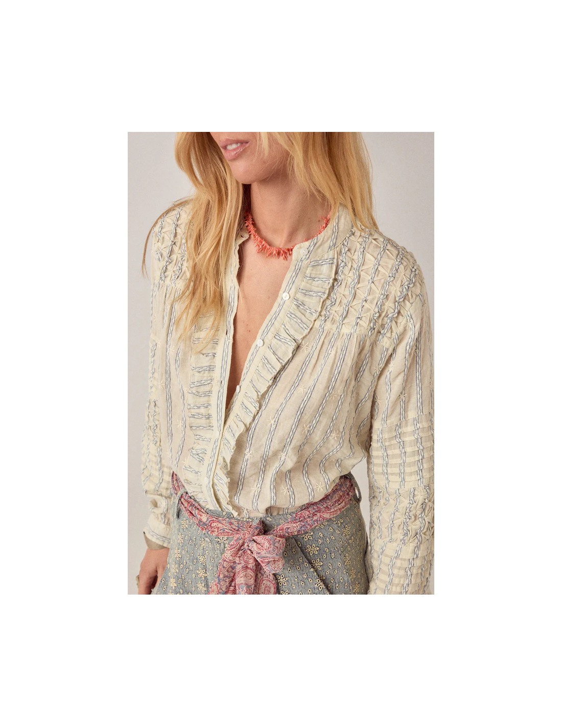 Blusa de manga larga en algodón. Frente con cuello, botón hacia abajo con volantes a lo largo de la línea del botón. Inserciones de encaje y costuras finas en todas partes. Mangas largas con volumen y facilidad. Ataque suelto y no forzado.