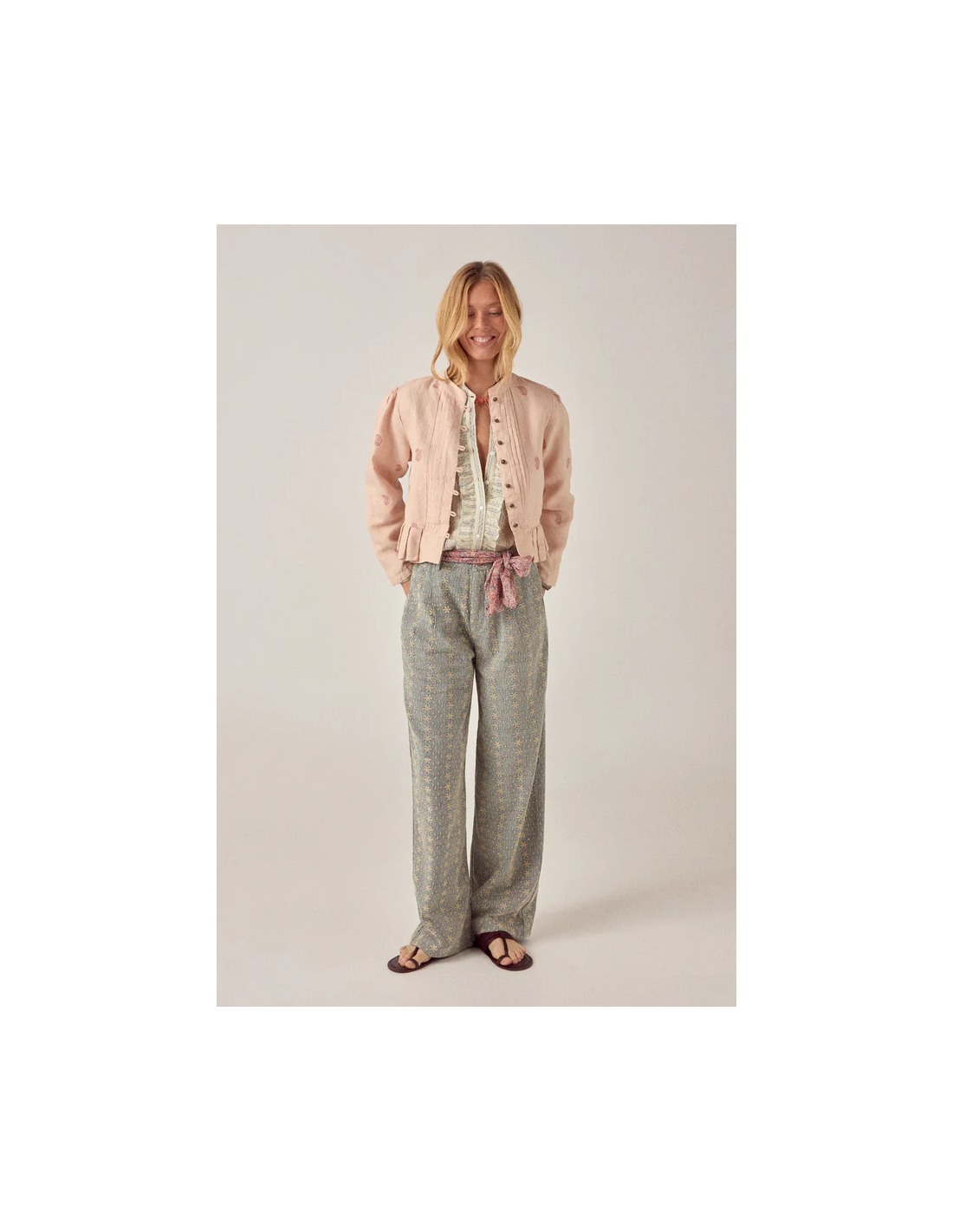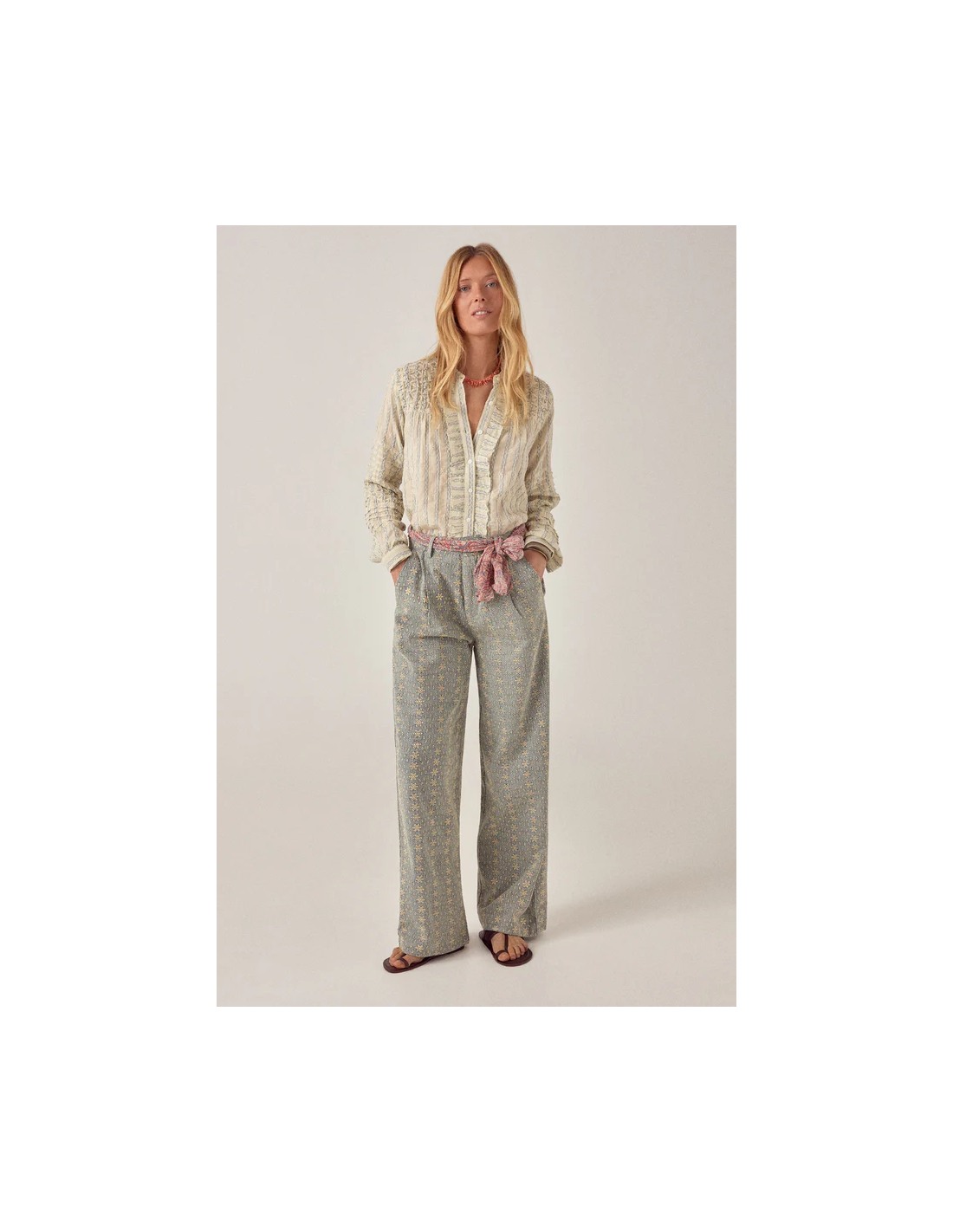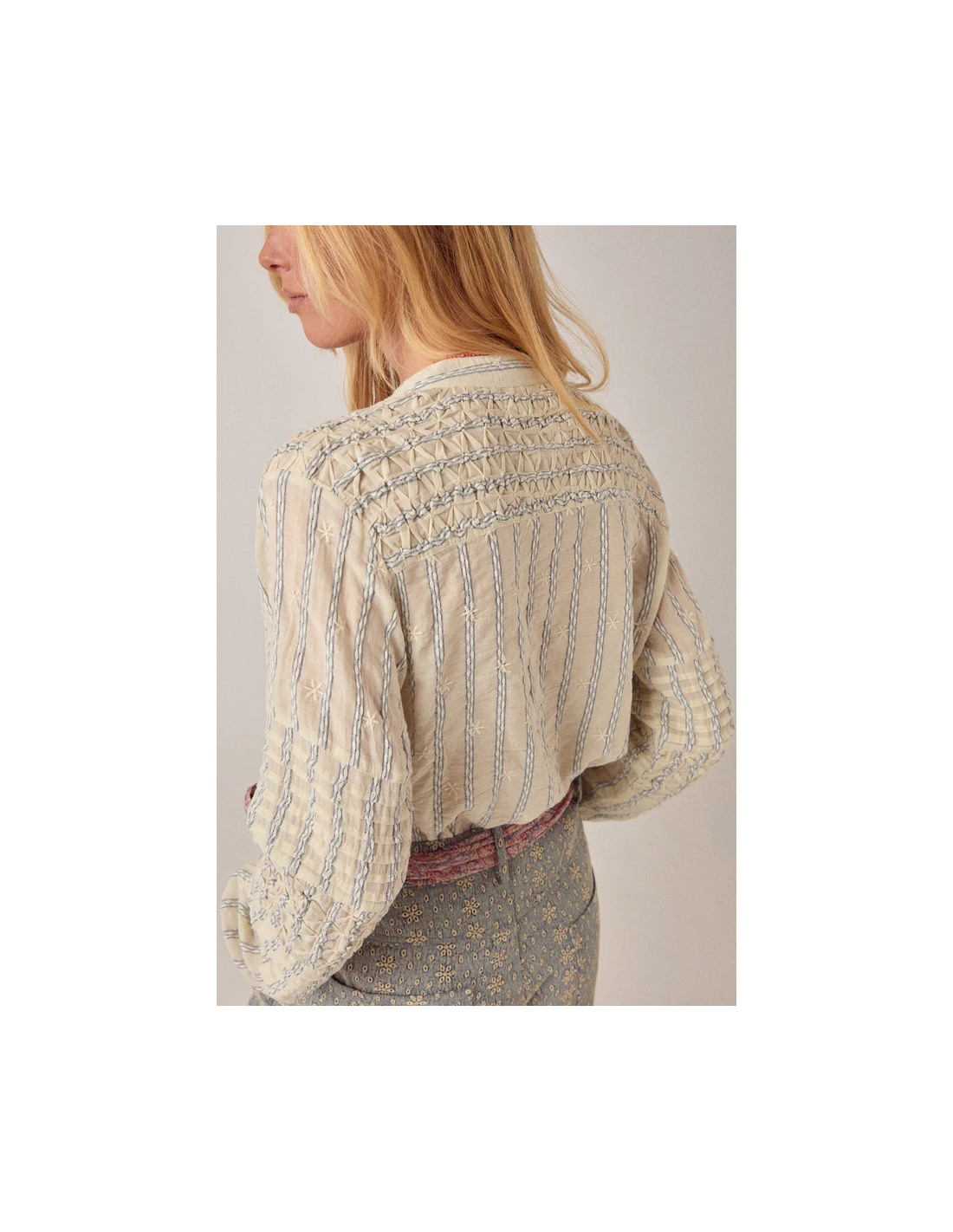 Blusa de manga larga en algodón. Frente con cuello, botón hacia abajo con volantes a lo largo de la línea del botón. Inserciones de encaje y costuras finas en todas partes. Mangas largas con volumen y facilidad. Ataque suelto y no forzado.