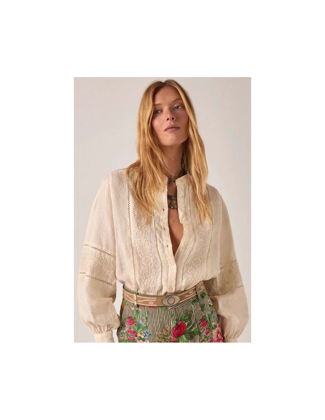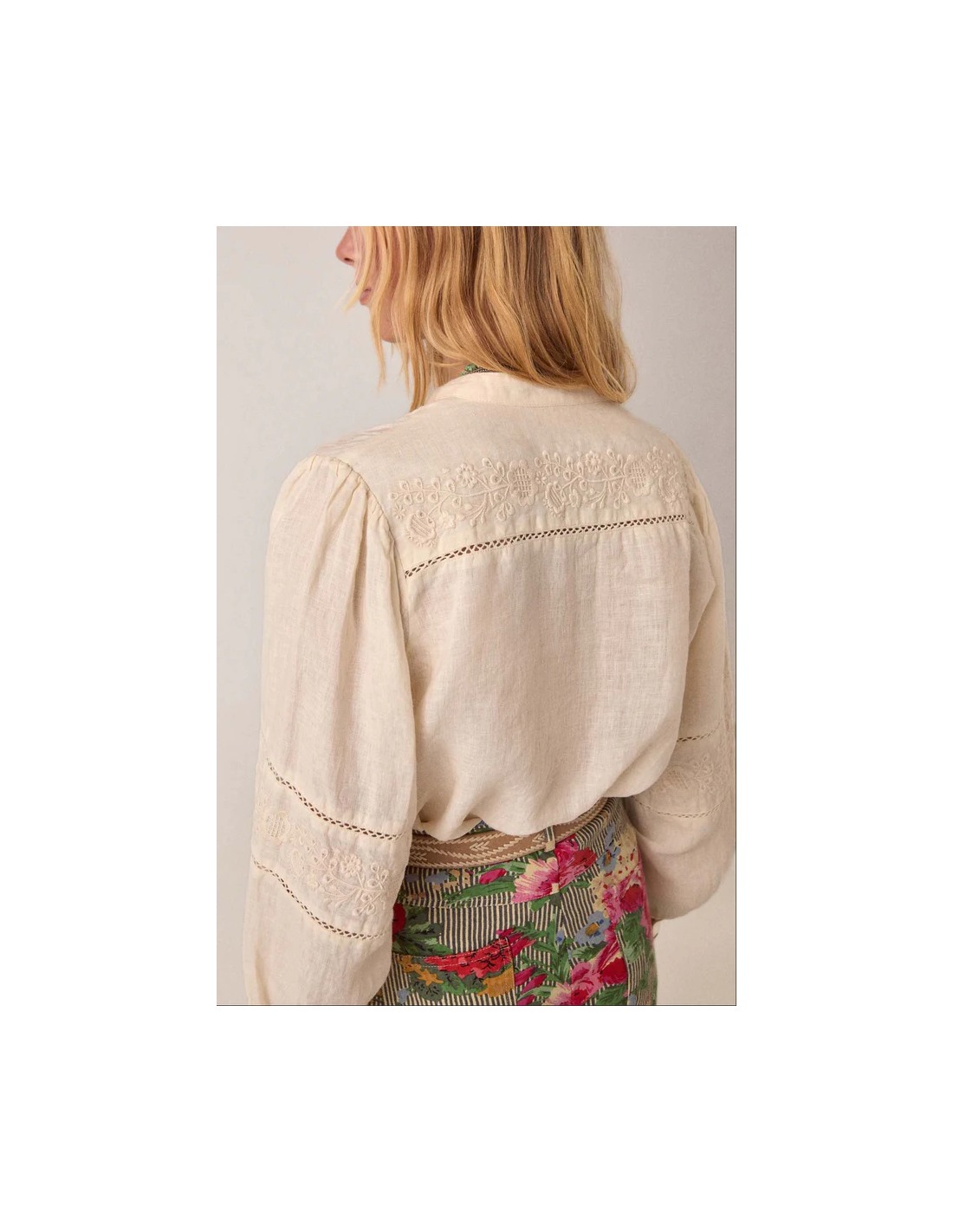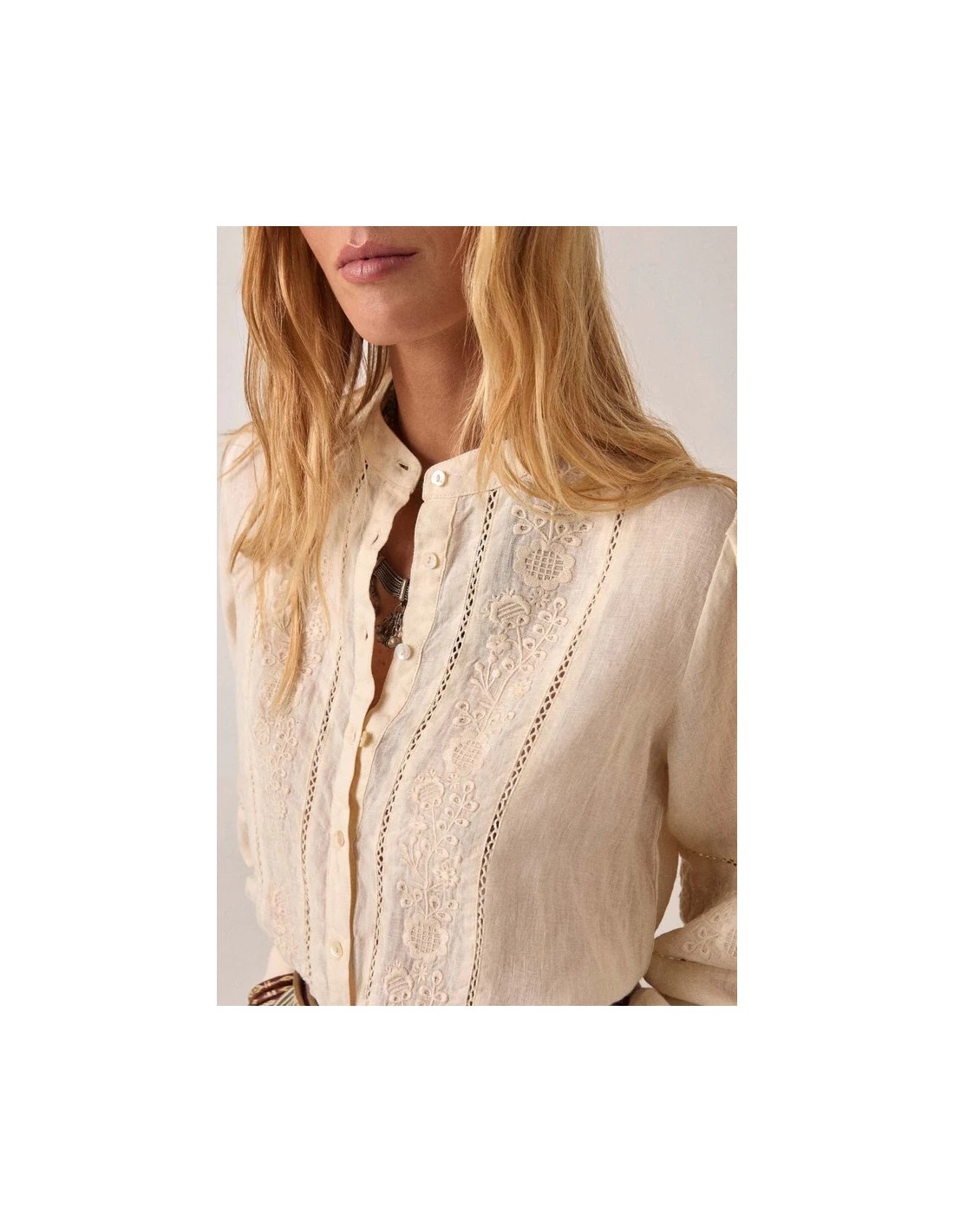 Blusa relajada en mezcla de algodón y lino con delicados detalles bordados. Cuello clásico, frente abotonado, manga larga con volumen suave. La textura natural transpirable y fresca de algodón y lino mejora con el desgaste.