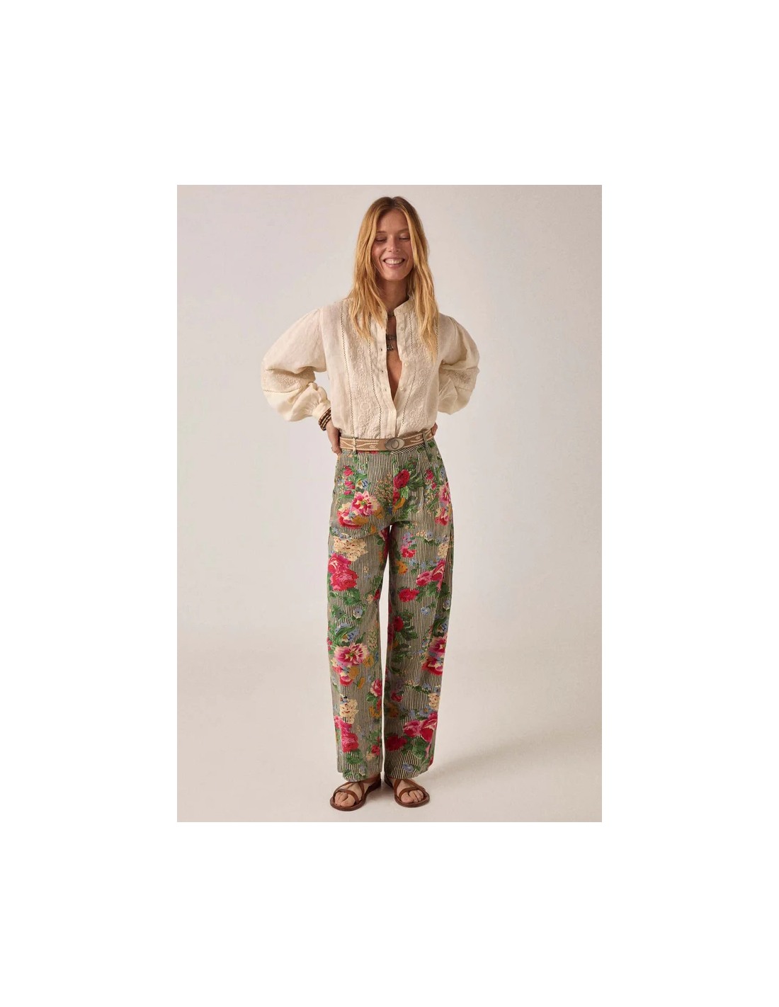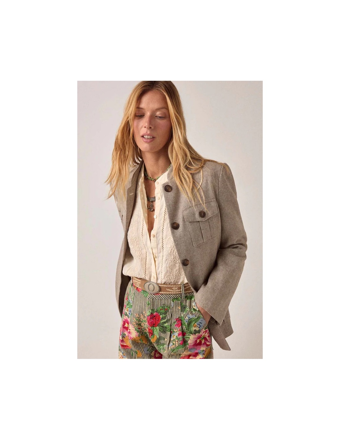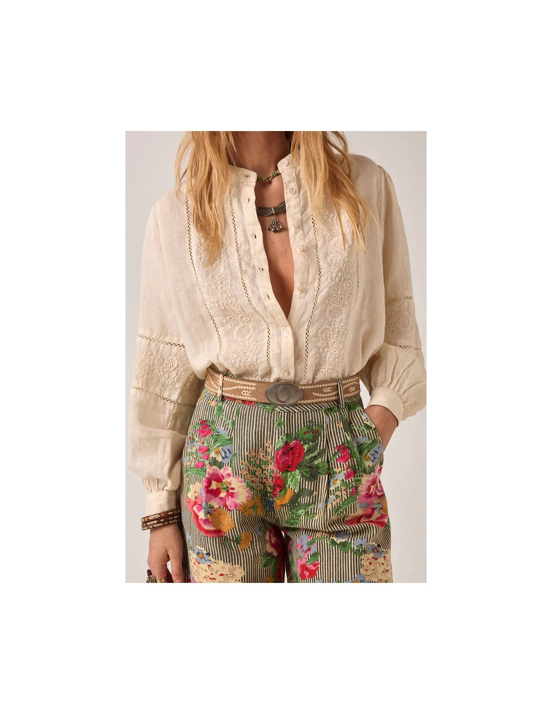 Blusa relajada en mezcla de algodón y lino con delicados detalles bordados. Cuello clásico, frente abotonado, manga larga con volumen suave. La textura natural transpirable y fresca de algodón y lino mejora con el desgaste.