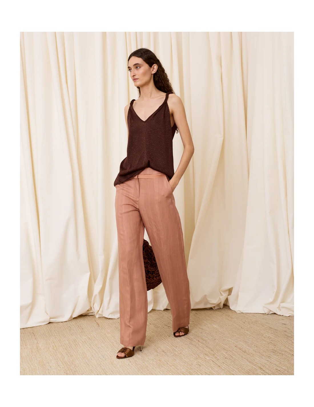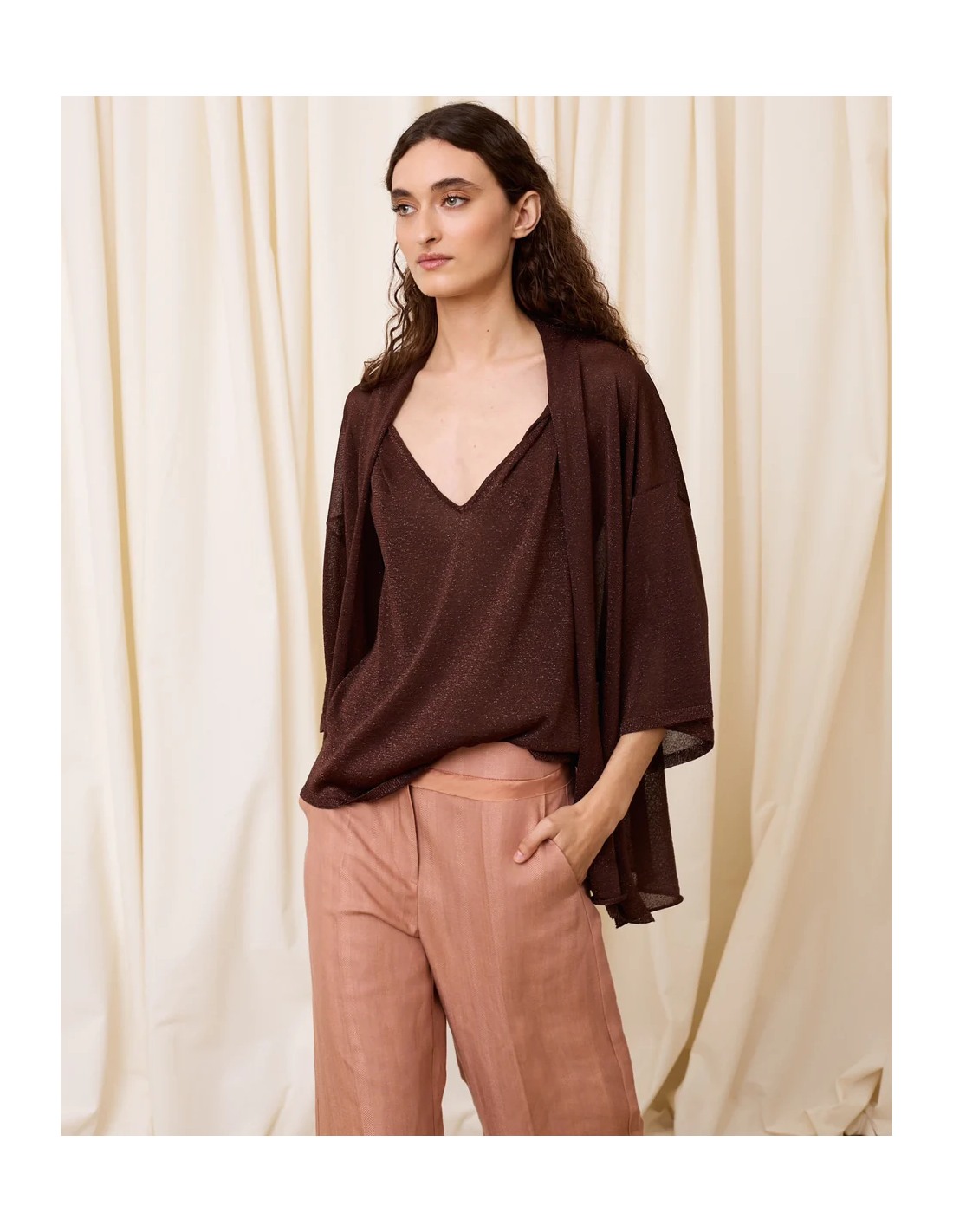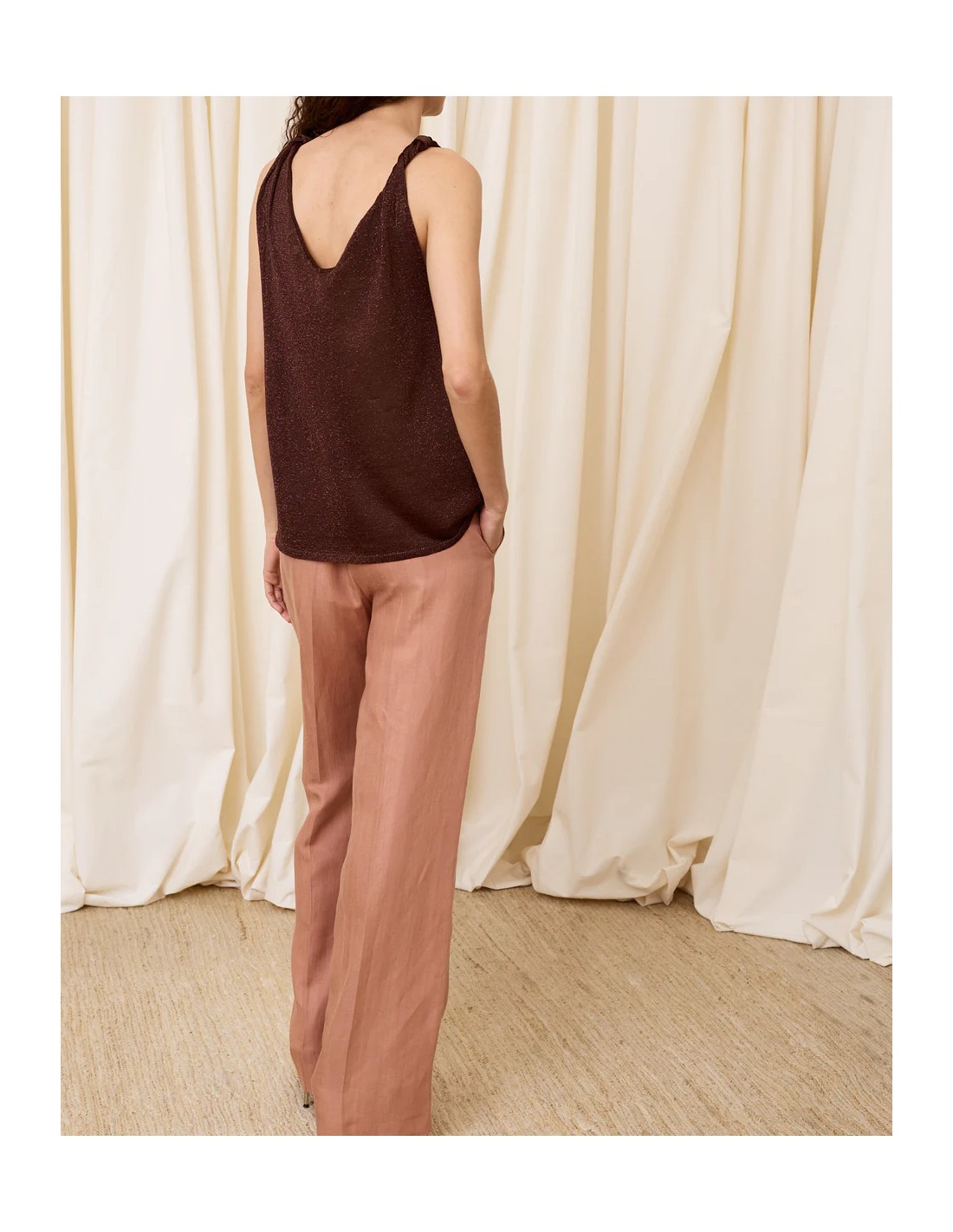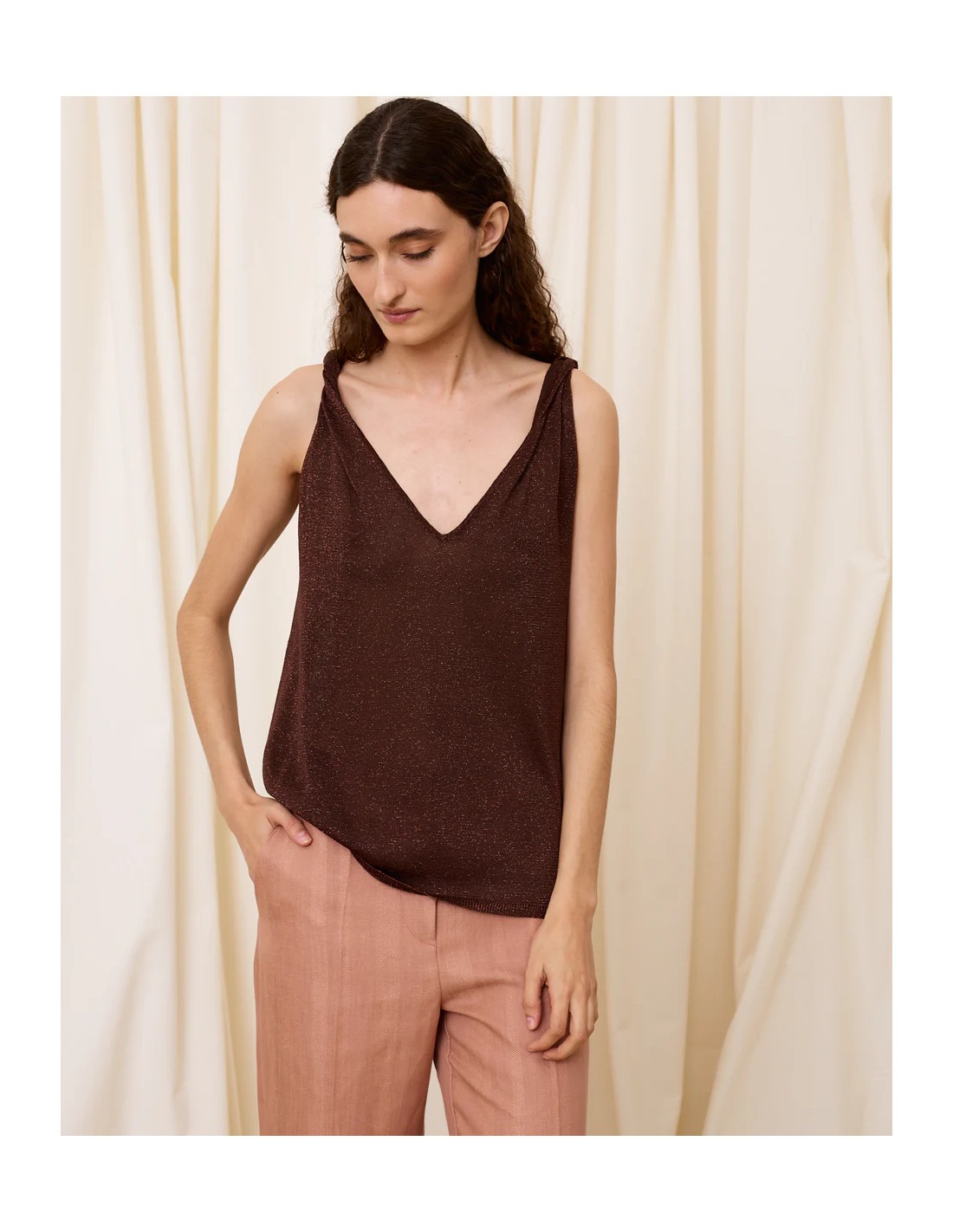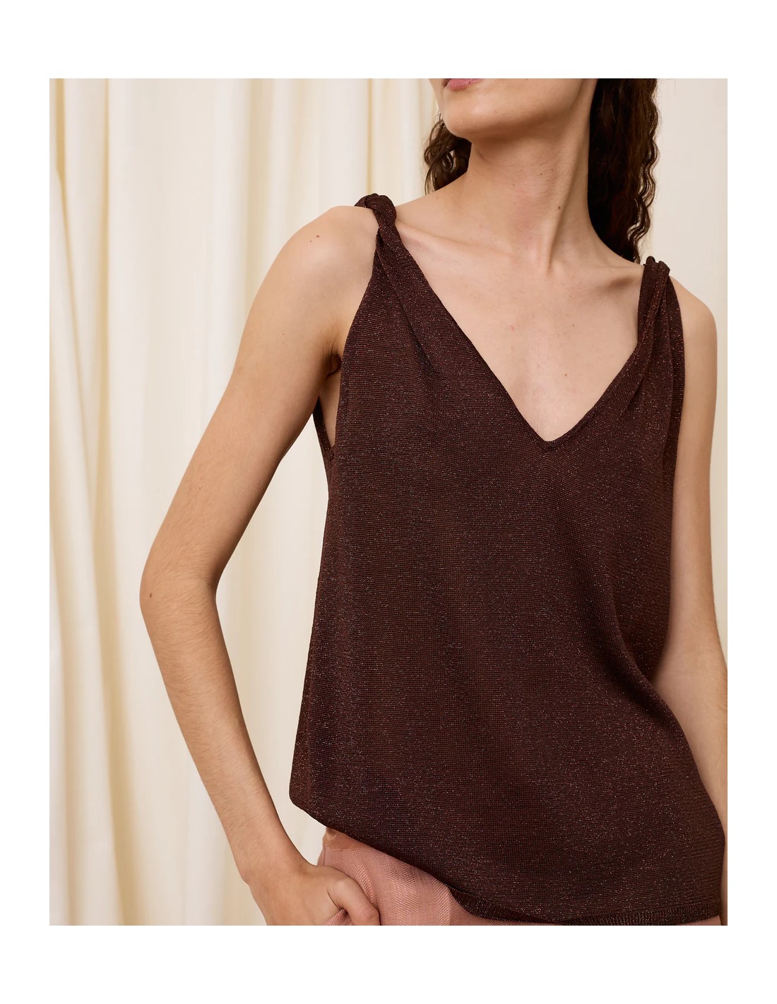 Top de escote pico en de tirantes con adorno de nudos en los hombros con fibra metalizada en color chocolate.