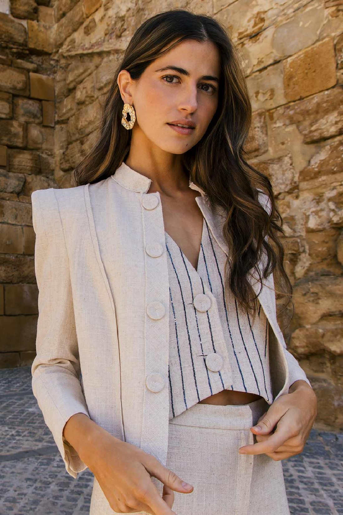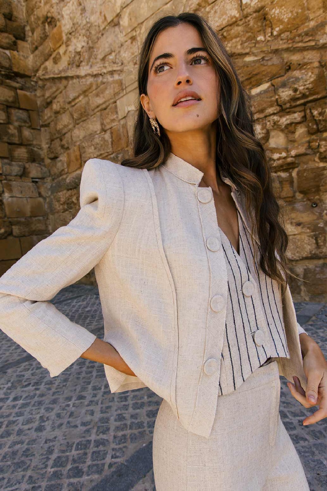 Chaqueta tipo torera en lino con diseño estructurado y largo a la cintura. Su patrón corto estiliza la figura y combina a la perfección con vestidos o pantalones de talle alto para eventos de día.