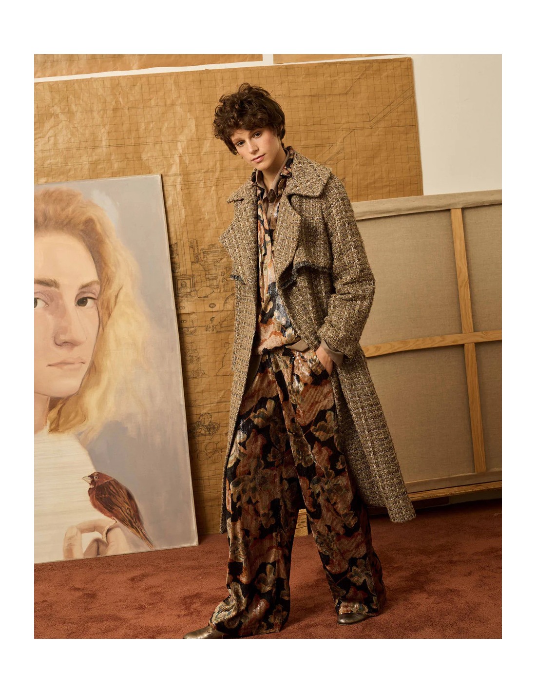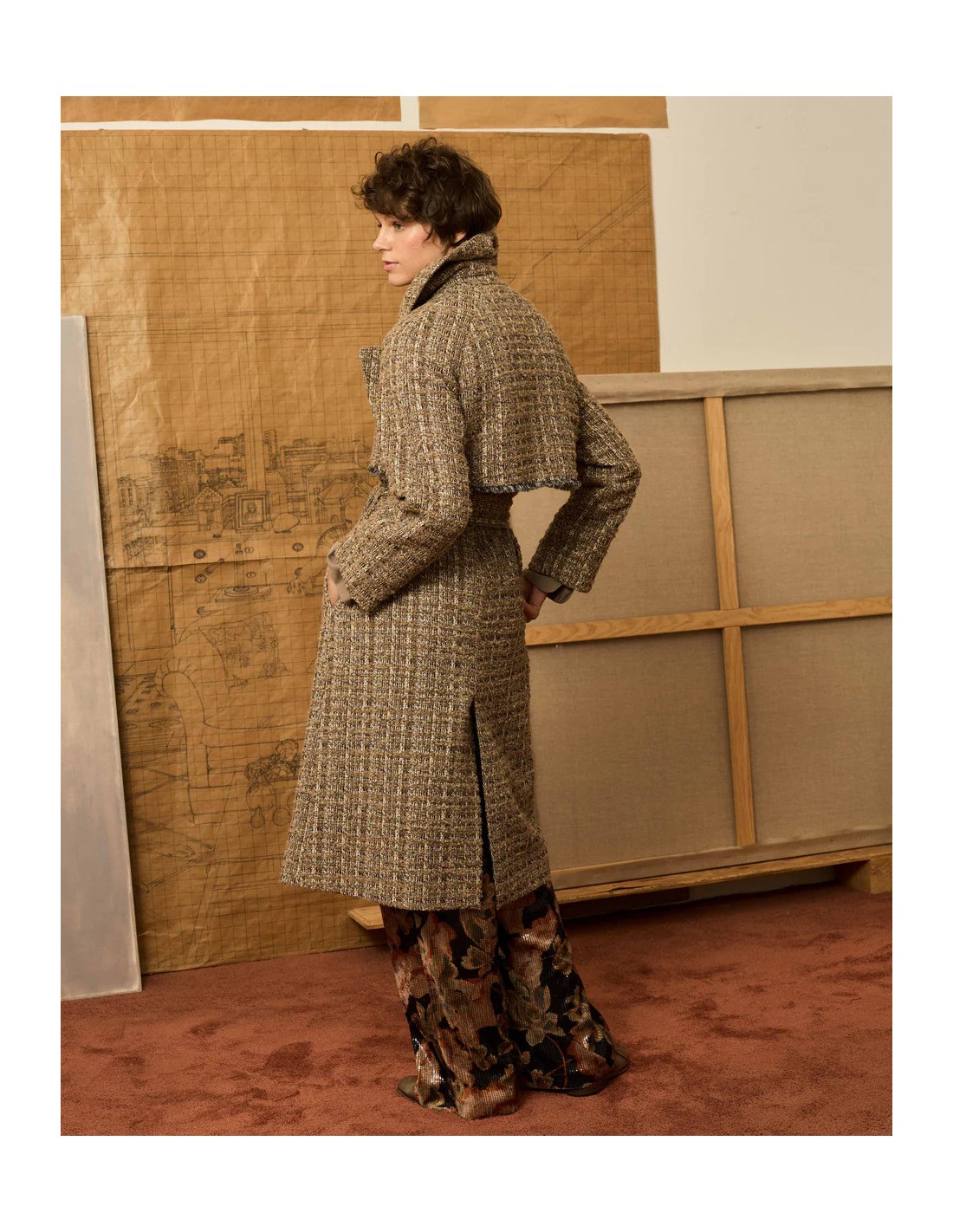 Abrigo cruzado con solapas y manga larga, en tejido tweed con hilos de lurex. Detalle de desflecado hecho a mano. Se ata mediante cinturón