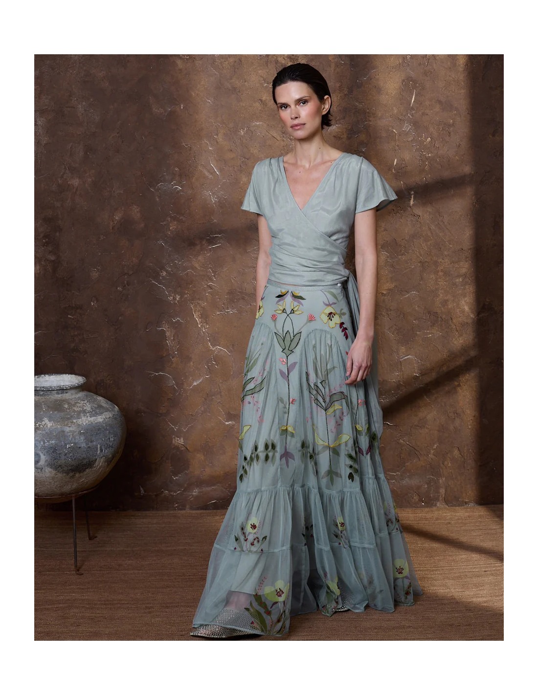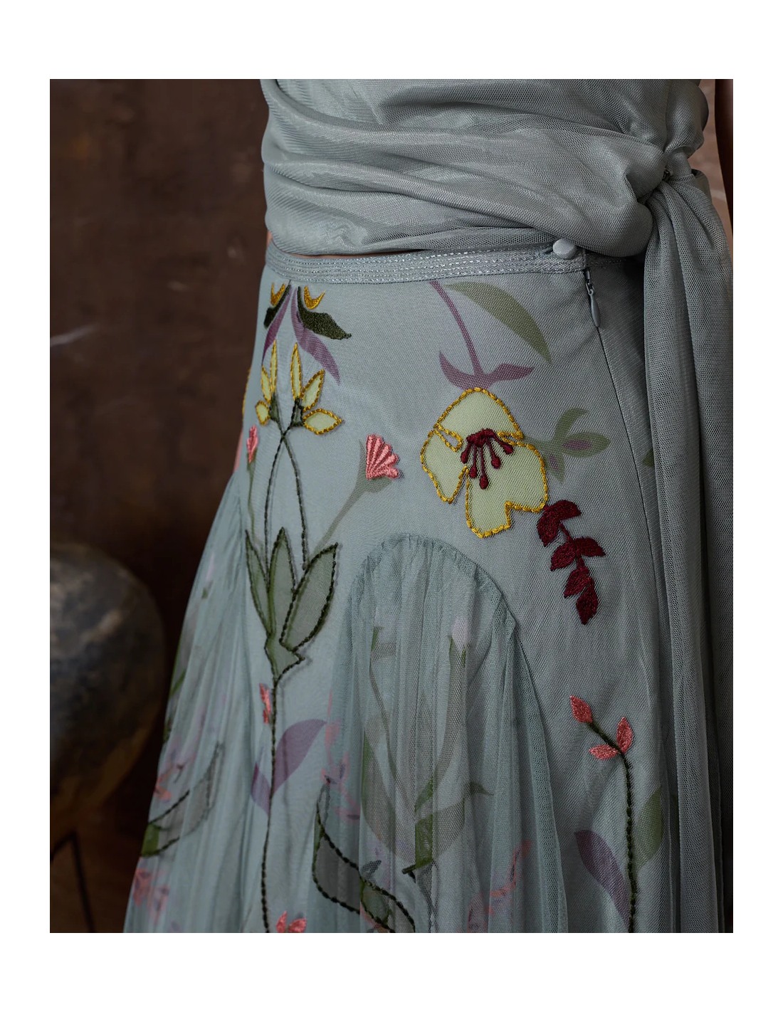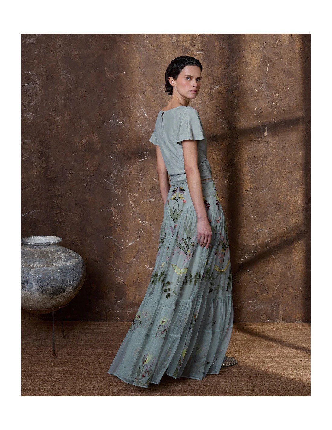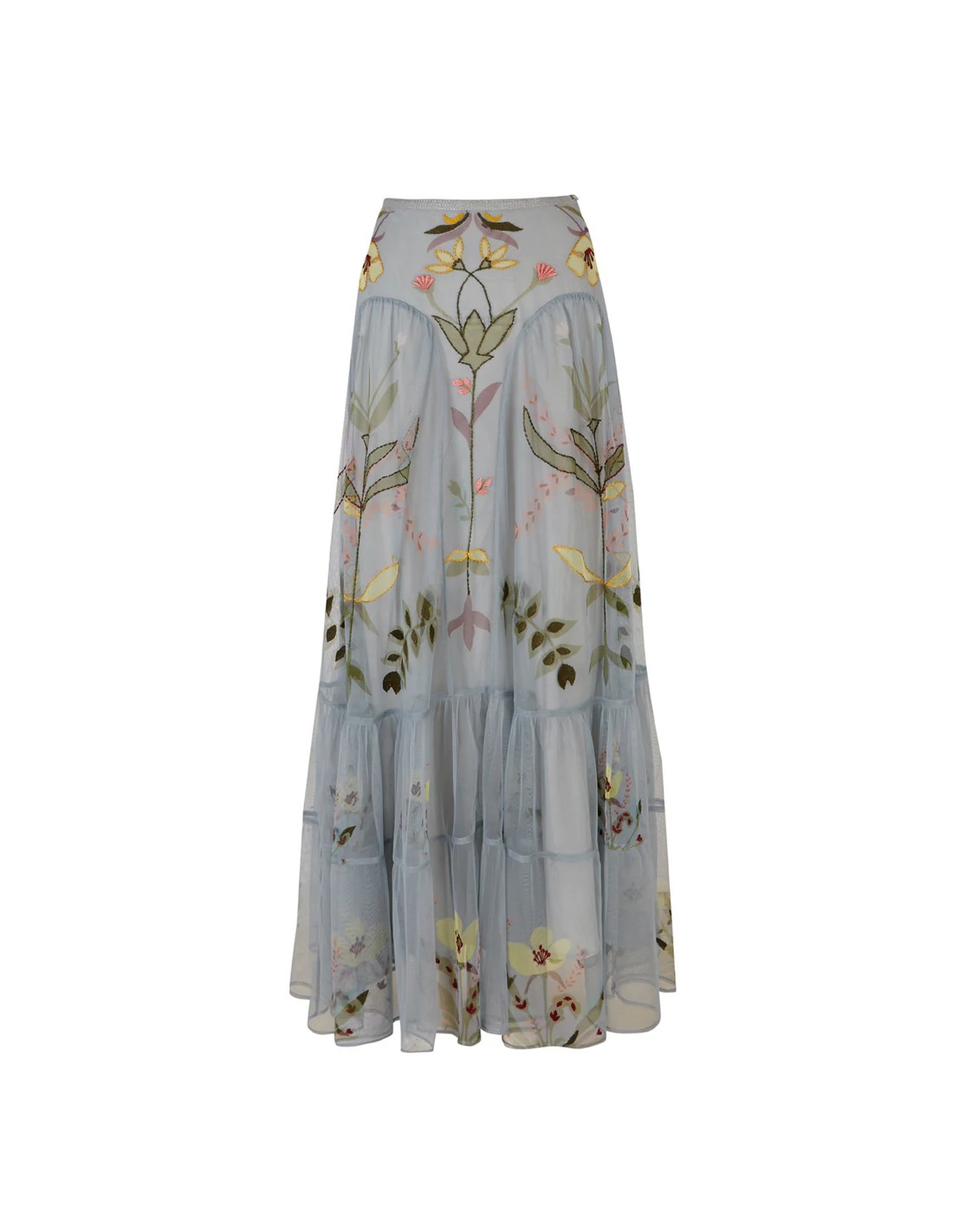 Falda de tul color azul con flores bordadas. Silueta muy favorecedora, ya que se ajusta en la cadera. Presenta dos arcos de frunces en la parte frontal y cortes en el bajo que aportan movimiento sin añadir volumen. La cinturilla está rematada con una cinta bordada con varias filas de puntadas en hilo metalizado al tono. Se cierra en el lateral mediante cremallera y botón forrado.