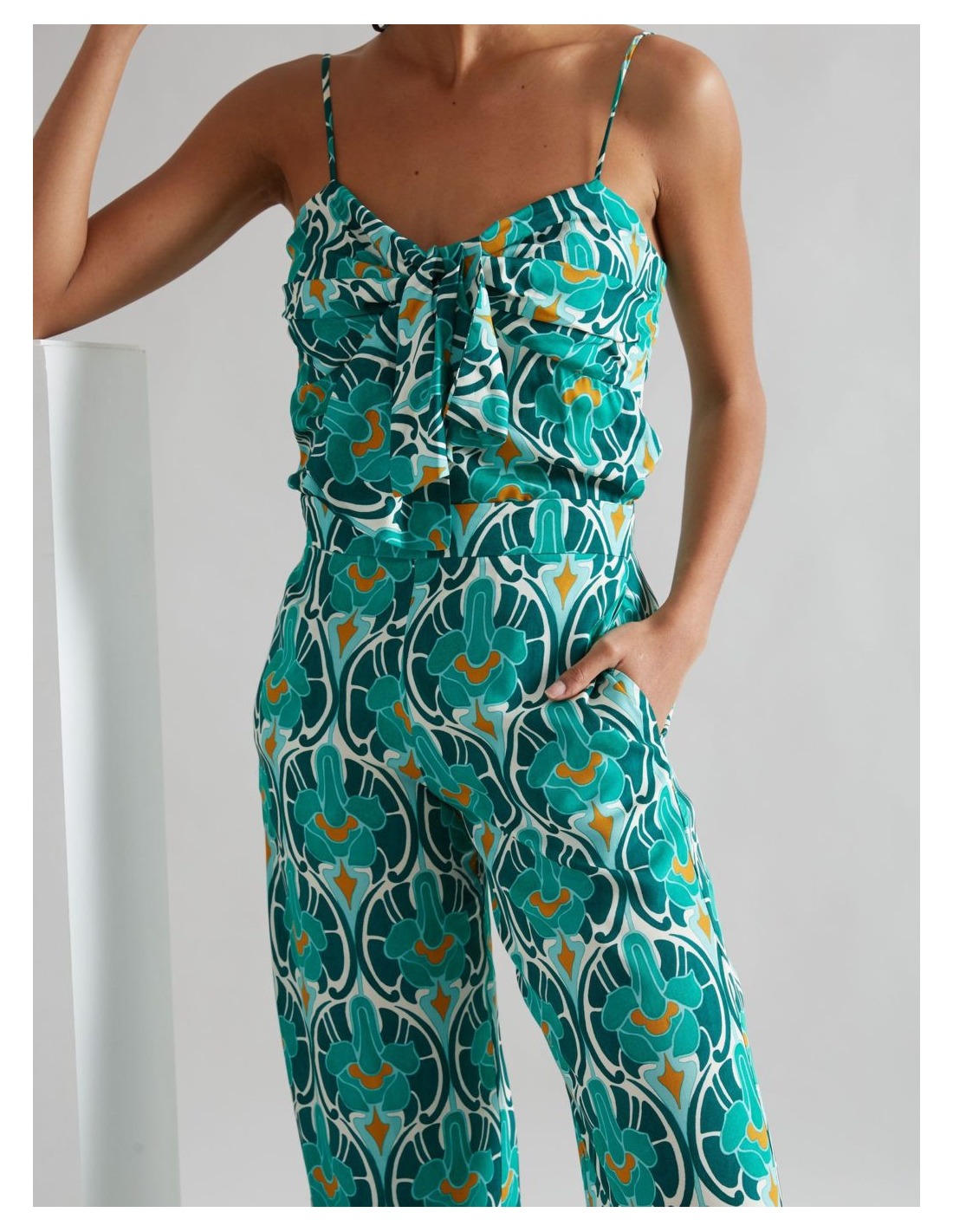 Pantalón palazzo Is coming esmeralda con toques ocre en estampado años 20 con cremallera trasera. El tejido es viscosa italiana. Hecho en España.100% Viscosa
