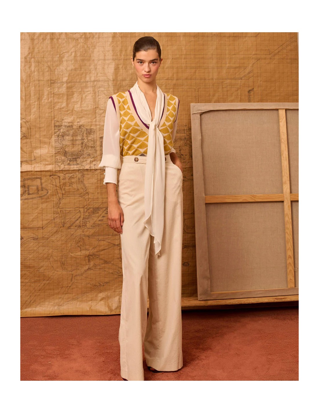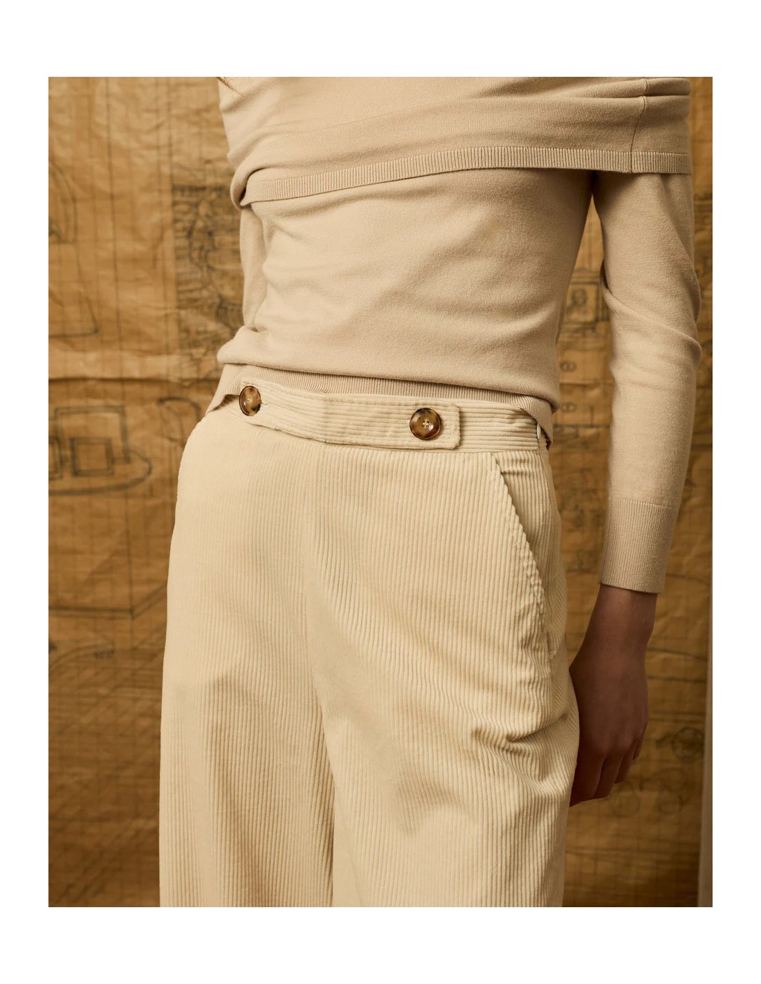 Pantalón palazzo de pana marfil. Silueta de talle alto con detalle en cintura y gomilla en la parte trasera