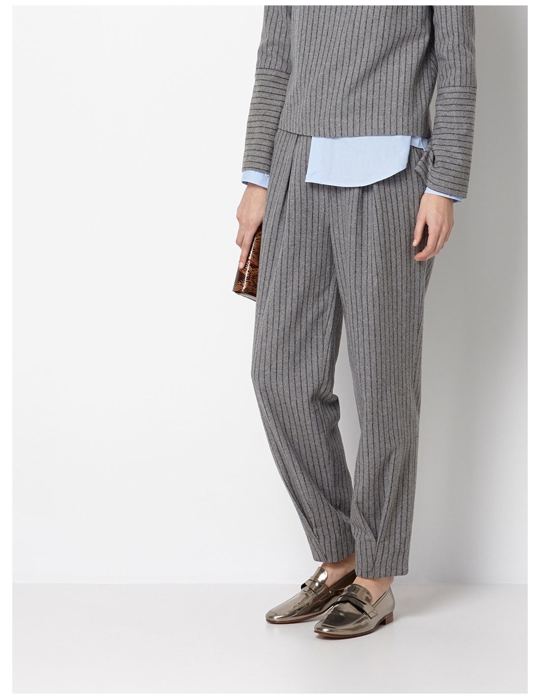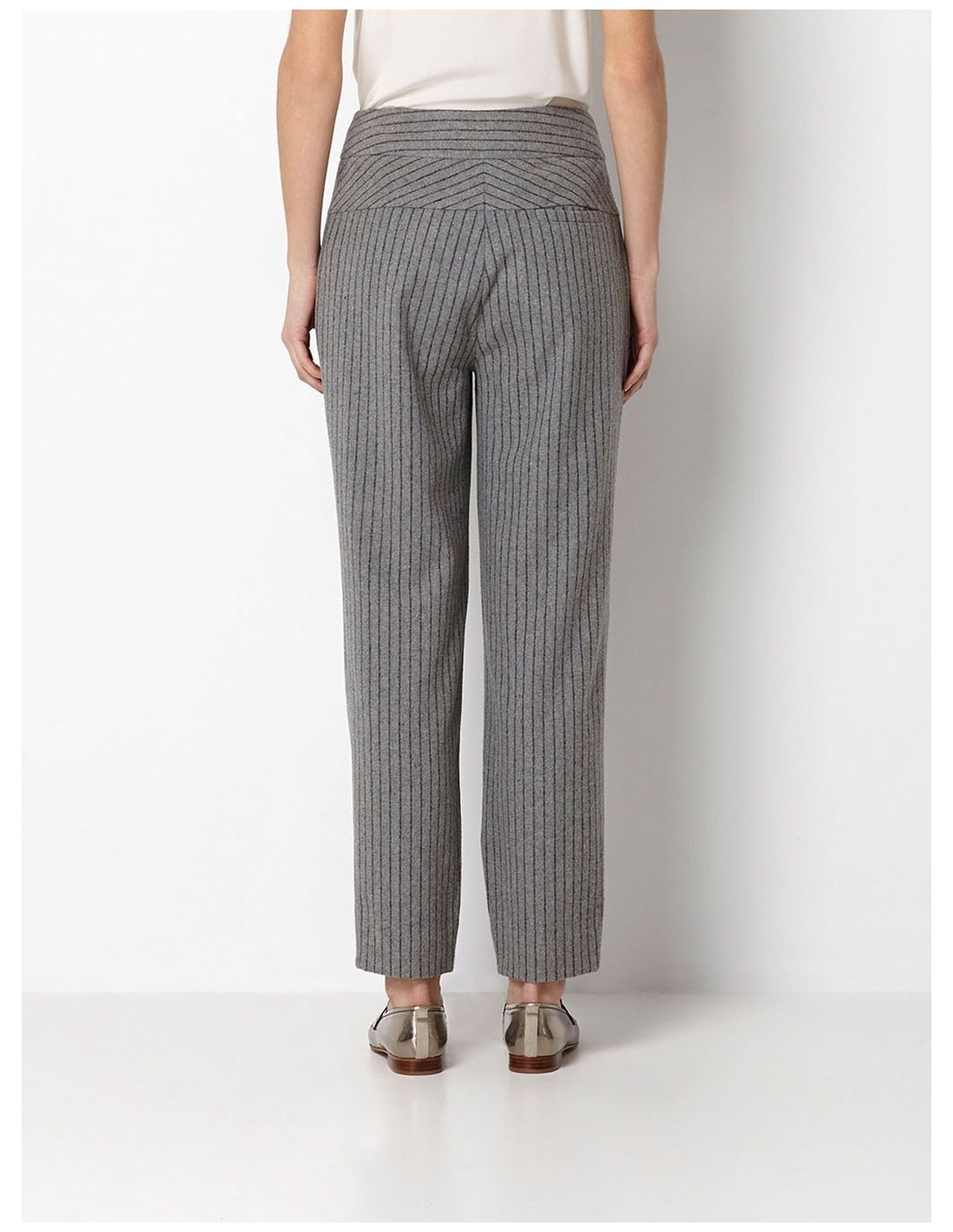 Tejido confeccionado en lana y viscosa. Diseño de raya diplomática de estilo masculino. Detalle de pinzas para un mejor fitting. Abertura de bolsillos laterales y bolsillo ojal trasero. Cierre de botones forrados y cremallera oculta en el delantero.