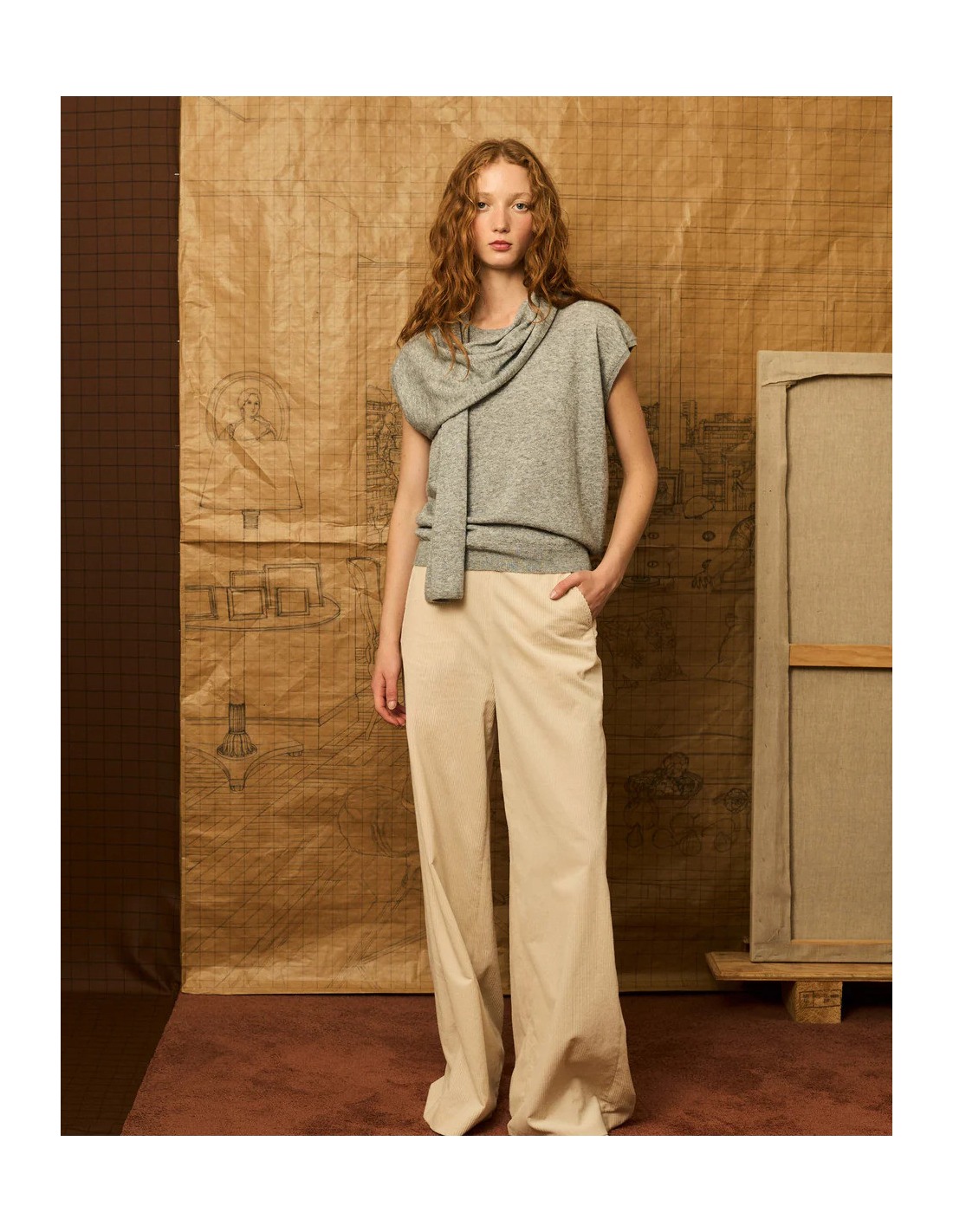 Top sin mangas gris con lazada que nace en la costura del hombro derecho y manga larga en hilatura color beige con un sutil brillo