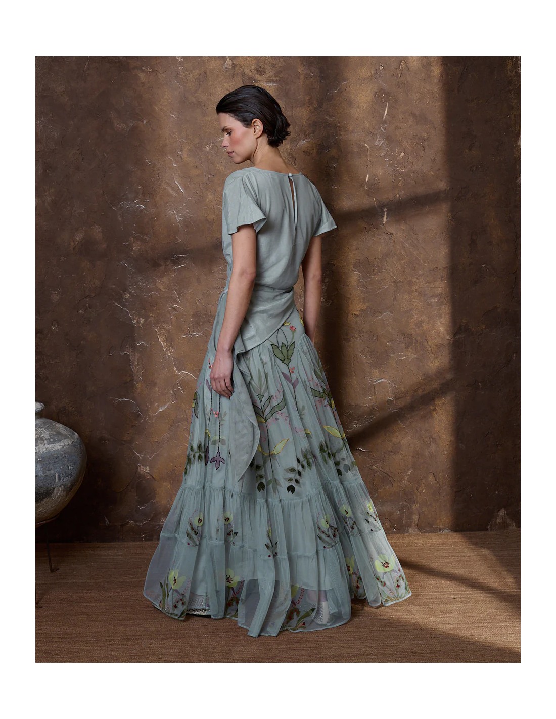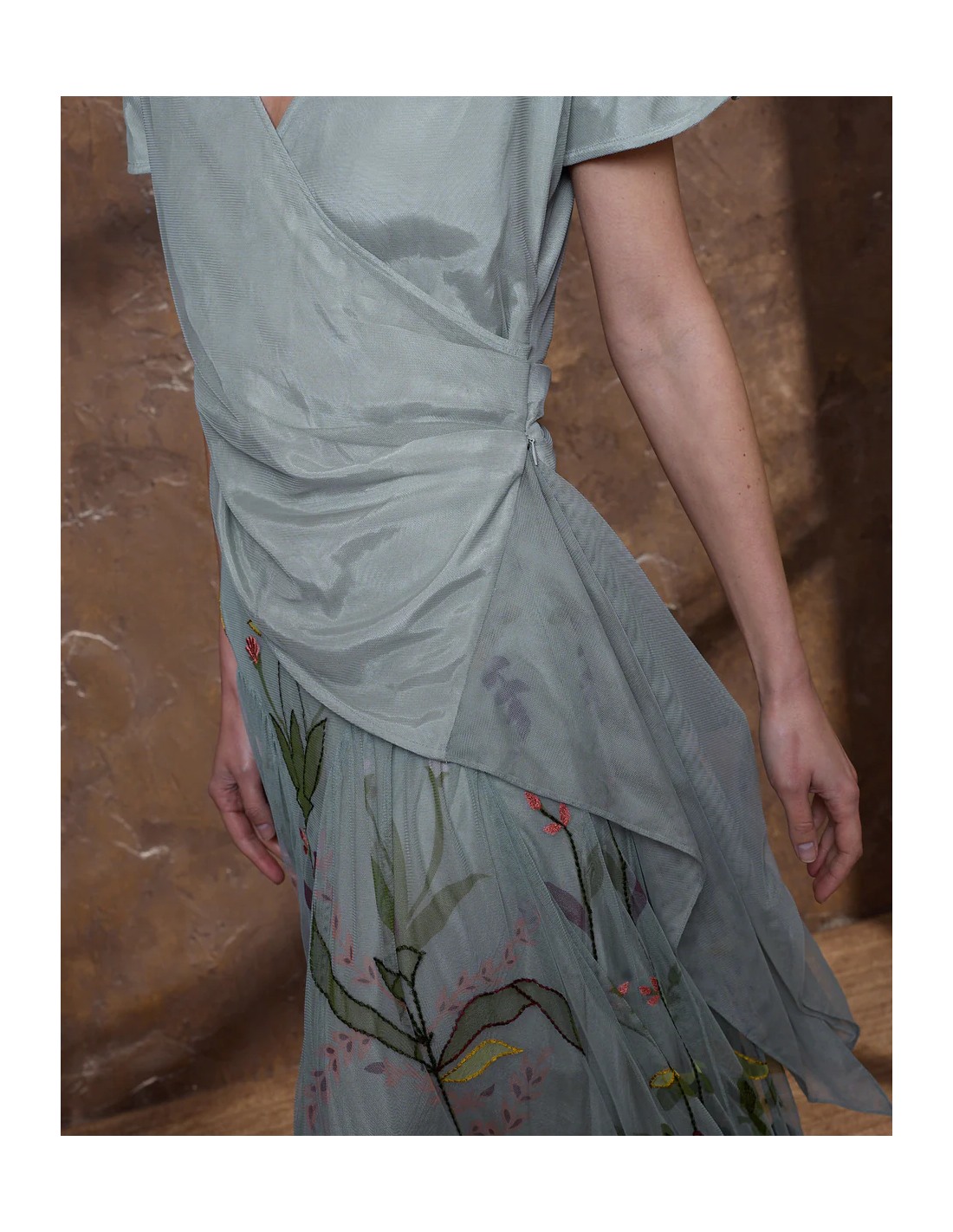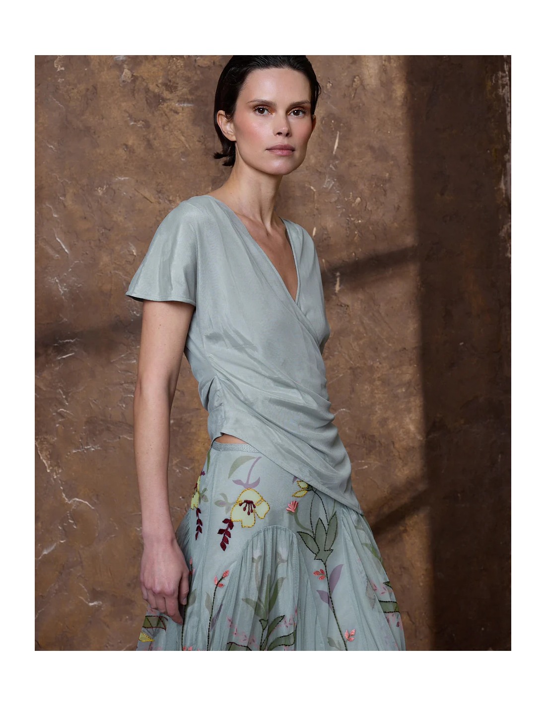 Top de tul liso en tono gris azulado. Escote pico y manga corta, cruzado en el frontal. Los extremos se anudan en un lateral formando una lazada larga que aporta movimiento al caminar.