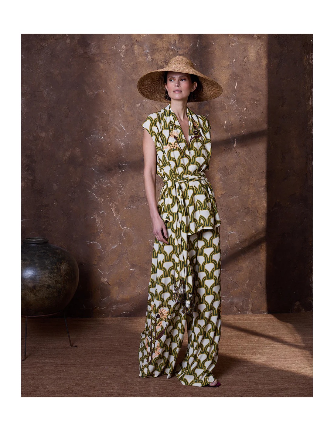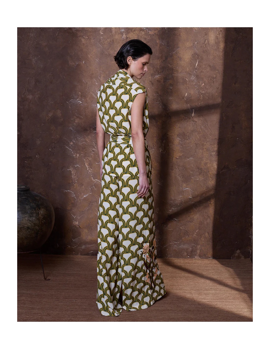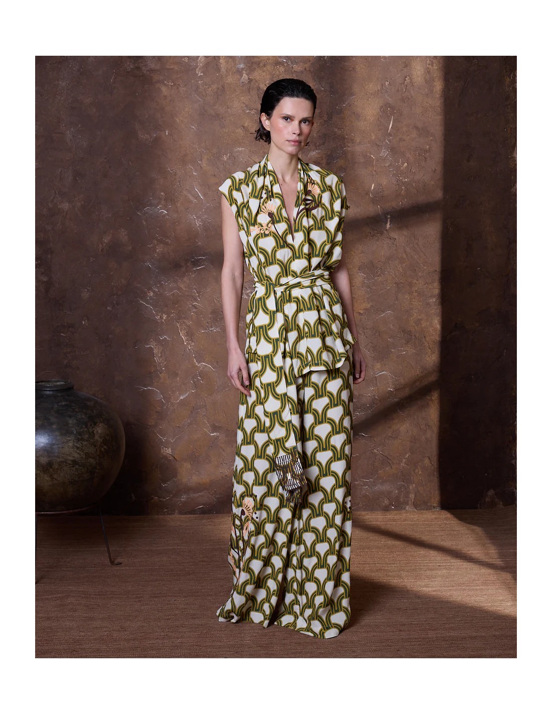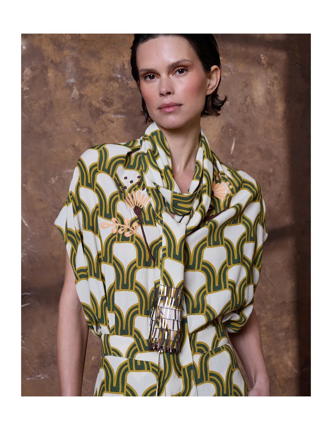 Top de viscosa en estampado geométrico color verde con flores bordadas estilo art deco y escote pico. La prenda incluye un cinturón con lentejuelas alargadas en los bordes para anudar en cintura o llevar en el cuello.