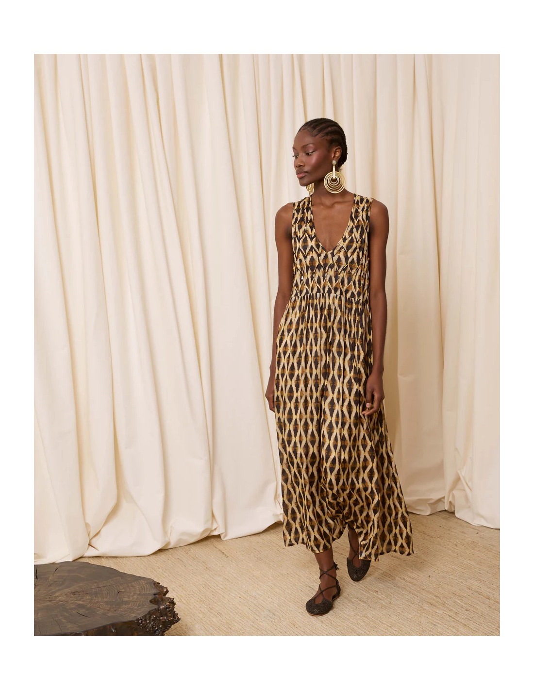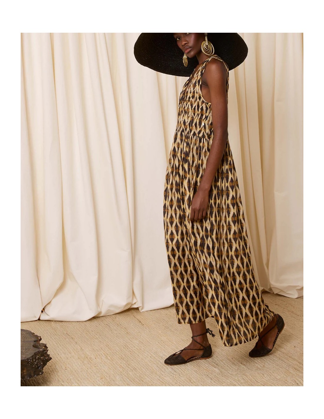 Vestido midi en tejido de algodón estampado con dibujo geométrico en tonos negros, marfil y amarillo con detalle de lentejuelas salpicadas.