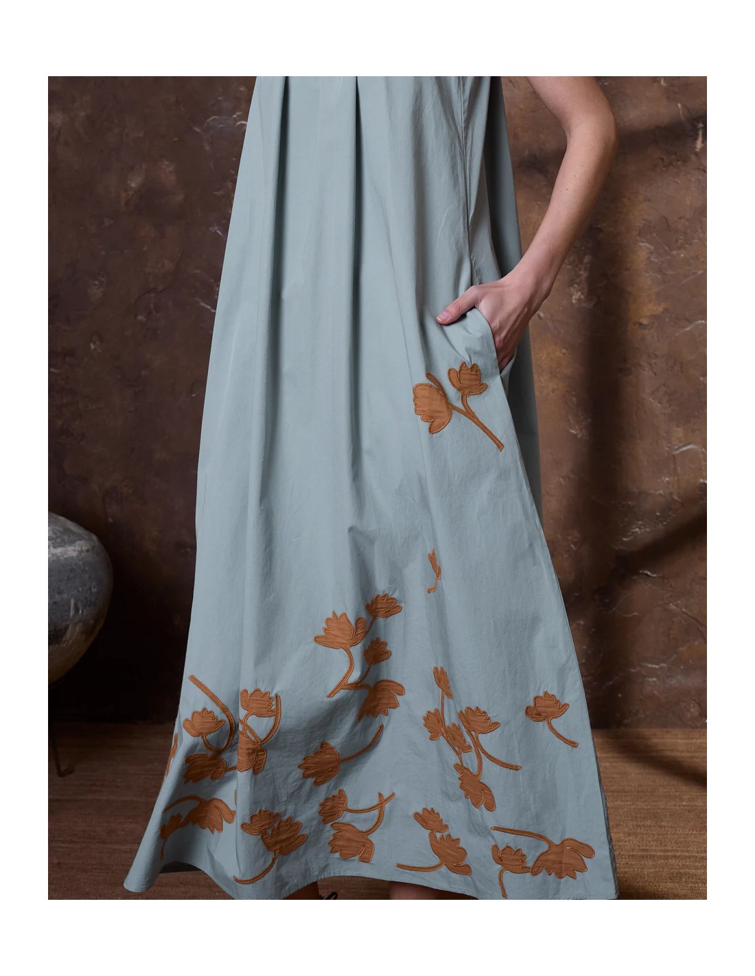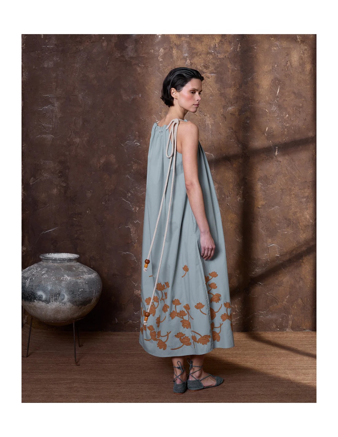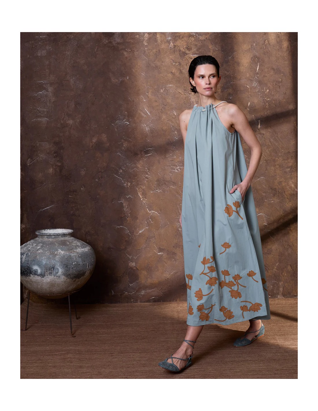 Vestido de algodón con cuello halter y cierre ajustable mediante cuerda gruesa. Flores de algodón en color ocre, recortadas y cosidas en el bajo del vestido