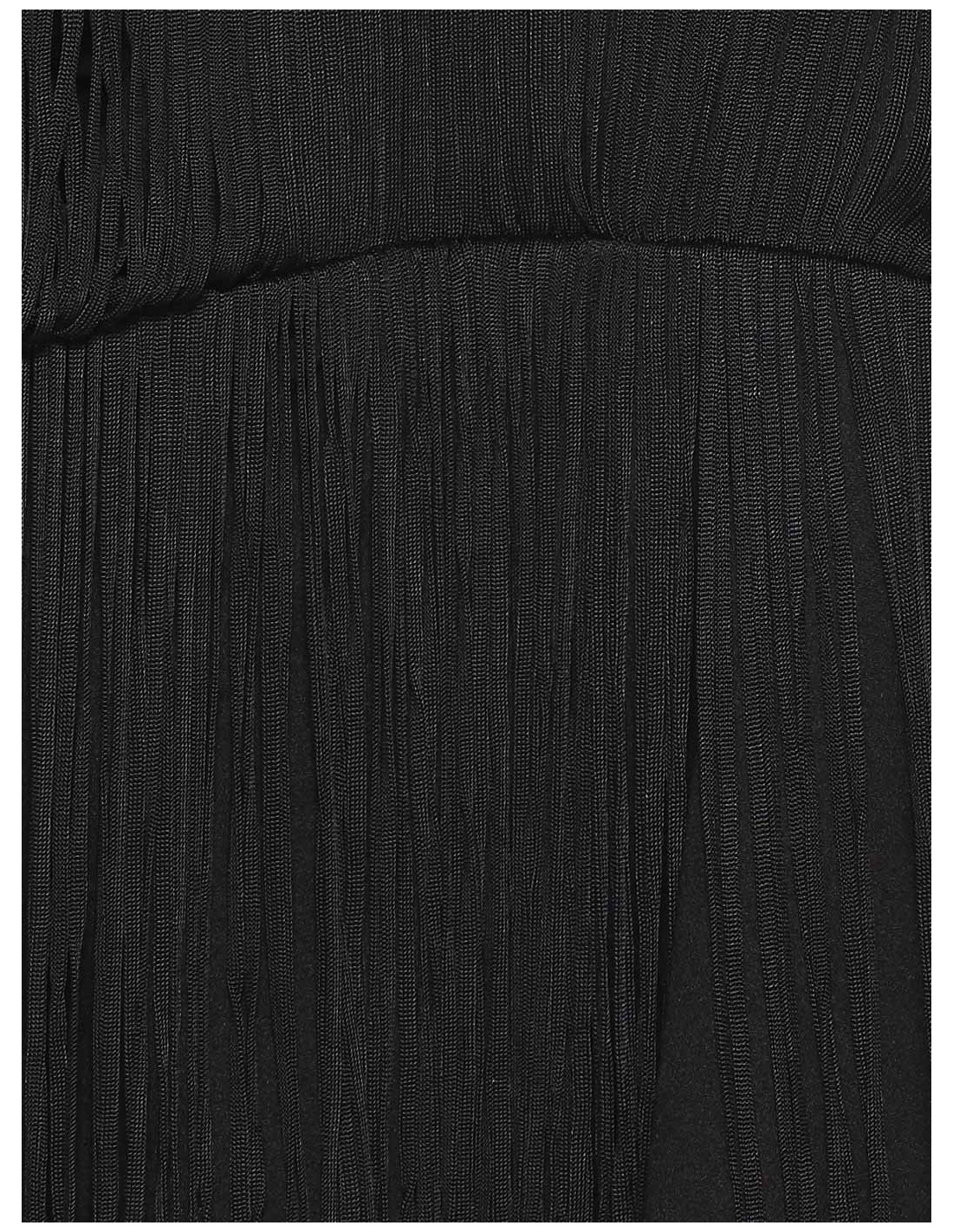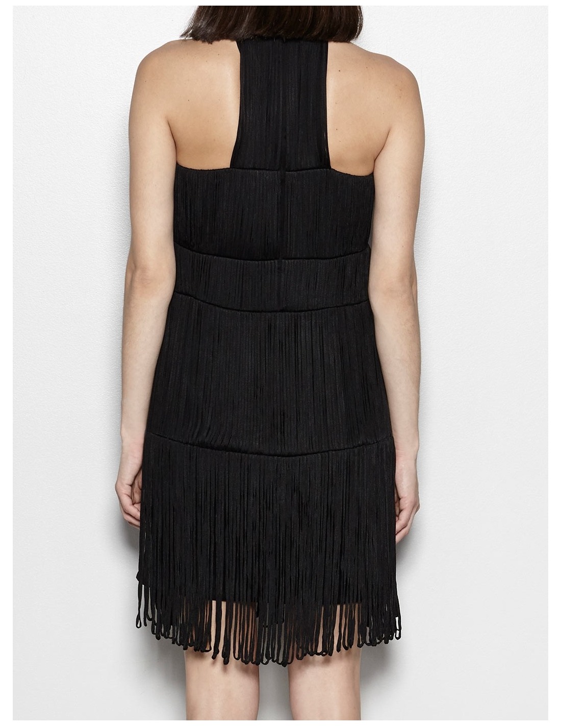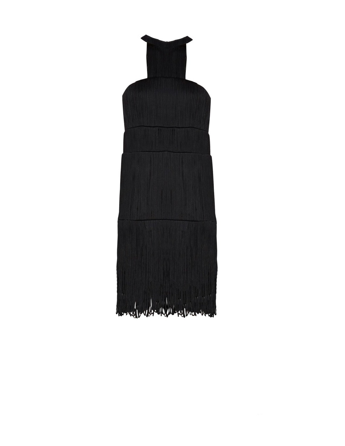 Tejido con cierta caída. Diseño de flecos. Cuello halter. Silueta de corte recto. Cierre oculto de corchete y cremallera en espalda. Forro interior.