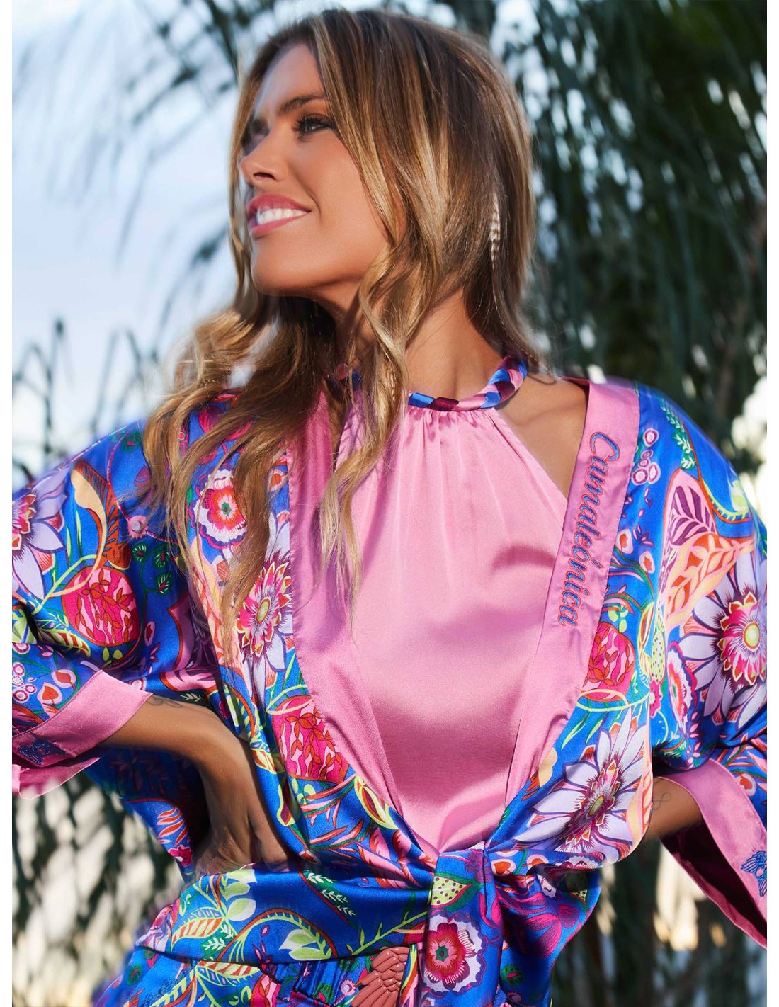 BLUSA SATINADA CON CUELLO HALTER, PINZA EN EL PECHO Y TIRA TRENZADA EN ROSA Y AZUL EN EL CUELLO. SE ABROCHA CON LAZADA DETRÁS DEL CUELLO. COMPOSICIÓN (97% POLIÉSTER, 3% SPANDEX).
