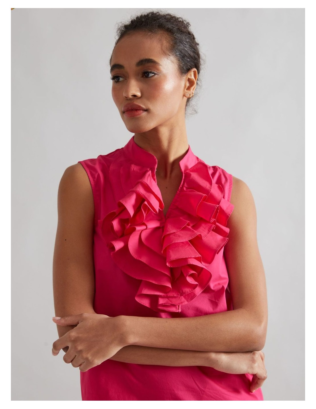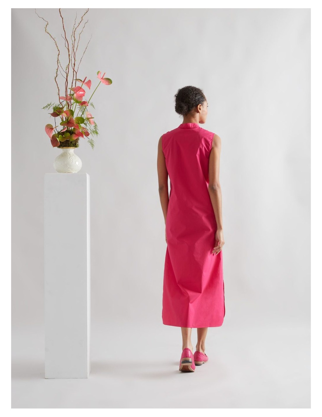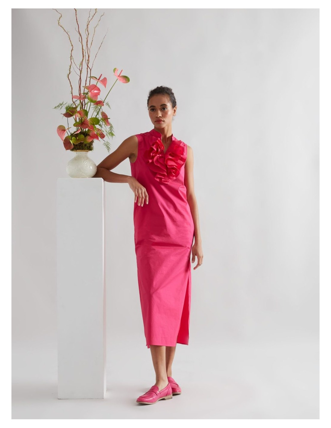 VestidoIs coming midi de popelín frambuesa, tiene unos detalles en los costados con aberturas y bolsillos. Con cuello estilo mao y pechera de volantes.