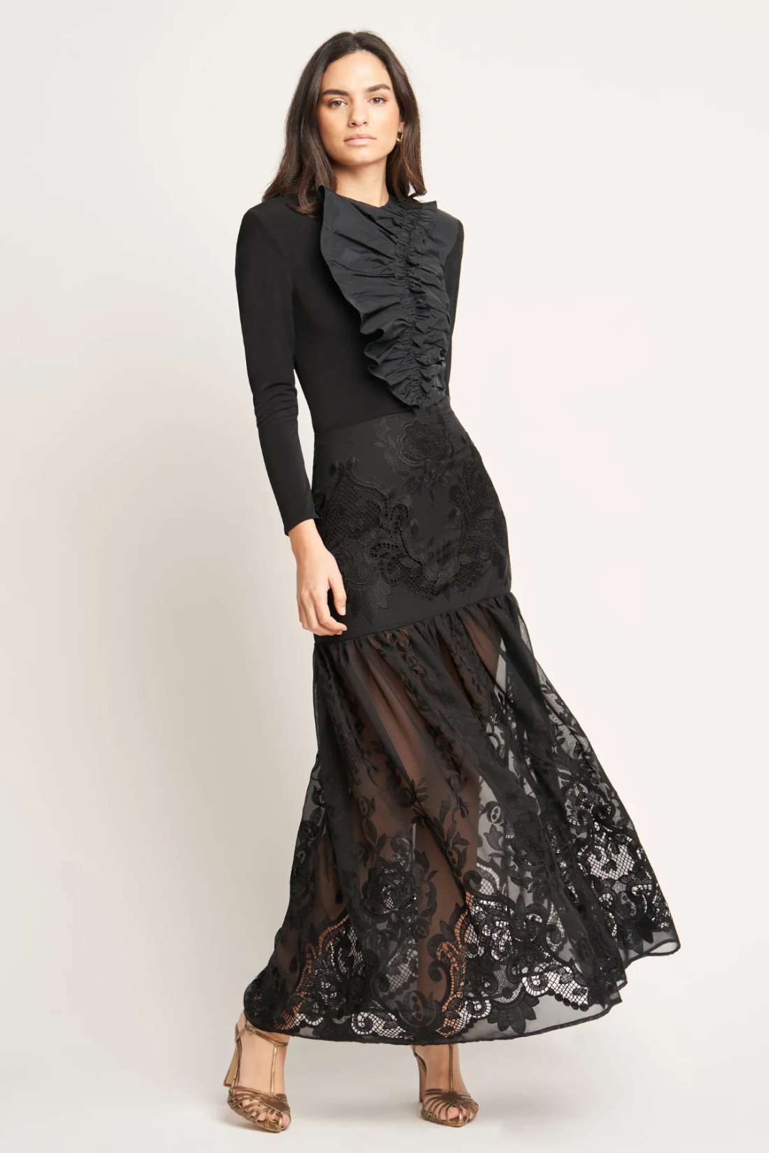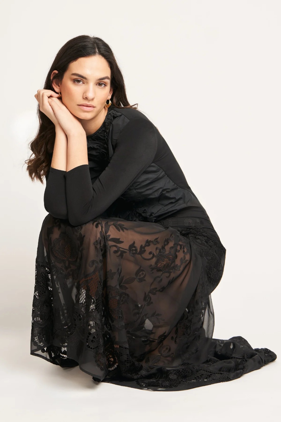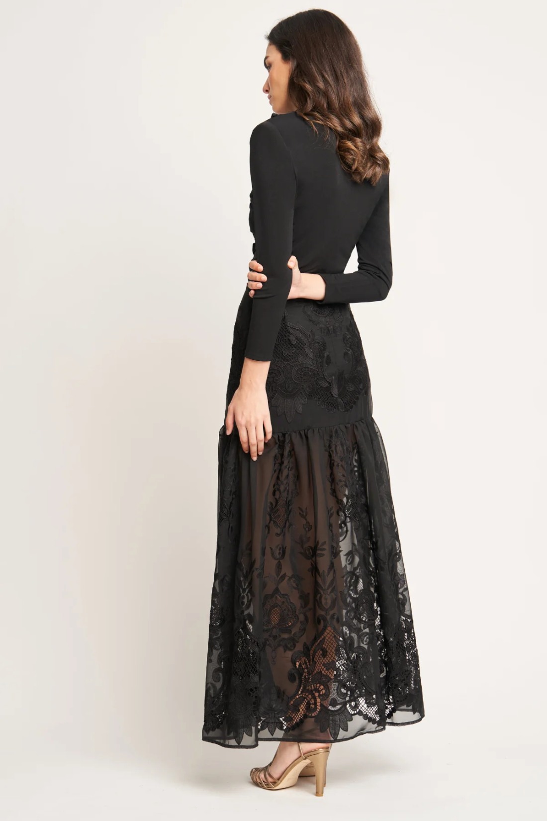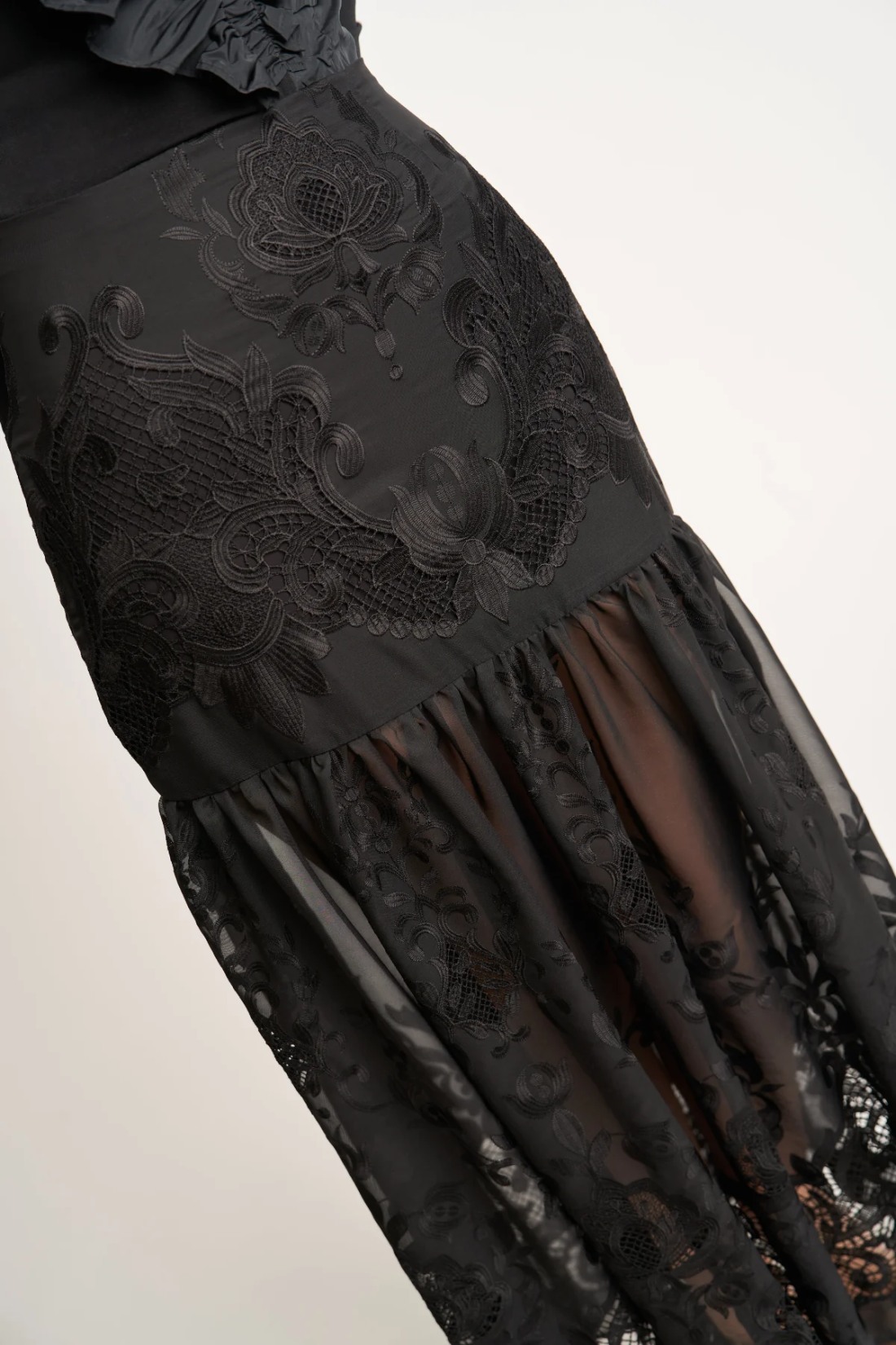 Falda negra que se ajusta en la parte superior y se abre suavemente aportando movimiento. Confeccionada en tejido combinado, presenta una base y un bajo de encaje semitransparente con delicados motivos florales.
