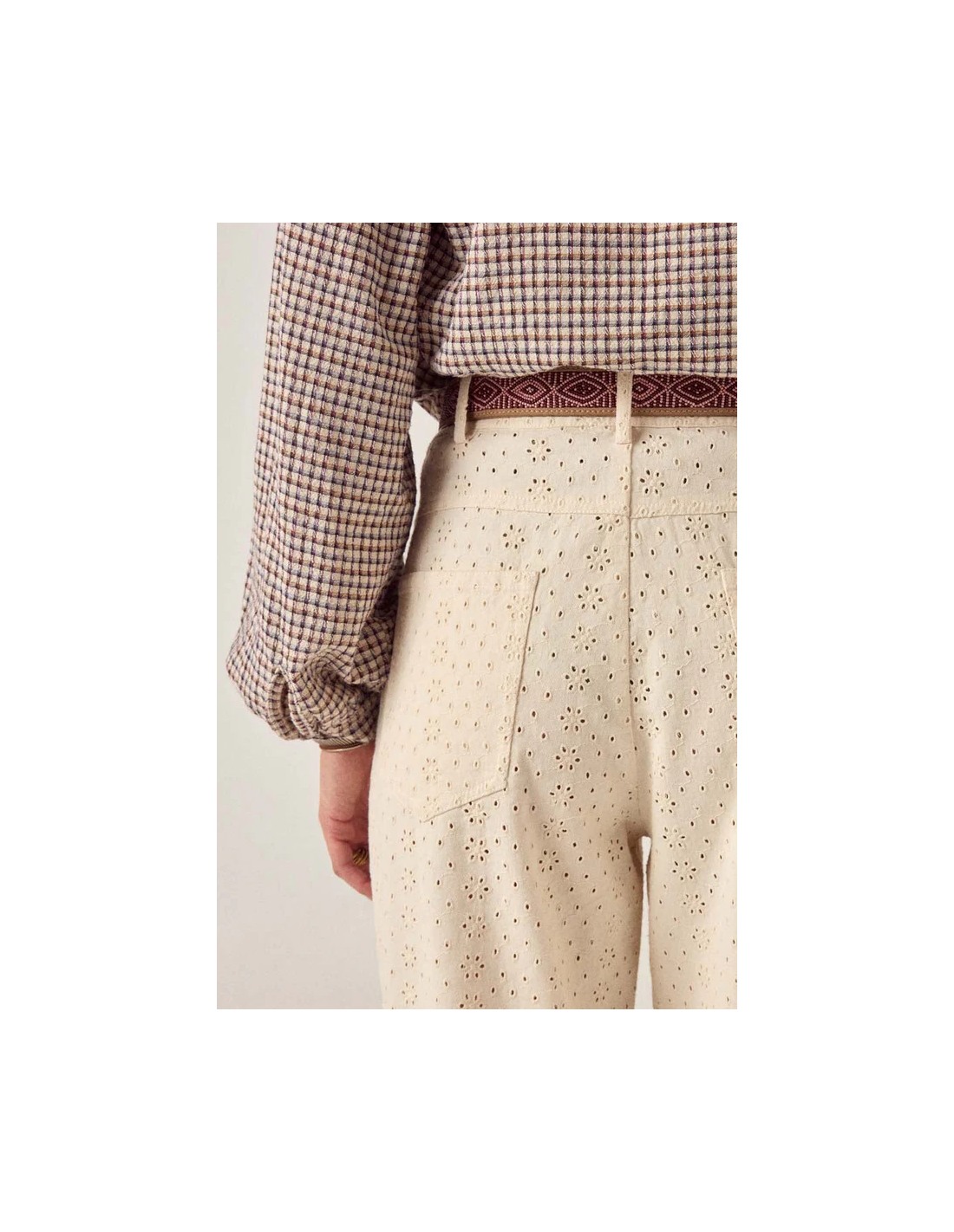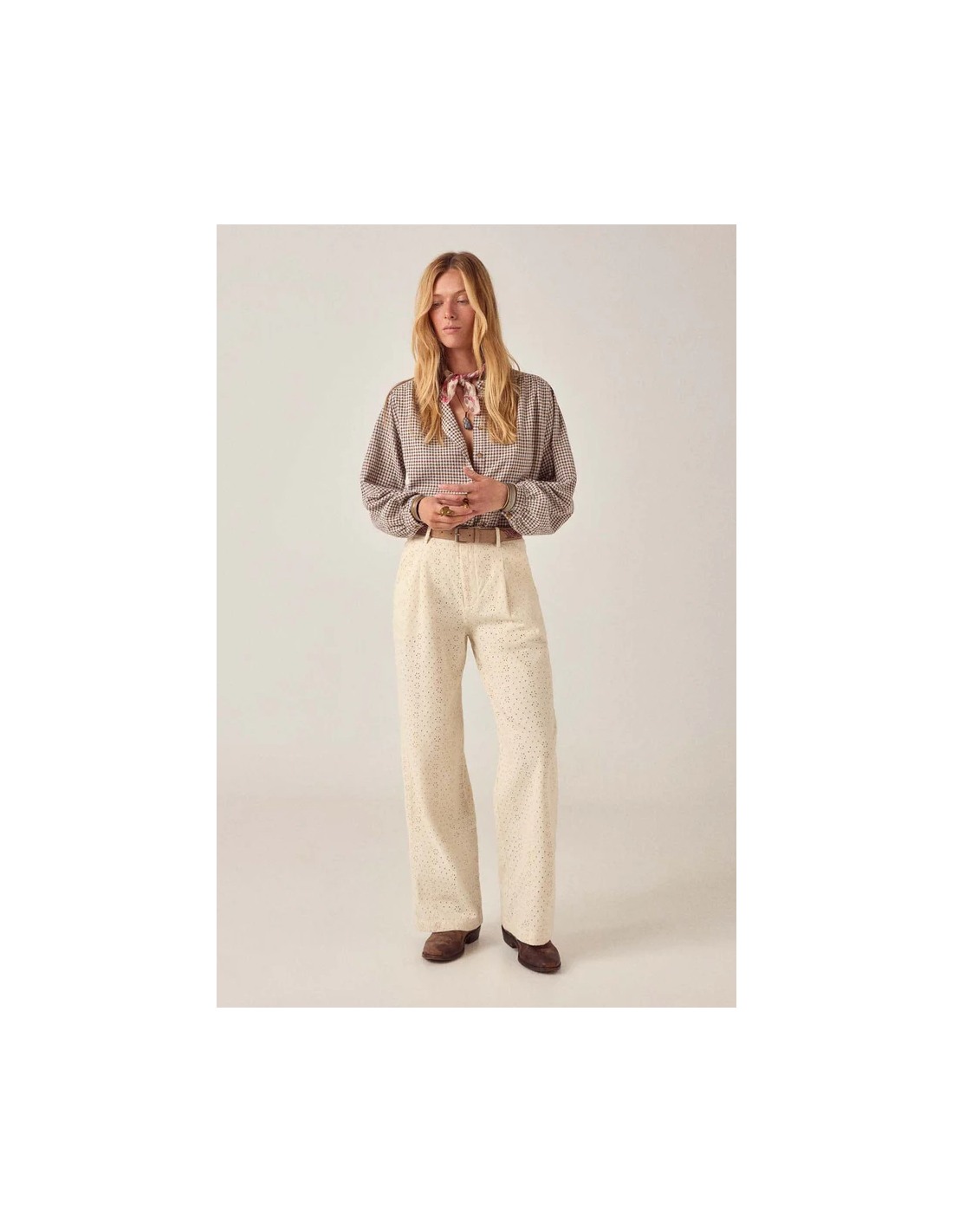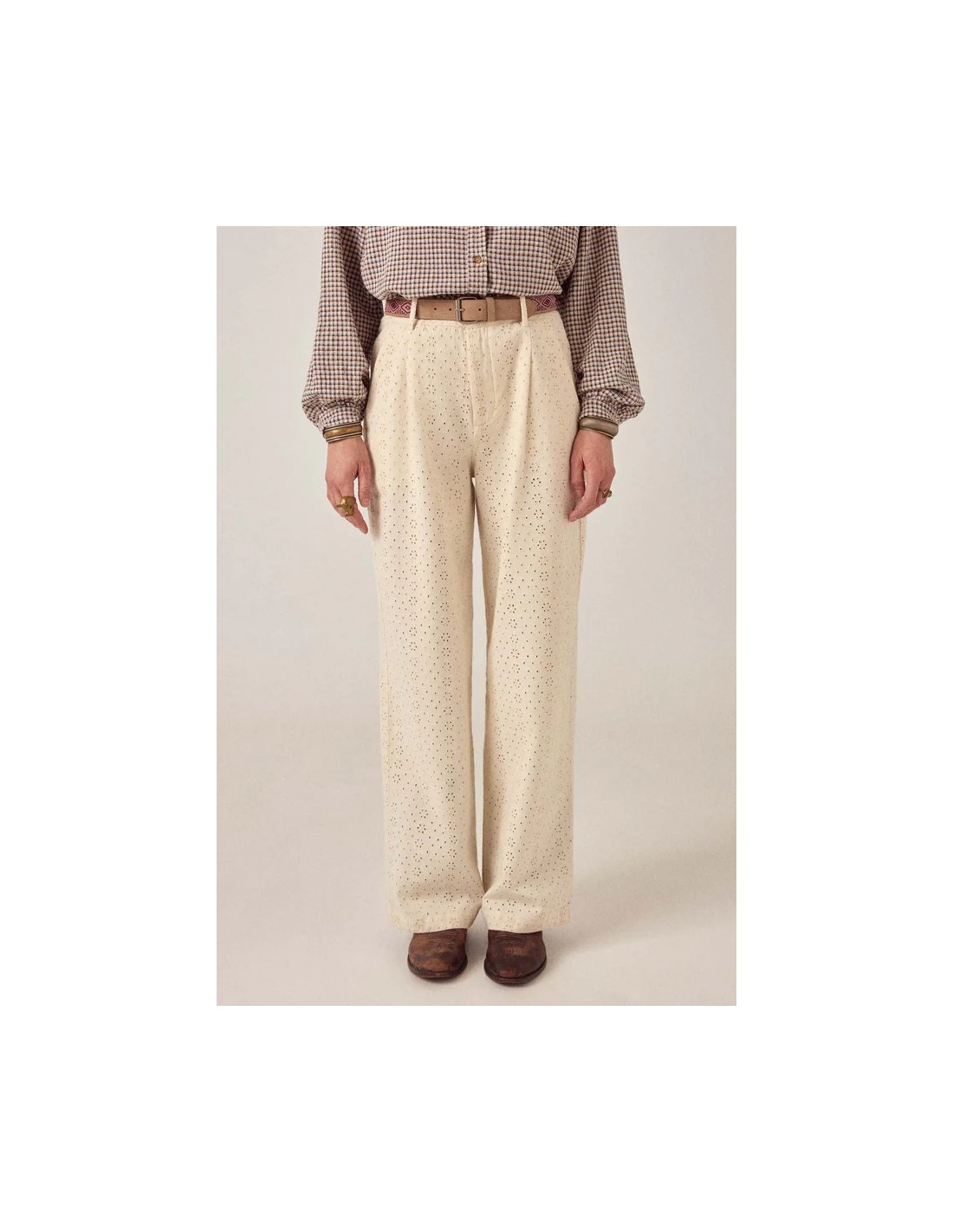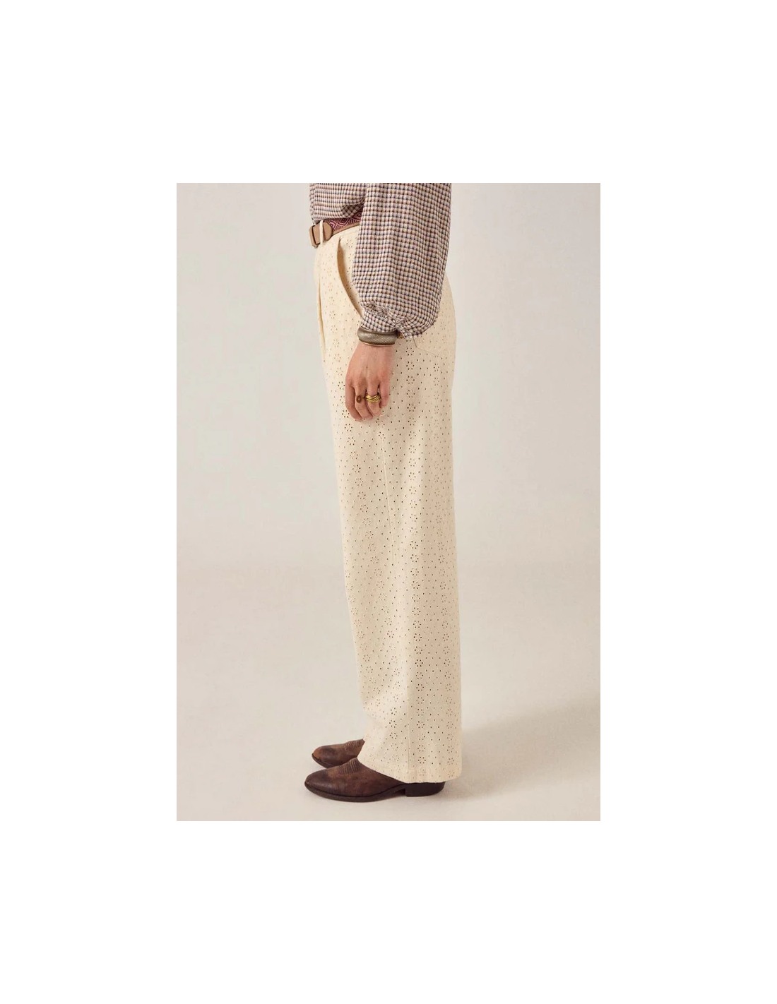 Pantalón de pierna ancha de cintura alta en sarga bordada con algodón. Cierre de botón y cremallera con lazos de cinturón. Dos bolsillos delanteros, dos bolsillos traseros. Pierna recta ancha con patrón de ojales bordado en todo el tejido.