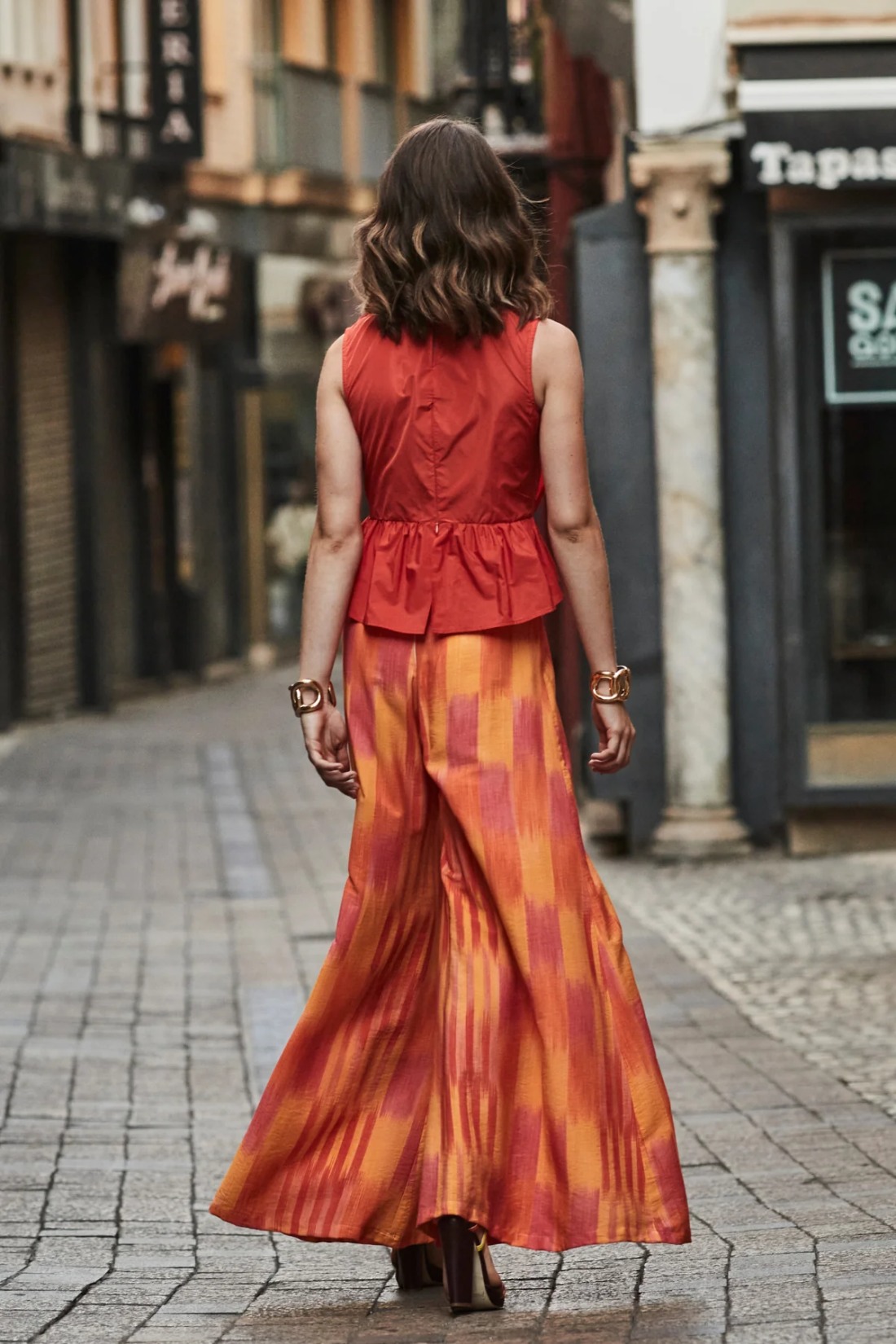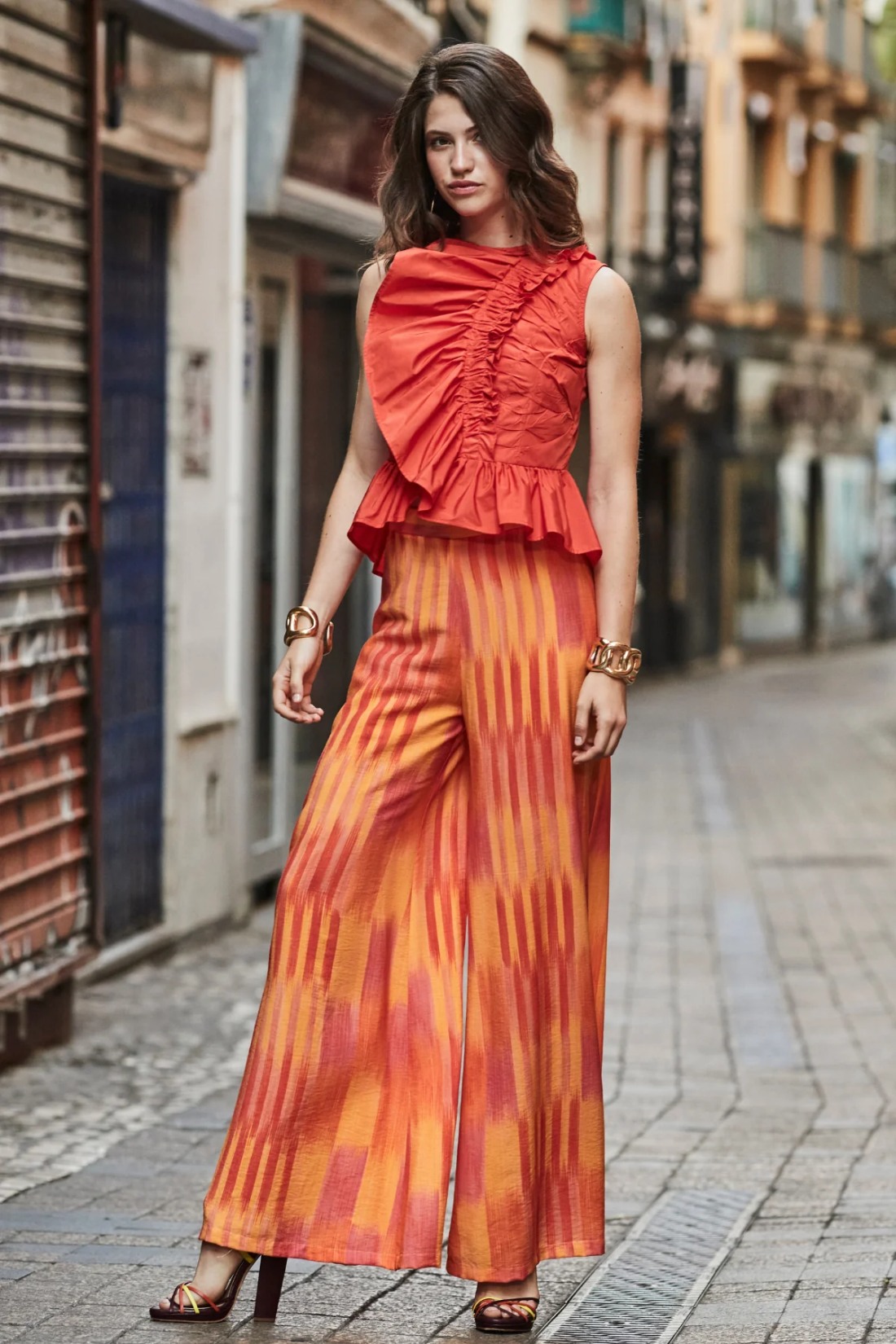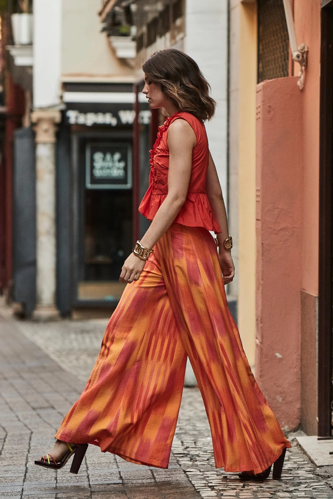 Pantalón palazzo de tiro alto en tejido de lino. Estampado en tonos naranjas con degradado de líneas verticales que estilizan la silueta.