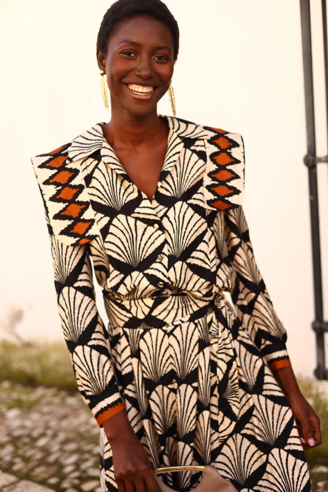 Una pieza que habla por sí sola. La camisa Rami está confeccionada en tejido ligero con un estampado gráfico de inspiración art déco en tonos neutros y toques tierra que elevan cualquier look. Su silueta estructurada con hombreras marcadas y cuello XL la convierte en un diseño de fuerte personalidad, ideal para mujeres que apuestan por la elegancia con carácter.