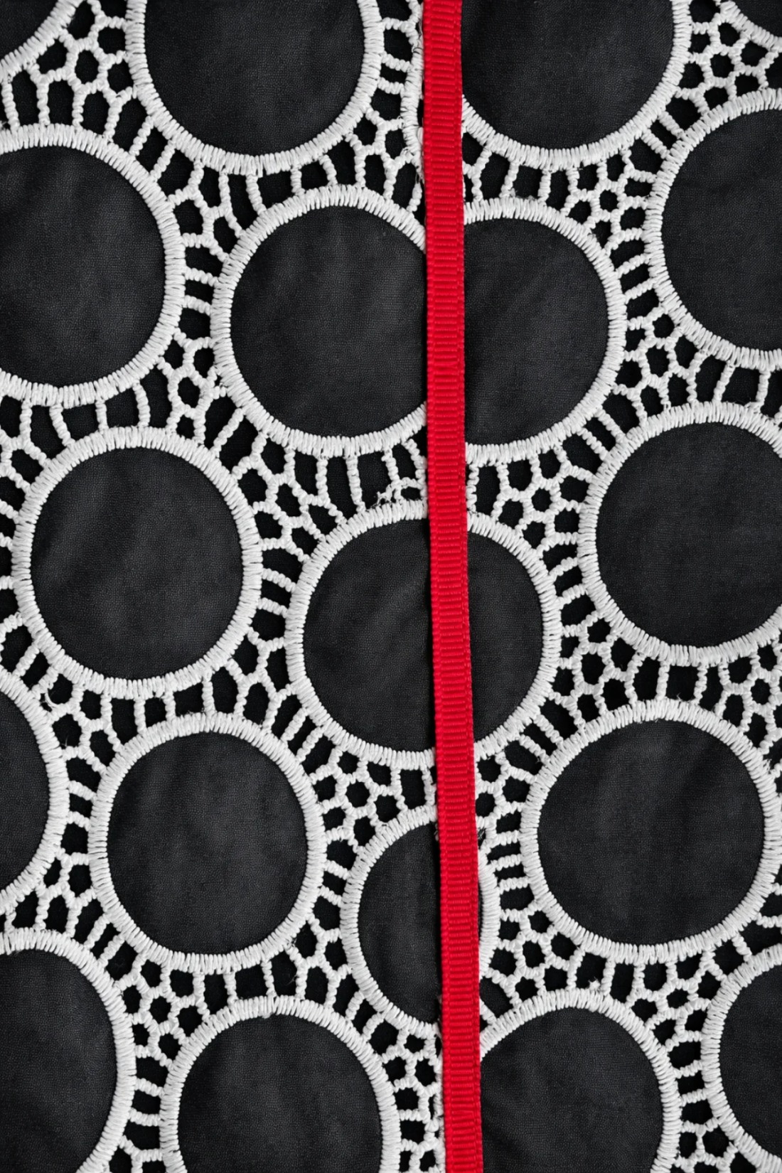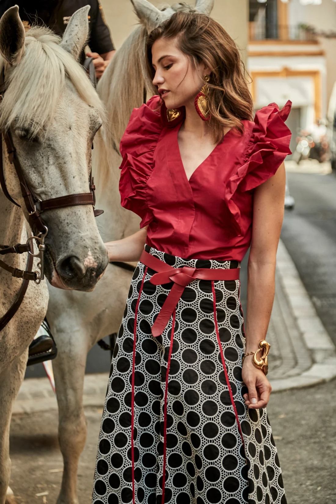 Falda en tejido guipur ligeramente evasé con estampado de lunares blancos y negros. Detalles en líneas verticales en color rojo que estilizan la silueta y aportan contraste.