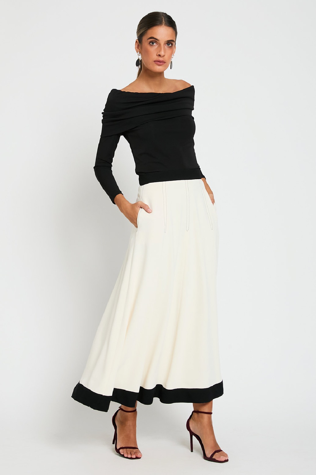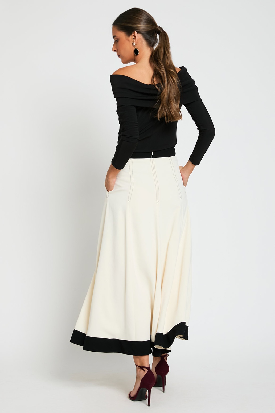 Falda midi en crepe de textura fluida, con corte recto y combinaciones de color en crudo y negro. Su silueta limpia y su tejido elegante la convierten en una pieza versátil para looks minimalistas con impacto. Ideal para celebraciones familiares, desde comuniones hasta comidas especiales. Diseñado y fabricado en España.
