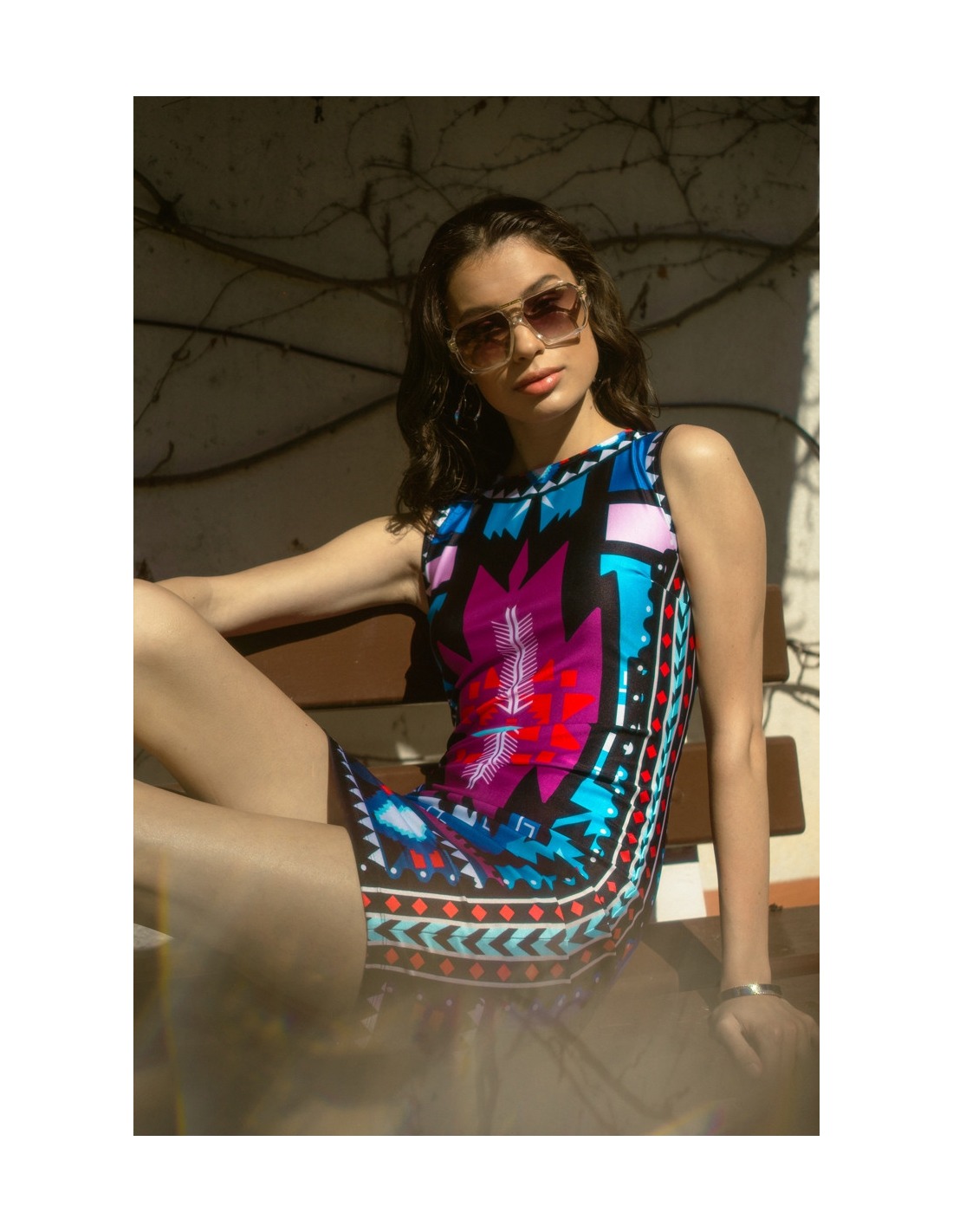 Nuestro Reincarnation Bodycon Mini es el look definitivo para todas las estaciones. La sencillez de este cautivador vestido se combina armoniosamente con el exquisito estampado de inspiración tribal.