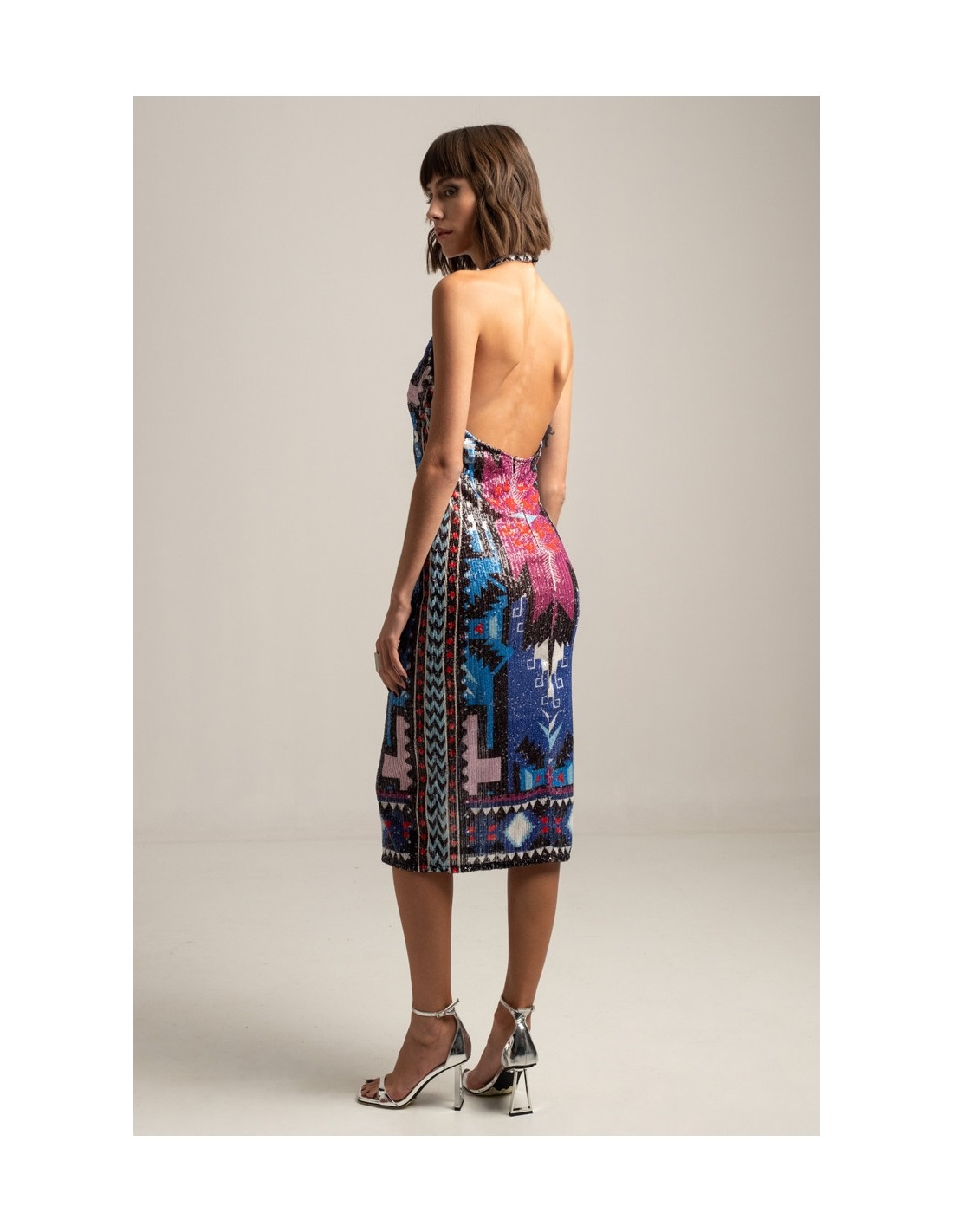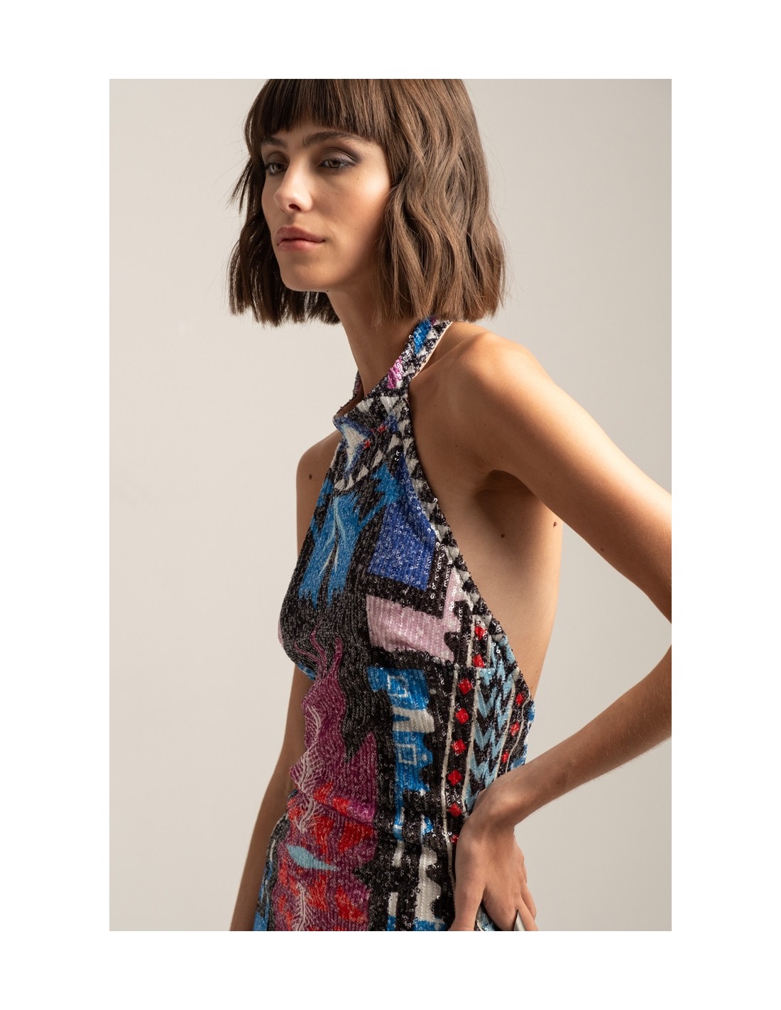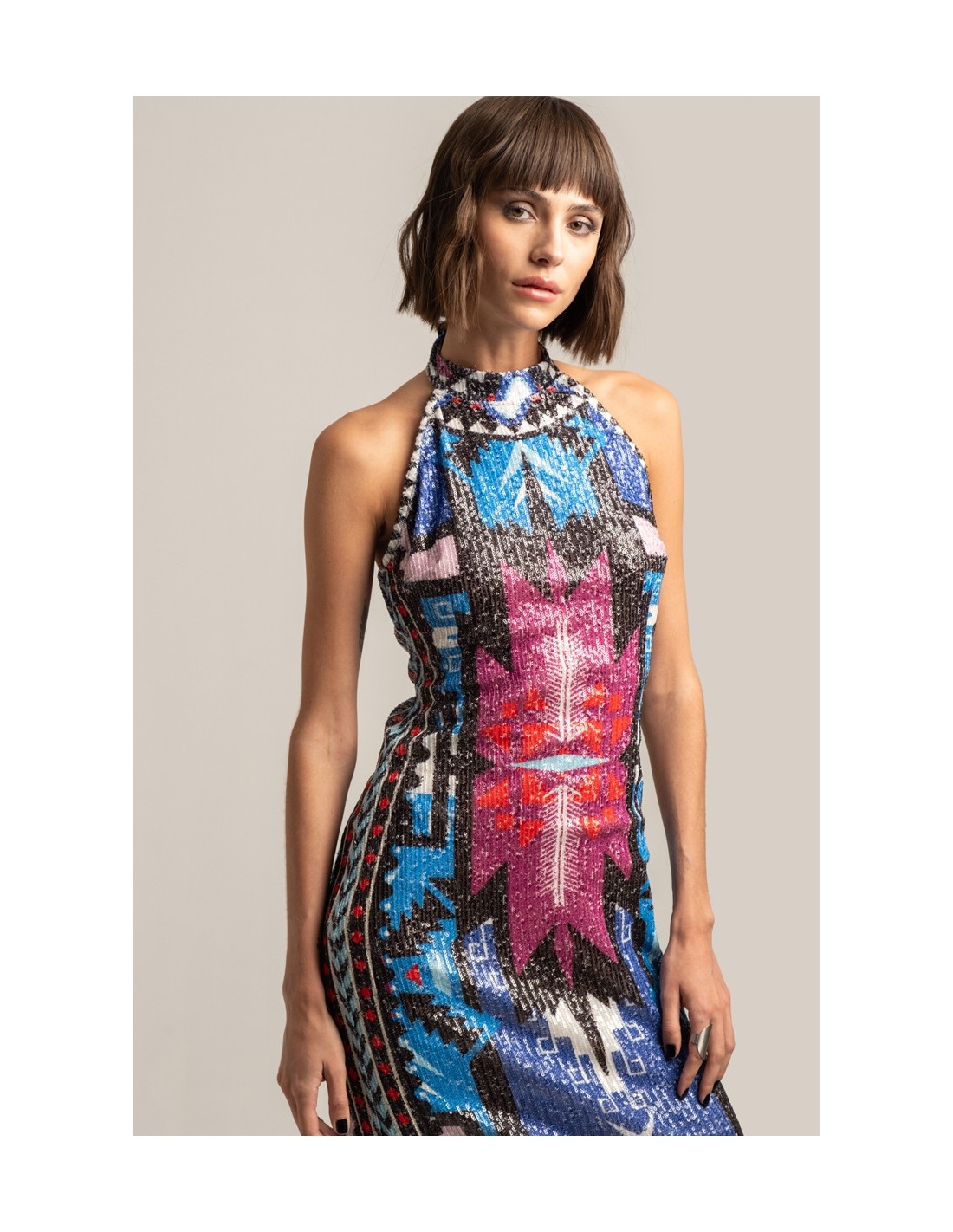 Dale glamour a tu look con nuestro vestido largo de lentejuelas Reencarnation. Un corte favorecedor y un exquisito estampado tribal crean esta silueta imparable.
