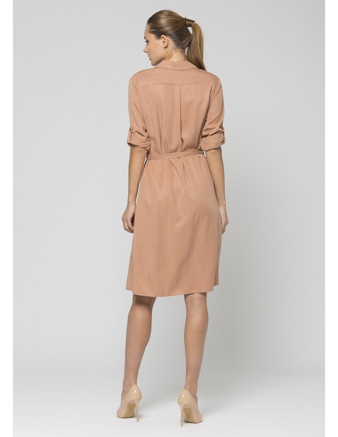 Vestido camisero con cuello solapa, botones centrales dorados y cinturón de tela.