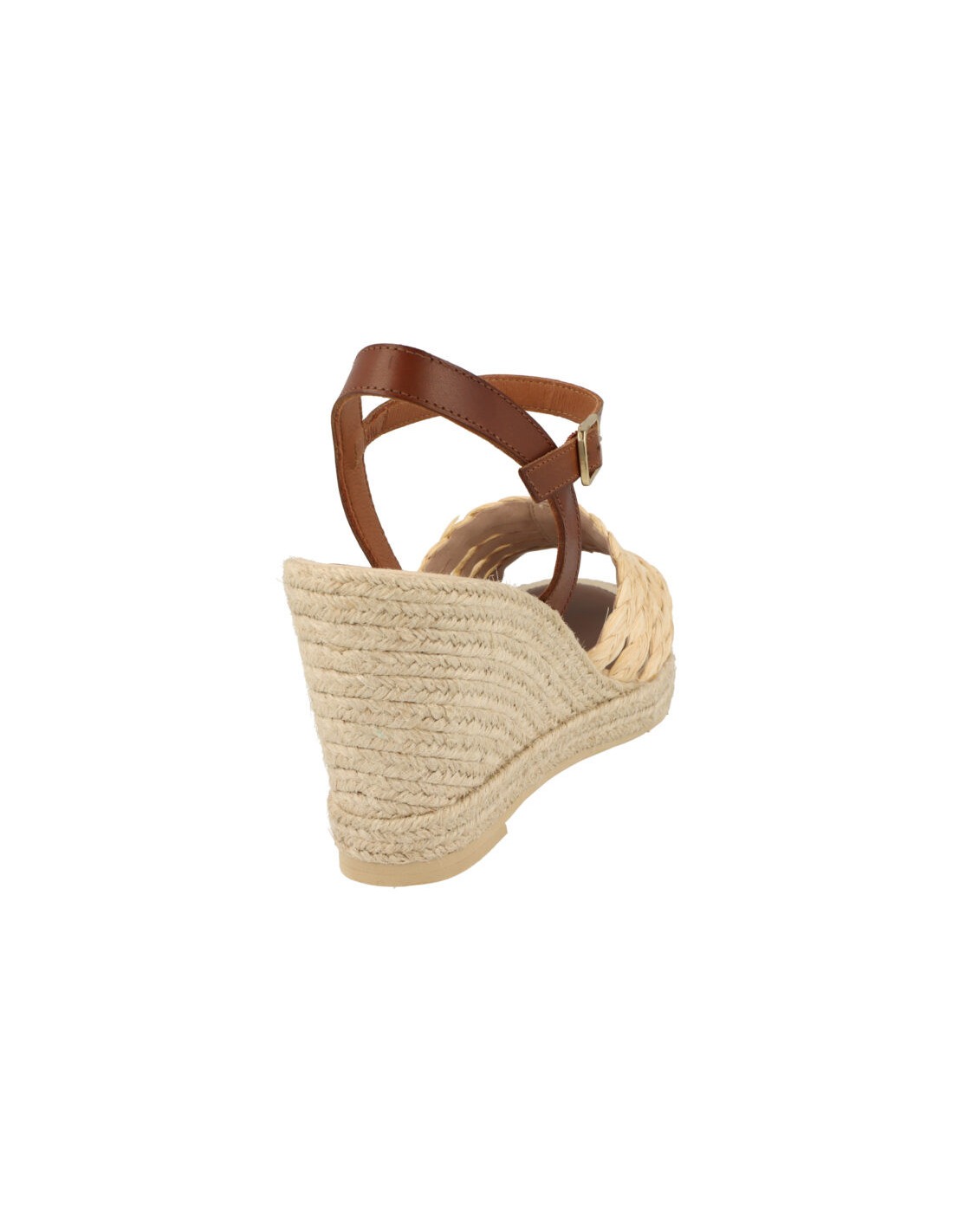 Parte superior rafia y piel– Suela de goma– Forro textil 100% piel– Altura plataforma en punta: 2,0 cm– Altura plataforma detrás: 8,00 cm