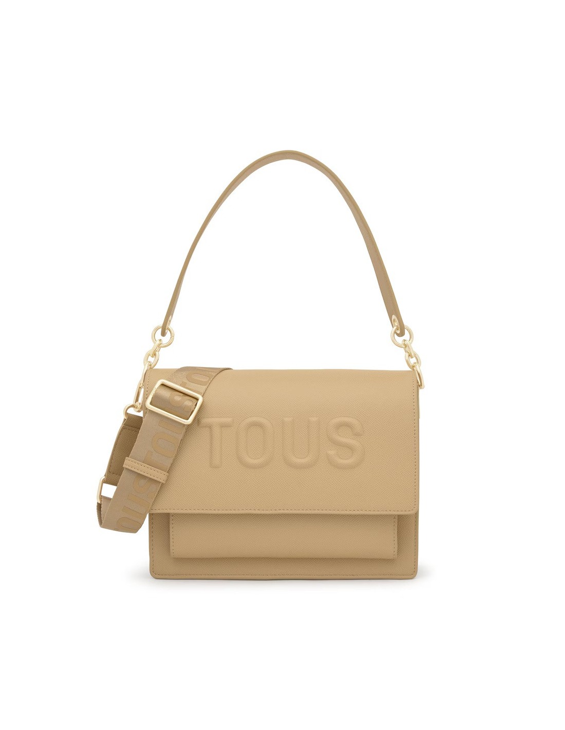 Bolso bandolera mediano Audree TOUS Brenda de poliuretano en color arena. Incorpora una solapa y cierre con dos botones magnéticos. Cuenta con dos compartimentos separados por uno con cremallera y un bolsillo abierto en la parte delantera. Asa de hombro fija y asa bandolera ajustable y desmontable. Medidas (alto x ancho x fondo): 19 x 25 x 11,5 cm