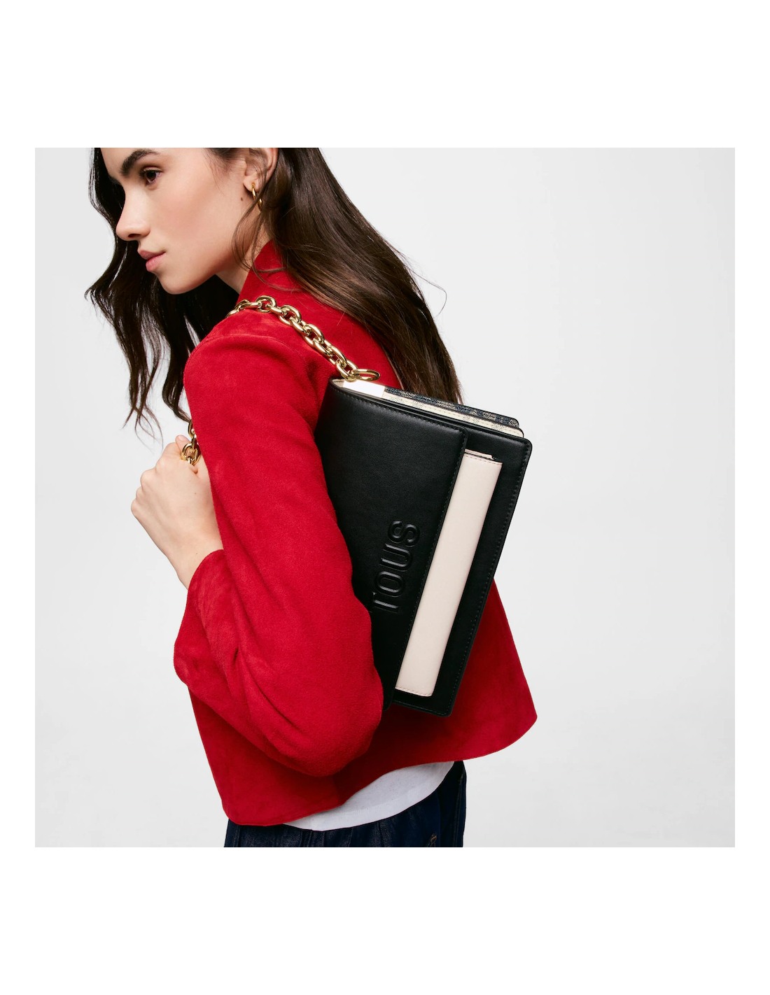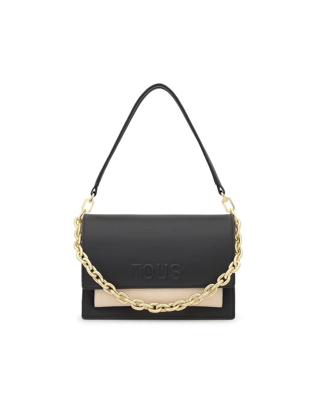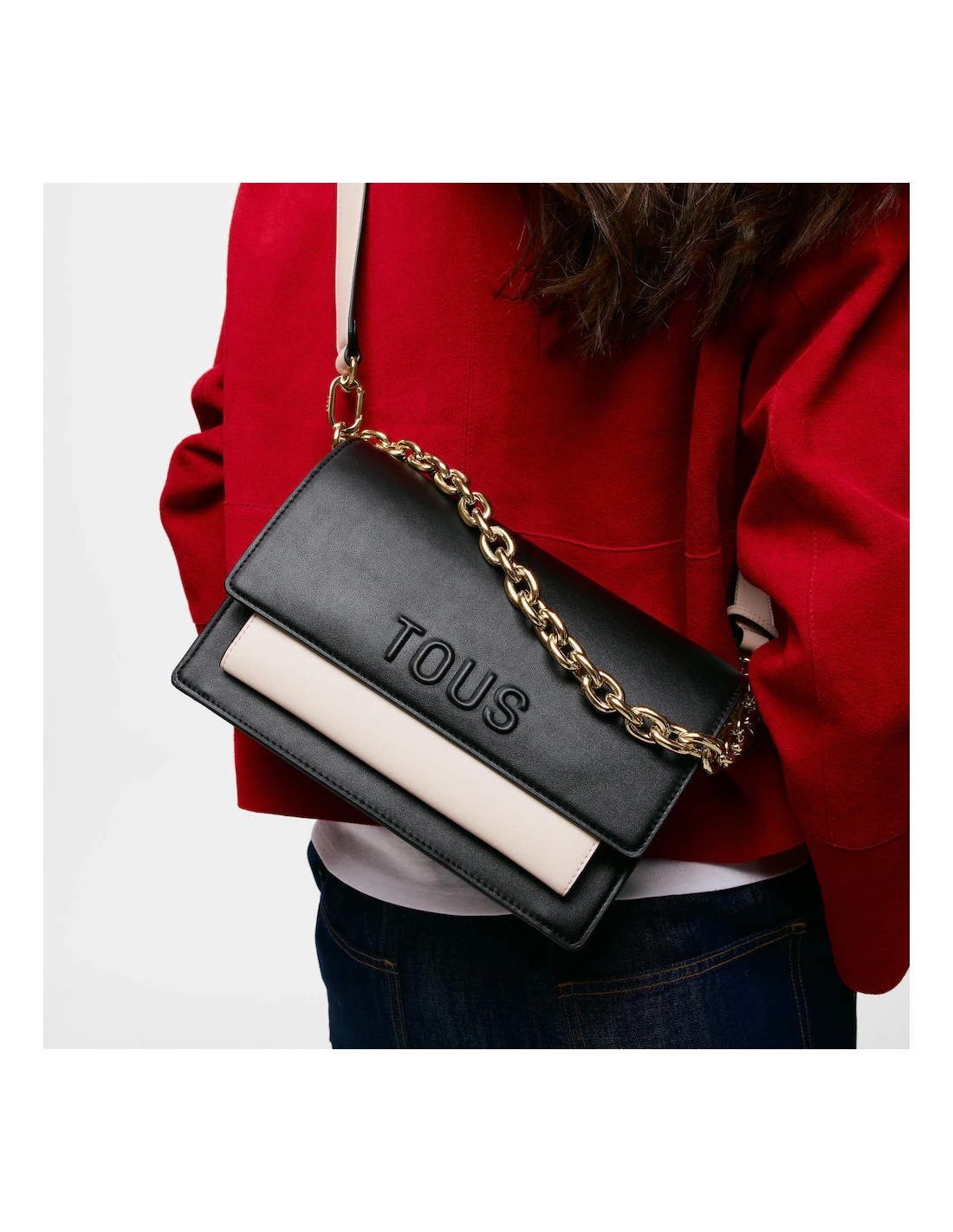 Bolso bandolera mediano Audree Kaos Icon de poliuretano y lona con estampado Kaos en color negro. Bolso con dos compartimentos separados por un bolsillo con cierre de cremallera y un bolsillo abierto en la parte delantera. Cierre de solapa con dos botones magnéticos. Asa de hombro fija y asa bandolera ajustable y extraíble. Medidas (alto x ancho x fondo): 16,5 x 25 x 11 cm.
