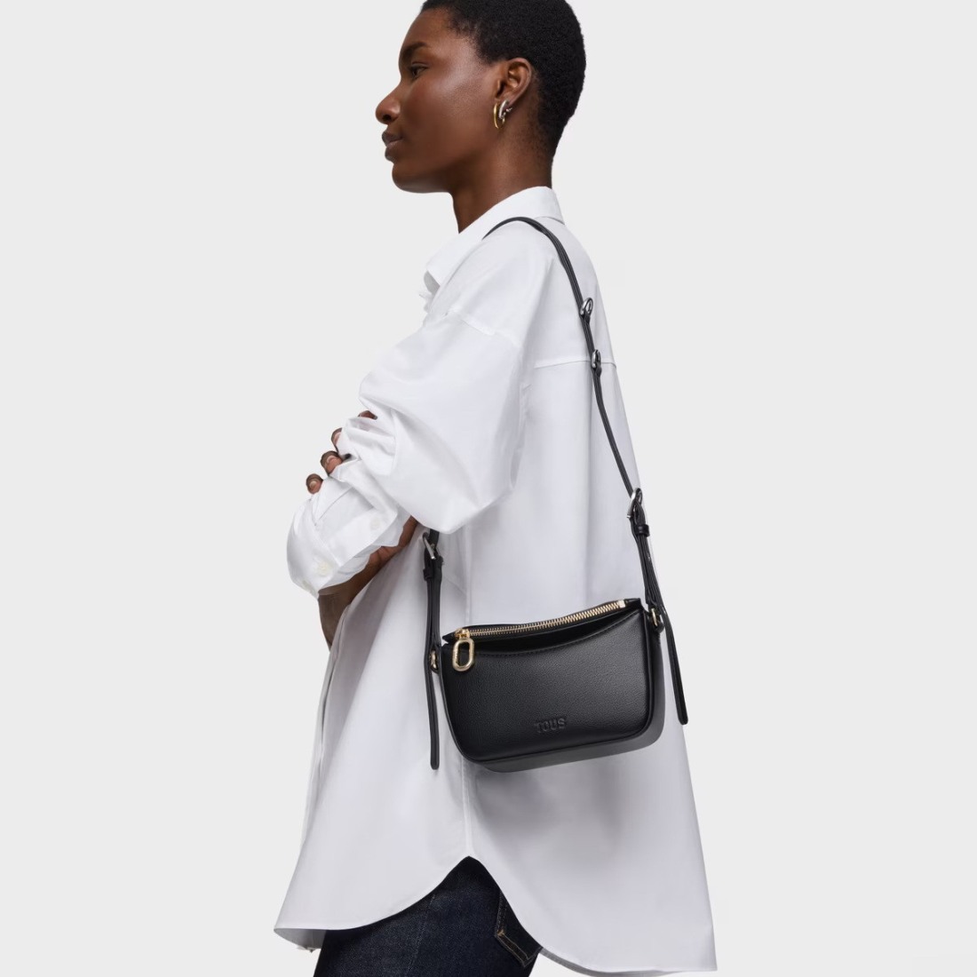 Bolso bandolera pequeño TOUS City de poliuretano. Cierre magnético. Asa bandolera ajustable y desmontable. Bolsillo exterior con cremallera. Medidas (alto x ancho x fondo): 12 x 20 x 9 cm.