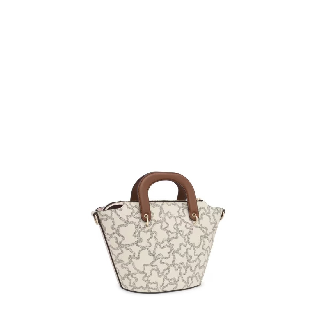 Bolso capazo pequeño de lona con detalles de poliuretano en color beige y estampado Kaos Icon. Cierre de cremallera. Bolsillo interior abierto. Asas de mano fijas y asa bandolera ajustable y desmontable. Medidas (alto x ancho x fondo): 21 x 37 x 12 cm.