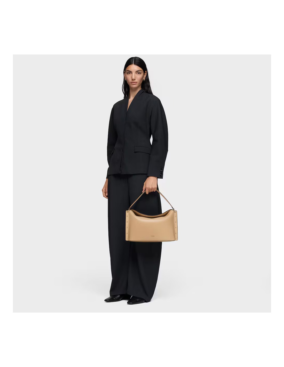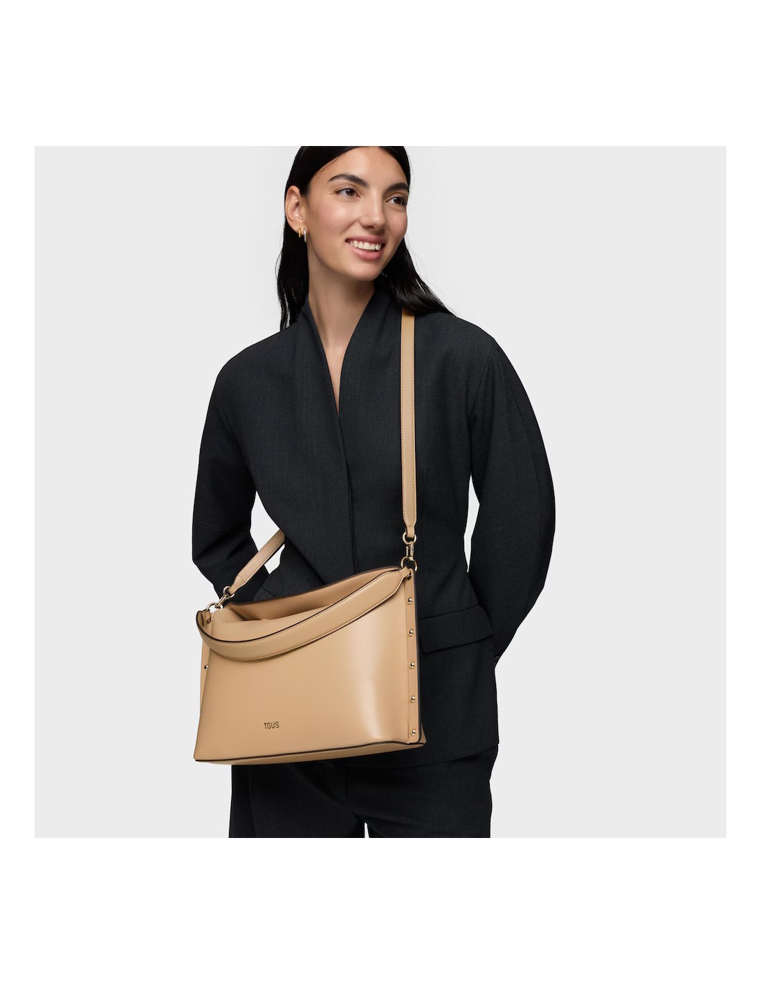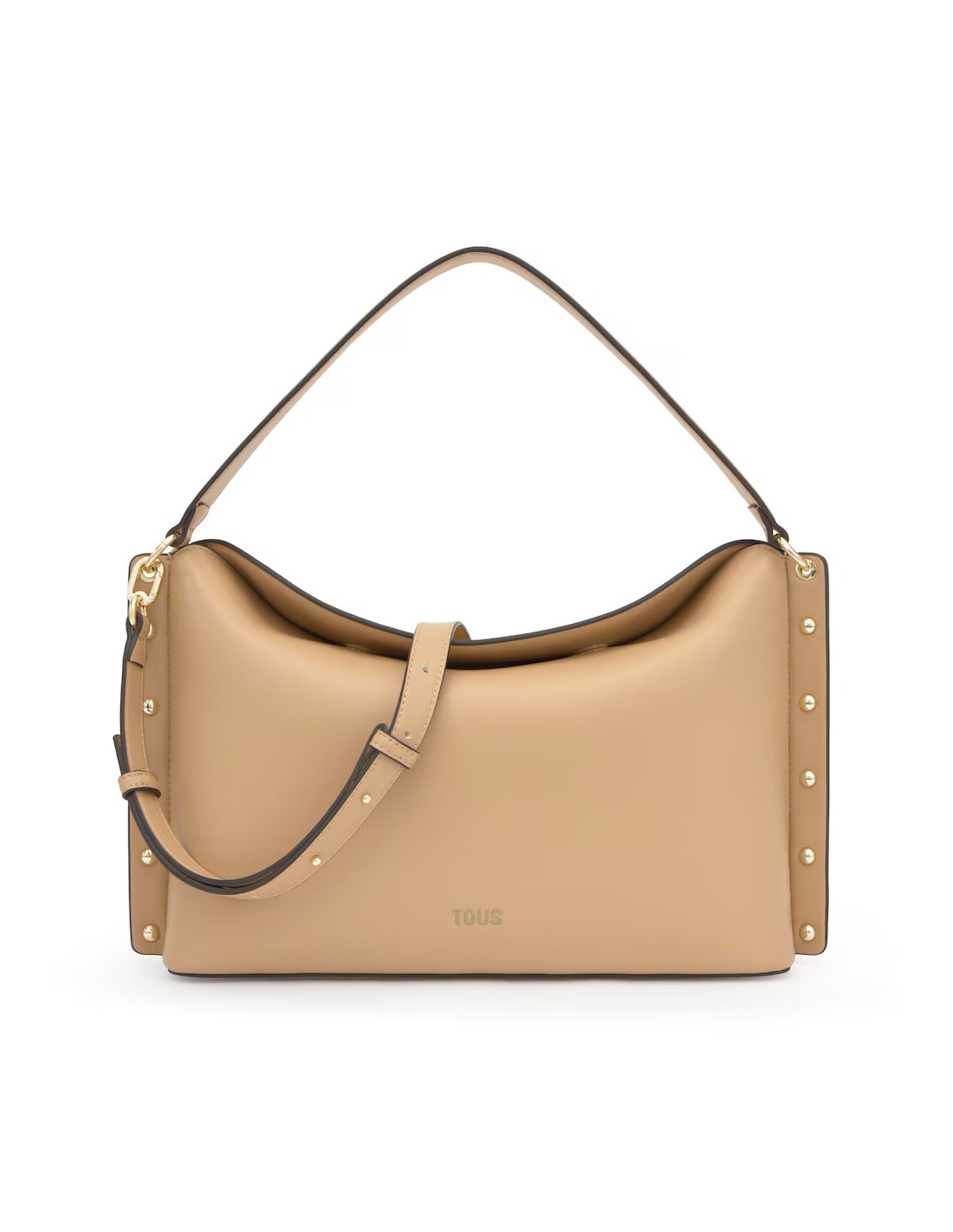 Bolso bandolera grande TOUS Jewelry Studs de poliuretano en color arena. Cierre de botón magnético. Bolsillo interior con cremallera. Asa de hombro fija y asa bandolera ajustable y extraible. Medidas (alto x ancho x fondo): 24 x 37 x 11 cm.