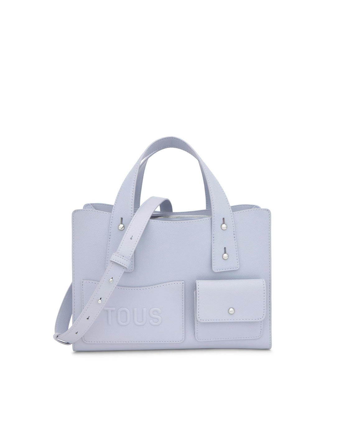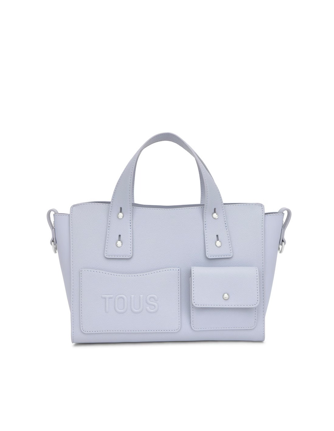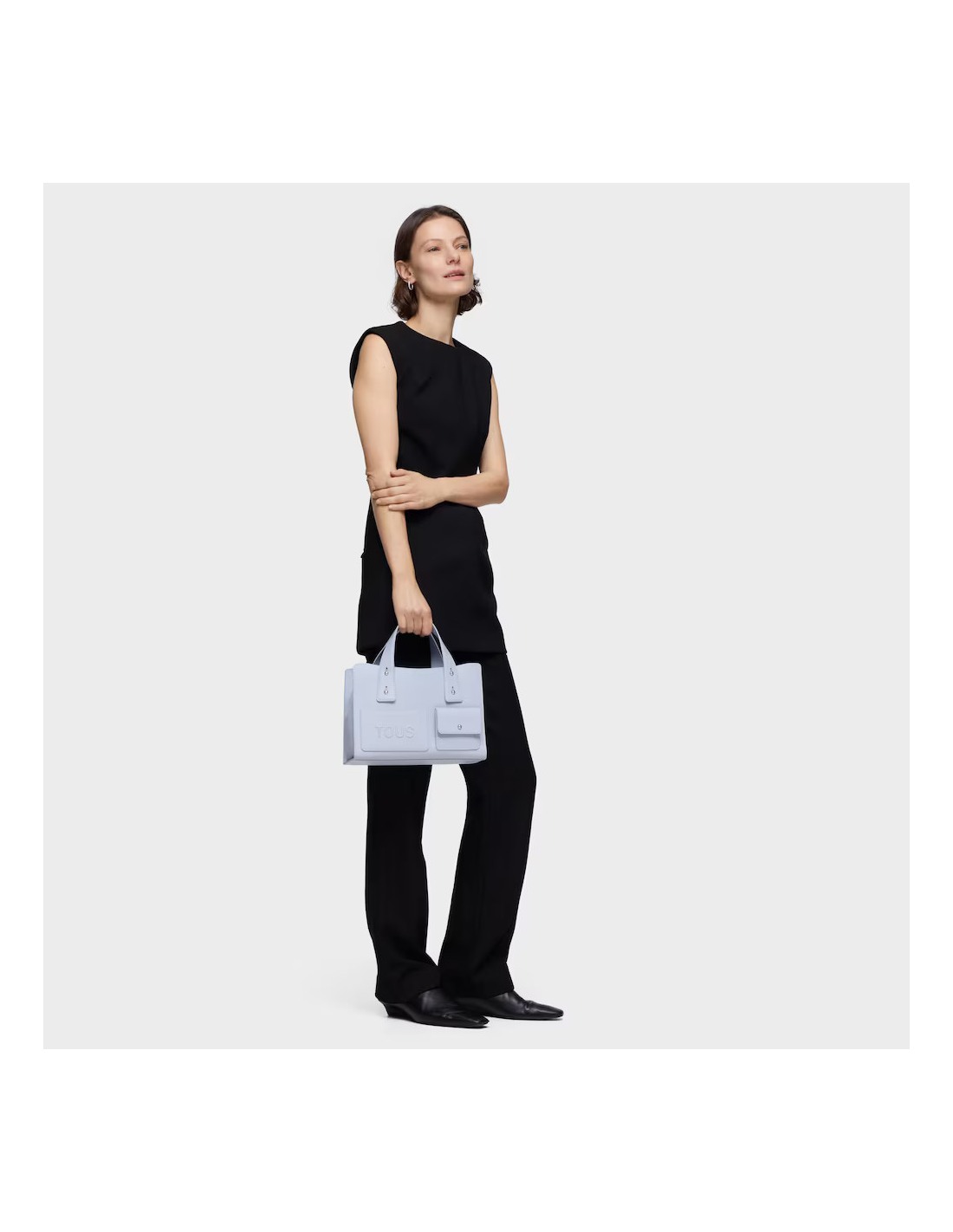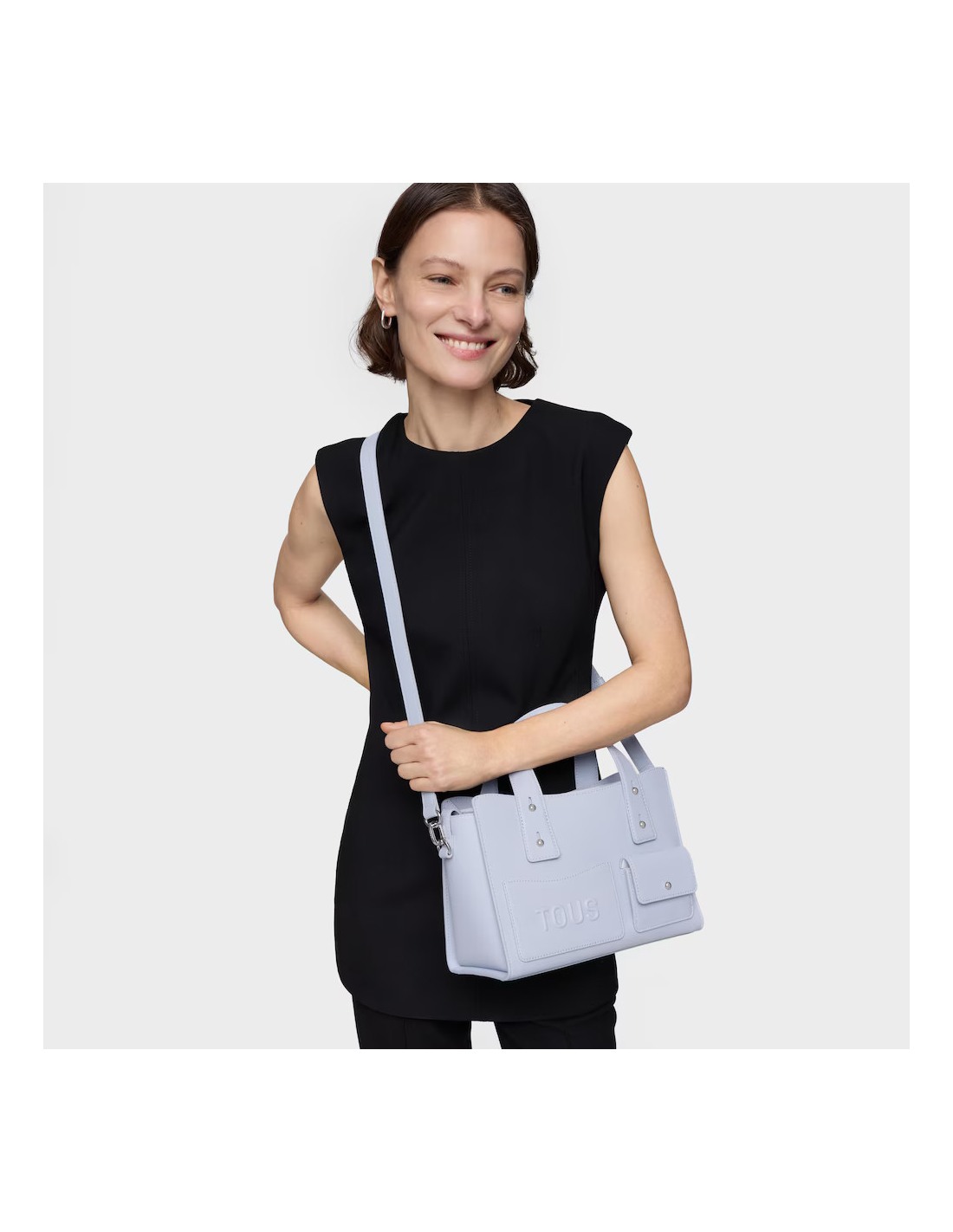 Bolso city mediano Back to basics de poliuretano en color azul grisaceo. Cierre con mosquetón central. Bolsillo interior con cremallera. Dos bolsillos exteriores. Asa fija de hombro. Medidas (alto x ancho x fondo): 15 x 33 x 20 cm.