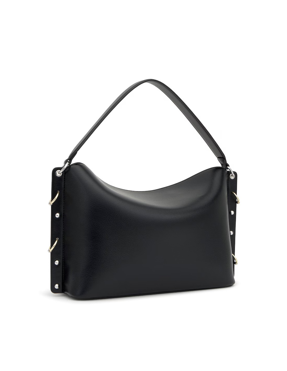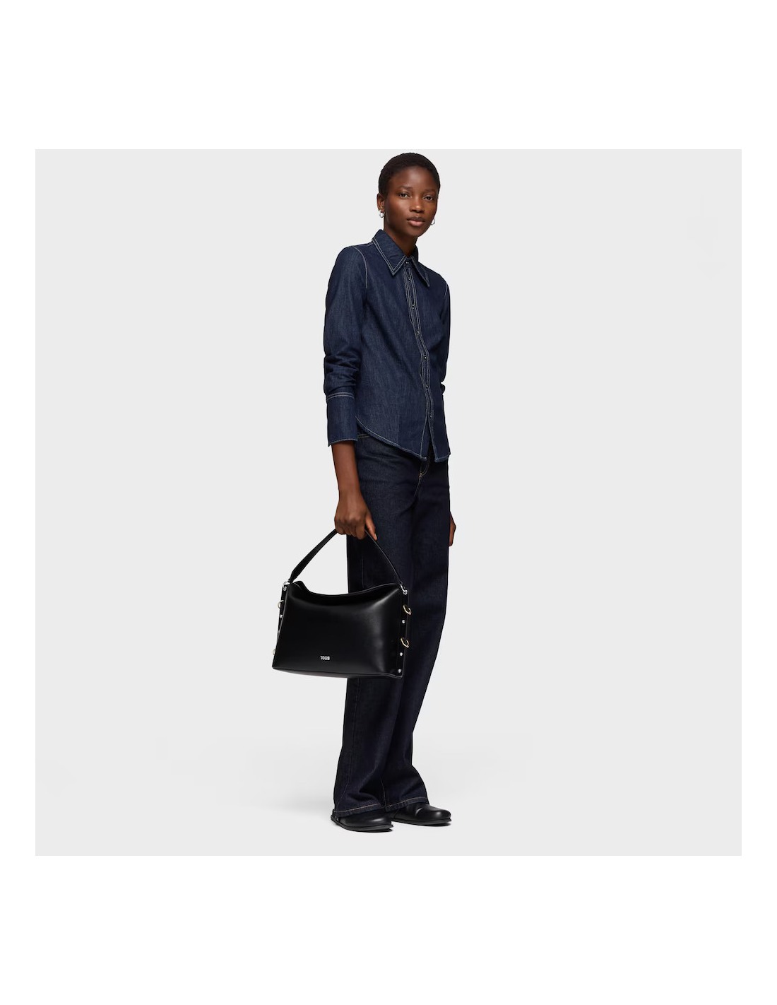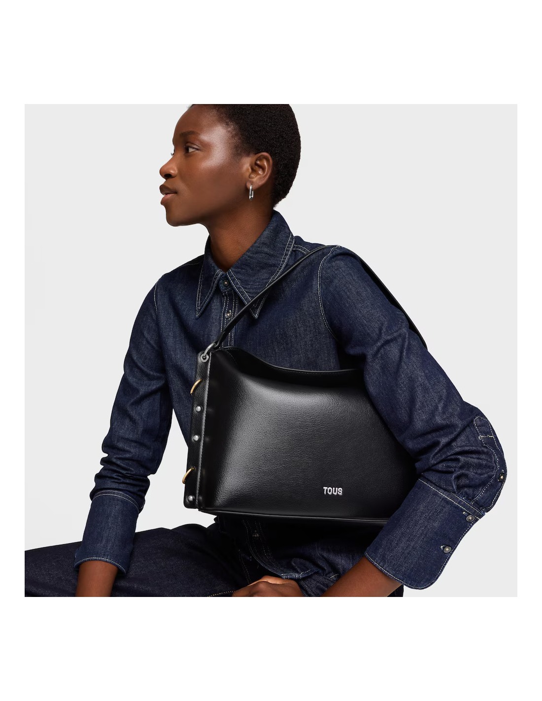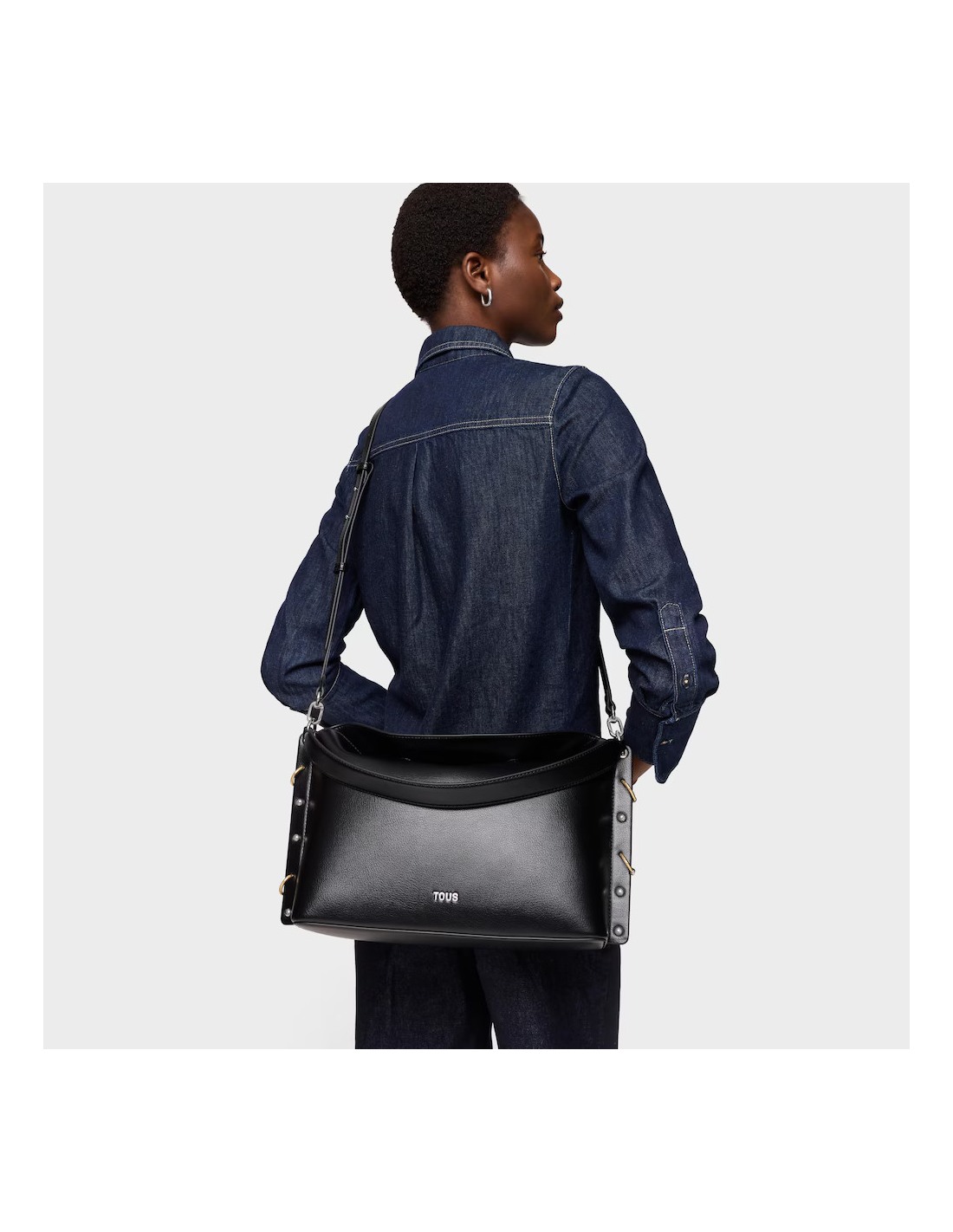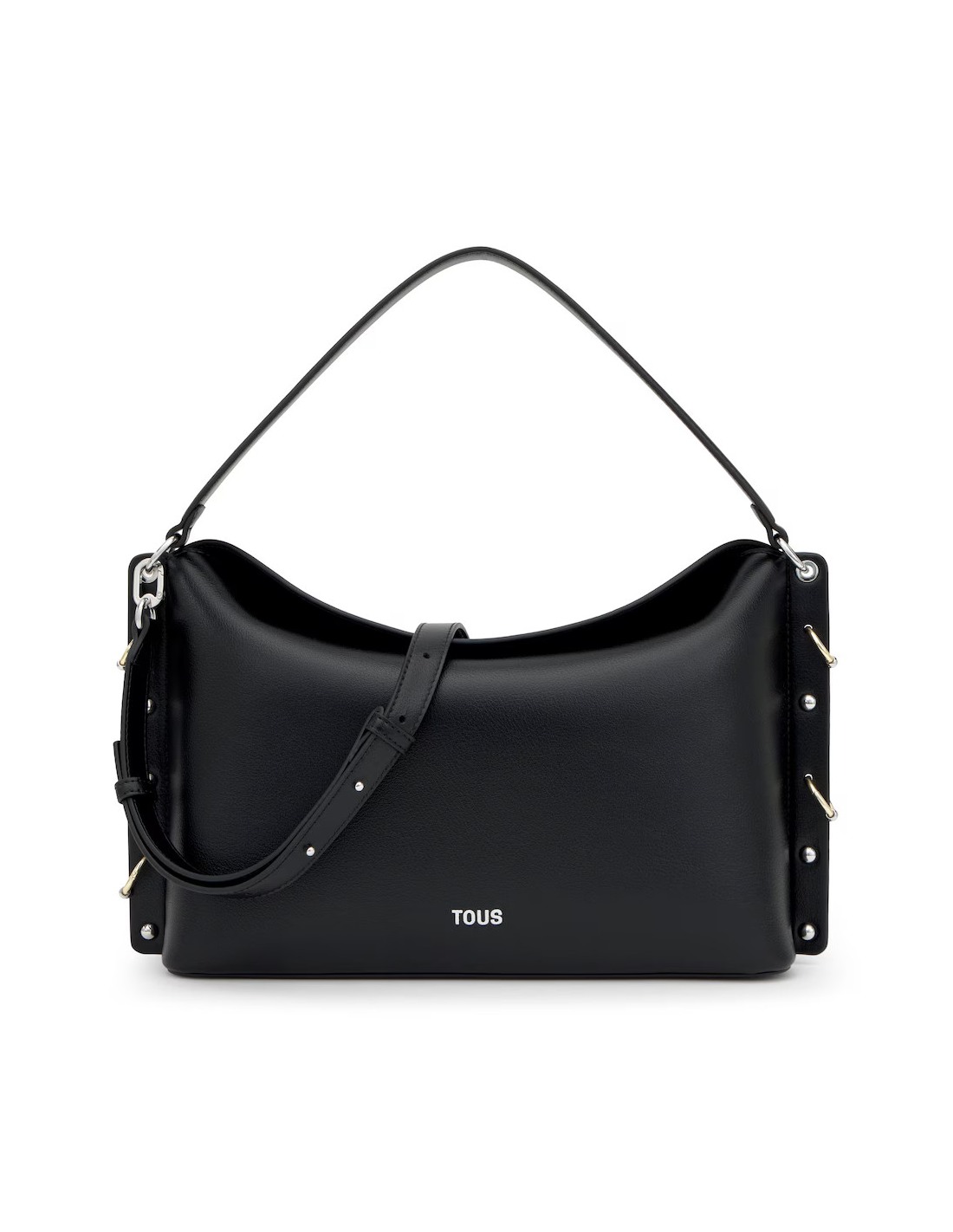 Bolso bandolera grande TOUS Jewelry Studs de poliuretano en color negro. Cierre de botón magnético. Bolsillo interior con cremallera. Asa de hombro fija y asa bandolera ajustable y extraible. Medidas (alto x ancho x fondo): 24 x 37 x 11 cm.