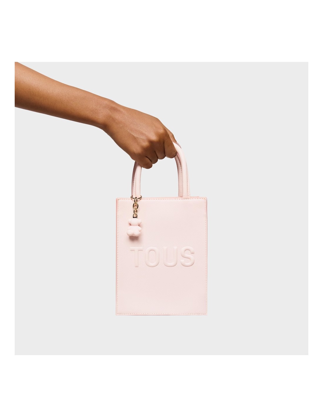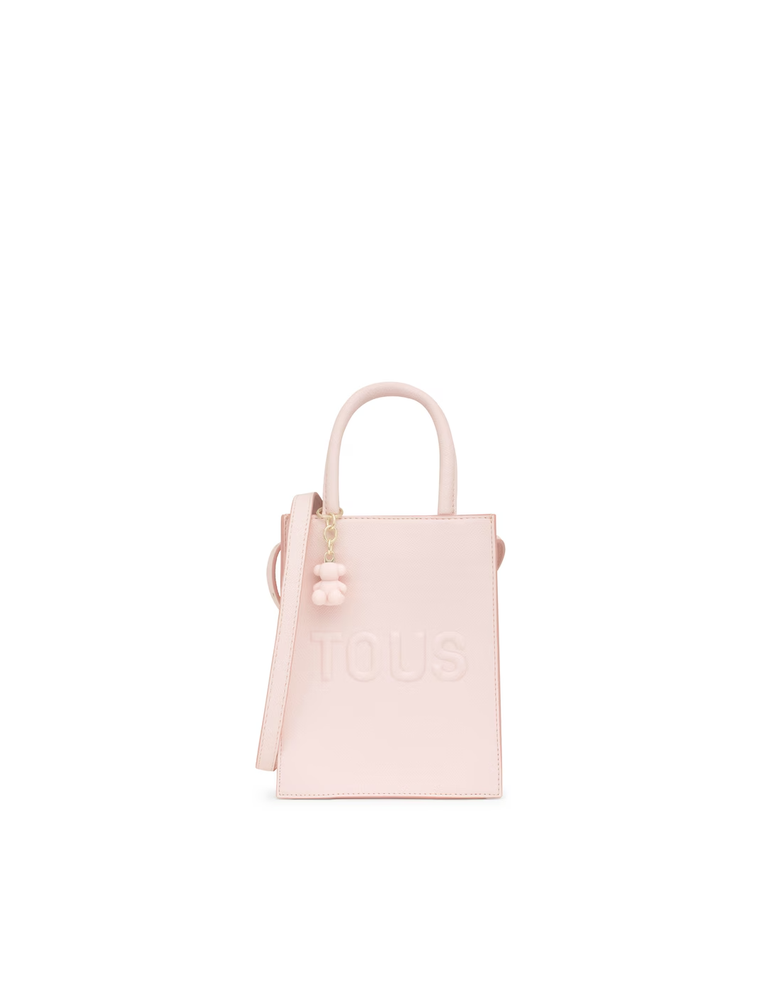 Minibolso Pop TOUS Brenda de poliuretano en color rosa claro. Cierre con botón magnético. Asas fijas de mano y asa bandolera ajustable y desmontable. Incorpora un bonito detalle de oso colgante. Medidas (alto x ancho x fondo): 20 x 16 x 7 cm.